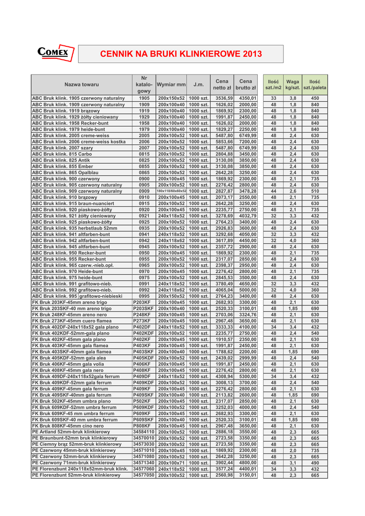 CENNIK NA BRUKI KLINKIEROWE 2013 Nazwa towaru ABC Bruk klink. 1905 czerwony naturalny ABC Bruk klink. 1909 czerwony naturalny ABC Bruk klink. 1919 brązowy ABC Bruk klink. 1929 żółty cieniowany ABC Bruk klink. 1958 Recker-bunt ABC Bruk klink. 1979 heide-bunt ABC Bruk klink. 2005 creme-weiss ABC Bruk klink. 2006 creme-weiss kostka ABC Bruk klink. 2007 szary ABC Bruk klink. 815 Carbo ABC Bruk klink. 825 Antik ABC Bruk klink. 855 Ember ABC Bruk klink. 865 Opalblau ABC Bruk klink. 900 czerwony ABC Bruk klink. 905 czerwony naturalny ABC Bruk klink. 909 czerwony naturalny ABC Bruk klink. 910 brązowy ABC Bruk klink. 915 braun-nuanciert ABC Bruk klink. 920 piaskowo-żółty ABC Bruk klink. 921 żółty cieniowany ABC Bruk klink. 925 piaskowo-żółty ABC Bruk klink. 935 herbstlaub 52mm ABC Bruk klink. 941 altfarben-bunt ABC Bruk klink. 942 altfarben-bunt ABC Bruk klink. 945 altfarben-bunt ABC Bruk klink. 950 Recker-bunt ABC Bruk klink. 955 Recker-bunt ABC Bruk klink. 965 czerw.-nieb.opł. ABC Bruk klink. 970 Heide-bunt ABC Bruk klink. 975 heide-bunt ABC Bruk klink. 991 grafitowo-nieb. ABC Bruk klink. 992 grafitowo-nieb. ABC Bruk klink. 995 grafitowo-nieb.52mm grafitowo-niebieski FK Bruk 203KF-45mm areno trigo FK Bruk 203SKF-40 mm areno trigo FK Bruk 248KF-45mm areno nero FK Bruk 273KF-45mm cuero flamea FK Bruk 402DF-240x118x52 gala plano FK Bruk 402KDF-52mm-gala plano FK Bruk 402KF-45mm gala plano FK Bruk 403KF-45mm gala flamea FK Bruk 403SKF-40mm gala flamea FK Bruk 405KDF-52mm gala alea FK Bruk 406KF-45mm gala volia FK Bruk 408KF-45mm gala nero FK Bruk 409DF-240x118x52gala ferrum FK Bruk 409KDF-52mm gala ferrum FK Bruk 409KF-45mm gala ferrum FK Bruk 409SKF-40mm gala ferrum FK Bruk 502KF-45mm umbra plano FK Bruk 609KDF-52mm umbra ferrum FK Bruk 609KF-45 mm umbra ferrum FK Bruk 609SKF-40 mm umbra ferrum FK Bruk 808KF-45mm cino nero PE Artland 52mm-bruk klinkierowy PE Braunbunt-52mm bruk klinkierowy PE Ciemny brąz 52mm-bruk klinkierowy PE Czerwony 45mm-bruk klinkierowy PE Czerwony 52mm-bruk klinkierowy PE Czerwony 71mm-bruk klinkierowy PE Florenzbunt 240x118x52mm-bruk klink. PE Florenzbunt 52mm-bruk klinkierowy Nr katalo- Wymiar mm gowy 1905 1909 1919 1929 1958 1979 2005 2006 2007 0815 0825 0855 0865 0900 0905 0909 0910 0915 0920 0921 0925 0935 0941 0942 0945 0950 0955 0965 0970 0975 0991 0992 0995 P203KF P203SKF P248KF P273KF P402DF P402KDF P402KF P403KF P403SKF P405KDF P406KF P408KF P409DF P409KDF P409KF P409SKF P502KF P609KDF P609KF P609SKF P808KF 34584110 34570010 34573030 34571010 34571080 34571340 34577060 34577050 200x150x52 200x100x40 200x100x40 200x100x40 200x100x40 200x100x40 200x100x52 200x100x52 200x100x52 200x100x52 200x100x52 200x100x52 200x100x52 200x100x45 200x100x52 180x118/60x60x52 200x100x45 200x100x52 200x100x45 240x118x52 200x100x52 200x100x52 240x118x52 240x118x62 200x100x52 200x100x45 200x100x52 200x100x52 200x100x45 200x100x52 240x118x52 240x118x62 200x150x52 200x100x45 200x100x40 200x100x45 200x100x45 240x118x52 200x100x52 200x100x45 200x100x45 200x100x40 200x100x52 200x100x45 200x100x45 240x118x52 200x100x52 200x100x45 200x100x40 200x100x45 200x100x52 200x100x45 200x100x40 200x100x45 200x100x52 200x100x52 200x100x52 200x100x45 200x100x52 200x100x71 240x118x52 200x100x52 J.m. 1000 szt. 1000 szt. 1000 szt. 1000 szt. 1000 szt. 1000 szt. 1000 szt. 1000 szt. 1000 szt. 1000 szt. 1000 szt. 1000 szt. 1000 szt. 1000 szt. 1000 szt. 1000 szt. 1000 szt. 1000 szt. 1000 szt. 1000 szt. 1000 szt. 1000 szt. 1000 szt. 1000 szt. 1000 szt. 1000 szt. 1000 szt. 1000 szt. 1000 szt. 1000 szt. 1000 szt. 1000 szt. 1000 szt. 1000 szt. 1000 szt. 1000 szt. 1000 szt. 1000 szt. 1000 szt. 1000 szt. 1000 szt. 1000 szt. 1000 szt. 1000 szt. 1000 szt. 1000 szt. 1000 szt. 1000 szt. 1000 szt. 1000 szt. 1000 szt. 1000 szt. 1000 szt. 1000 szt. 1000 szt. 1000 szt. 1000 szt. 1000 szt. 1000 szt. 1000 szt. 1000 szt. 1000 szt. Cena Cena netto zł brutto zł 3536,59 1626,02 1869,92 1991,87 1626,02 1829,27 5487,80 5853,66 5487,80 2804,88 3130,08 3130,08 2642,28 1869,92 2276,42 2827,87 2073,17 2642,28 2235,77 3278,69 2764,23 2926,83 3292,68 3617,89 2357,72 1869,92 2317,07 2398,37 2276,42 2845,53 3780,49 4065,04 2764,23 2682,93 2520,33 2703,06 2967,48 3333,33 2235,77 1910,57 1991,87 1788,62 2439,02 1991,87 2276,42 4308,94 3008,13 2276,42 2113,82 2317,07 3252,03 2682,93 2520,33 2967,48 2886,18 2723,58 2723,58 1869,92 2642,28 3902,44 3577,24 2560,98 4350,01 2000,00 2300,00 2450,00 2000,00 2250,00 6749,99 7200,00 6749,99 3450,00 3850,00 3850,00 3250,00 2300,00 2800,00 3478,28 2550,00 3250,00 2750,00 4032,79 3400,00 3600,00 4050,00 4450,00 2900,00 2300,00 2850,00 2950,00 2800,00 3500,00 4650,00 5000,00 3400,00 3300,00 3100,01 3324,76 3650,00 4100,00 2750,00 2350,00 2450,00 2200,00 2999,99 2450,00 2800,00 5300,00 3700,00 2800,00 2600,00 2850,00 4000,00 3300,00 3100,01 3650,00 3550,00 3350,00 3350,00 2300,00 3250,00 4800,00 4400,01 3150,01 Ilość Waga Ilość szt./m2 kg/szt. szt./paleta 33 48 48 48 48 48 48 48 48 48 48 48 48 48 48 44 48 48 48 32 48 48 32 32 48 48 48 48 48 48 32 32 48 48 48 48 48 34 48 48 48 48 48 48 48 34 48 48 48 48 48 48 48 48 48 48 48 48 48 48 34 48 3,8 1,8 1,8 1,8 1,8 1,8 2,4 2,4 2,4 2,4 2,4 2,4 2,4 2,1 2,4 2,6 2,1 2,4 2,1 3,3 2,4 2,4 3,3 4,0 2,4 2,1 2,4 2,4 2,1 2,4 3,3 4,0 2,4 2,1 1,85 2,1 2,1 3,4 2,4 2,1 2,1 1,85 2,4 2,1 2,1 3,4 2,4 2,1 1,85 2,1 2,4 2,1 1,85 2,1 2,3 2,3 2,3 2,0 2,3 3,1 3,3 2,3 450 840 840 840 840 840 630 630 630 630 630 630 630 735 630 510 735 630 735 432 630 630 432 360 630 735 630 630 735 630 432 360 630 630 690 630 630 432 540 630 630 690 540 630 630 432 540 630 690 630 540 630 690 630 665 665 665 735 665 490 432 665 Nazwa towaru PE Husum gelbbunt 52mm-bruk klinkierowy PE Nussbraun 52mm-bruk klinkierowy PE Penter gelbbunt 52mm-bruk klinkierowy PE Rotblaubunt 240x118x52mm-bruk klink. PE Rotblaubunt 45mm-bruk klinkierowy PE Rotblaubunt 52mm-bruk klinkierowy PE TITAN 52mm-bruk klinkierowy Bruk klinkierowy ANTIKA Bruk klinkierowy BORKUM Bruk klinkierowy DRESDEN Bruk klinkierowy DR