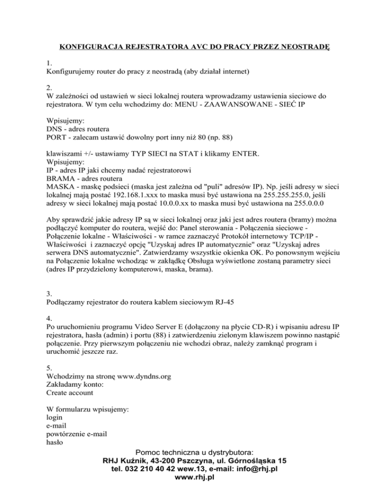 KONFIGURACJA REJESTRATORA AVC DO PRACY PRZEZ NEOSTRADĘ 1. Konfigurujemy router do pracy z neostradą (aby działał internet) 2. W zależności od ustawień w sieci lokalnej routera wprowadzamy ustawienia sieciowe do rejestratora. W tym celu wchodzimy do: MENU - ZAAWANSOWANE - SIEĆ IP Wpisujemy: DNS - adres routera PORT - zalecam ustawić dowolny port inny niż 80 (np. 88) klawiszami +/- ustawiamy TYP SIECI na STAT i klikamy ENTER. Wpisujemy: IP - adres IP jaki chcemy nadać rejestratorowi BRAMA - adres routera MASKA - maskę podsieci (maska jest zależna od "puli" adresów IP). Np. jeśli adresy w sieci lokalnej mają postać 192.168.1.xxx to maska musi być ustawiona na 255.255.255.0, jeśli adresy w sieci lokalnej mają postać 10.0.0.xx to maska musi być ustawiona na 255.0.0.0 Aby sprawdzić jakie adresy IP są w sieci lokalnej oraz jaki jest adres routera (bramy) można podłączyć komputer do routera, wejść do: Panel sterowania - Połączenia sieciowe Połączenie lokalne - Właściwości - w ramce zaznaczyć Protokół internetowy TCP/IP Właściwości i zaznaczyć opcję "Uzyskaj adres IP automatycznie" oraz "Uzyskaj adres serwera DNS automatycznie". Zatwierdzamy wszystkie okienka OK. Po ponowsnym wejściu na Połączenie lokalne wchodząc w zakłądkę Obsługa wyświetlone zostaną parametry sieci (adres IP przydzielony komputerowi, maska, brama). 3. Podłączamy rejestrator do routera kablem sieciowym RJ-45 4. Po uruchomieniu programu Video Server E (dołączony na płycie CD-R) i wpisaniu adresu IP rejestratora, hasła (admin) i portu (88) i zatwierdzeniu zielonym klawiszem powinno nastąpić połączenie. Przy pierwszym połączeniu nie wchodzi obraz, należy zamknąć program i uruchomić jeszcze raz. 5. Wchodzimy na stronę www.dyndns.org Zakładamy konto: Create account W formularzu wpisujemy: login e-mail powtórzenie e-mail hasło Pomoc techniczna u dystrybutora: RHJ Kuźnik, 43-200 Pszczyna, ul. Górnośląska 15 tel. 032 210 40 42 wew.13, e-mail: [email protected] www.rhj.pl powtórzenie hasła i zaznaczamy opcje: I agree to the AUP I will only create one free account Zatwierdzamy klawiszem Create Account 6. Na podany adres e-mail została wysłana wiadomość w której jest link aktywacyjny który należy kliknąć i następni zalogować się na swoje konto w dyndns.org Klikamy Services Dynamic DNS Create hosts W polu hostname wpisujemy wymyśloną przez siebie domenę i wybieramy końcówkę z rowzijanej listy. W polu IP Adress wpisujemy 1.1.1.1 Klikamy Create New Host Wylogowujemy się z dyndns.org 7. Łączymy się z rejestratorem (przez program Video Server E) Wchodzimy w zakładkę confuguracyjną (klawisz w prawym górnym rogu). Rozwijamy zakładkę Sieć Wchodzimy do DDNS Załączamy funkcję DDNS Wpisujemy Nazwę użytkownika (login do konta na dyndns.org) Hasło do w/w konta Domena utworzona na w/w koncie (np. mojadomena.dyndns.org) Nazwa systemu: dyndns Klikamy zastosuj. 8. Wchodzimy do konfiguracji routera i odnajdujemy funkcję DMZ. Załączamy tą funkcję i wpisujemy w niej adres IP przydzielony rejestratorowi (np. 192.168.1.xxx lub 10.0.0.xx) Jeśli router nie ma funkcji DMZ to należy odszukać funkcji VirtualServer i w niej wpisać: port start: ustawiony w rejestratorze port (np. 88) port end: ustawiony w rejestratorze port (np. 88) local IP: adres IP przydzielony rejestratorowi type: TCP/UDP lub Both Pomoc techniczna u dystrybutora: RHJ Kuźnik, 43-200 Pszczyna, ul. Górnośląska 15 tel. 032 210 40 42 wew.13, e-mail: [email protected] www.rhj.pl 9. Po zakończeniu w/w konfiguracji po ok. 3 - 5 min. rejestrator powinien być dostępny z zewnątrz (tj. z internetu). Wystarczy w zdalnym komputerze zainstalować program Video Server i wpisać parametry do połączenia (takie jak przy połączeniu przez sieć lokalną tylko w polu IP podajemy adres utworzonej domeny (np. mojadomena.dyndns.org) Aby sprawdzić działanie połączenia poprzez domenę należy skorzystać z innego łącza internetowego (połączenie przez domenę w sieci lokalnej najczęściej nie działa). Jeśli coś nie działa proszę zrestartować (ponownie uruchomić) router oraz rejestrator. UWAGA: opisy dotyczące poruszania się po ustawieniach w komputerze odnoszą się do systemu Windows XP. Pomoc techniczna u dystrybutora: RHJ Kuźnik, 43-200 Pszczyna, ul. Górnośląska 15 tel. 032 210 40 42 wew.13, e-mail: [email protected] www.rhj.pl