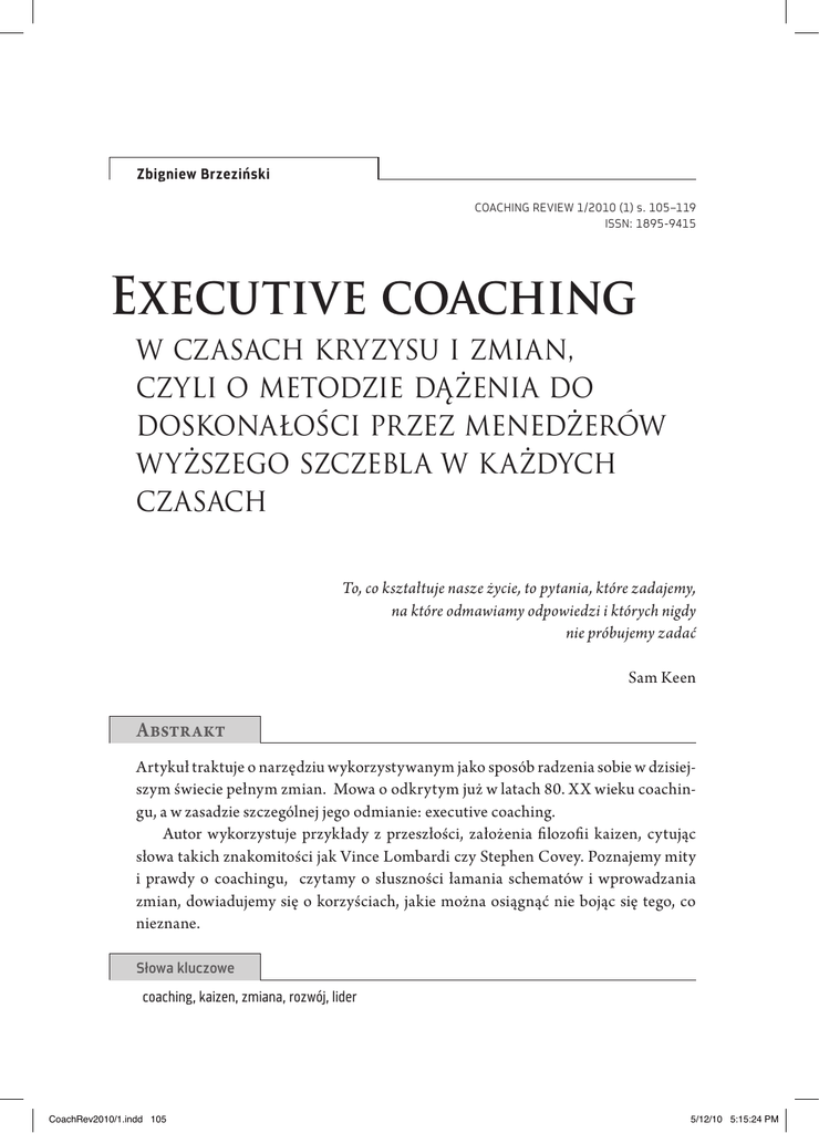 Z bigniew Brzeziƒski COACHING REVIEW 1/2010 (1) s. 105–119 ISSN: 1895-9415 Executive coaching w czasach kryzysu i zmian, czyli o metodzie dążenia do doskonałości przez menedżerów wyższego szczebla w każdych czasach To, co kształtuje nasze życie, to pytania, które zadajemy, na które odmawiamy odpowiedzi i których nigdy nie próbujemy zadać Sam Keen Abstrakt Artykuł traktuje o narzędziu wykorzystywanym jako sposób radzenia sobie w dzisiejszym świecie pełnym zmian. Mowa o odkrytym już w latach 80. XX wieku coachingu, a w zasadzie szczególnej jego odmianie: executive coaching. Autor wykorzystuje przykłady z przeszłości, założenia filozofii kaizen, cytując słowa takich znakomitości jak Vince Lombardi czy Stephen Covey. Poznajemy mity i prawdy o coachingu, czytamy o słuszności łamania schematów i wprowadzania zmian, dowiadujemy się o korzyściach, jakie można osiągnąć nie bojąc się tego, co nieznane. Słowa kluczowe coaching, kaizen, zmiana, rozwój, lider CoachRev2010/1.indd 105 5/12/10 5:15:24 PM 106 Coaching R eview Nieoptymistyczny początek „Obyś żył w ciekawych czasach”. To chińskie przekleństwo sprawdza się po raz kolejny. Rzeczywiście żyjemy w „ciekawych” czasach; w czasach trudnych, turbulentnym otoczeniu, w czasach wymagań wyższych niż kiedykolwiek dotąd. Wymagania – coraz wyższe, niejednokrotnie niemożliwe do sprostania – stawia się wszystkim: dzieciom, młodzieży, menedżerom; coraz większe i coraz więcej. Ostatnio zaobserwować można trend skracania kadencji prezesów. To właśnie wynik m.in. wspomnianego wzrostu wymagań. Trudno się zresztą dziwić nadzorowi właścicielskiemu. Dziś, w dobie morderczej wręcz konkurencji, oczekiwania wobec zarządzających są tak wysokie, że niejednokrotnie nie tyle odwoływani są przez rady nadzorcze, ile sami podejmują decyzję o odejściu. Od lat 90. ubiegłego stulecia czas, jaki prezes korporacji poświęca na swoje obowiązki, skrócił się diametralnie. W wielu firmach odejść musieli nawet ci, których dotychczas uważano za biznesowe gwiazdy. To pokazuje, że nikt nie jest nie do zastąpienia i sprawdza się w każdych warunkach. Zmiana ma to do siebie, że nie toleruje rutyny i powtarzalności. Ci, którzy sprawdzają się w uporządkowanym otoczeniu, przestają nagle radzić sobie, gdy trzeba wprowadzić zmiany. Są hunterzy i farmerzy; stosujący partnerski albo paramilitarny styl zarządzania. Możliwości są tysiące i nie zawsze samemu łatwo podjąć decyzję, z której ścieżki skorzystać, albo też brakuje kompetencji pozwalającej na zmianę sposobu działania. Ale – jak z większości sytuacji – i tu można znaleźć wyjście. Nie jest ono panaceum na wszystko, niemniej jednak – odpowiednio zastosowane – zwiększa prawdopodobieństwo, że sytuacja w organizacji zacznie się zmieniać. Światełko w tunelu Przyglądając się różnego rodzaju organizacjom, zaobserwować można niepokojące zjawisko. Uwydatnia się ono szczególnie wyraźnie w czasach kryzysu i zmian. Chodzi nie tylko o to, że często w pierwszej kolejności ograniczane (a nawet likwidowane) są wydatki na rozwój ludzi, ale im wyżej w strukturze organizacyjnej, tym częściej się o nim zapomina. Menedżerowie wyższego szczebla wychodzą za założenia, że przeszli już przez taką liczbę szkoleń, ukończyli studia Executive MBA na najlepszych światowych uczelniach i dysponują takim bagażem doświadczeń, że dalszy rozwój jest jedynie stratą czasu, który z powodzeniem wykorzystać można na inne działania. Nie stanowią oni co prawda 100% populacji, ale – niestety – jest to przytłaczająca większość. Oprócz, być może, sporadycznego uczestnictwa w dużej konferencji z udziałem światowego lidera (które to uczestnictwo jest bardziej traktowane jako spotkanie towarzyskie i chęć pokazania się w „odpowiednim” miejscu), nie robią zupełnie nic w kwestii własnego rozwoju. A jak powiedział kiedyś Peter F. Drucker, żeby zarządzać innymi, trzeba najpierw umieć zarządzać sobą. Idąc dalej i parafrazując tę CoachRev2010/1.indd 106 5/12/10 5:15:24 PM E xecutive coaching w czasach kryzysu i zmian czyli o metodzie dÑ˚enia do doskonałoÂci... 107 myśl, można powiedzieć, że nie da się zadbać o rozwój innych, jeśli nie dba się o swój własny. A to przecież zarządzający organizacjami faktycznie decydują o rozwoju swoich podwładnych. Zawsze jednak można znaleźć uzasadnienie, dlaczego akurat teraz nie jest najlepszy moment na rozwój. A kryzys temu sprzyja, bo na jego karb zrzucić można dokładnie wszystko i jest to niezwykle łatwe. A gdy jest dobrze, to z kolei mówi się o tym, że teraz nie jest właściwy moment. W jednej z dużych spółek z branży IT z naszego regionu, od kilku lat w kwestiach rozwojowych nie dzieje się praktycznie nic. Zarządzający uważają bowiem, że jest dobrze, a ludzie są na tyle kompetentni, że inwestowanie w ich rozwój jest stratą czasu i pieniędzy. A jeśli już coś robić, to własnymi siłami. W końcu od czego jest dział HR? I problemy pogłębiają się. Jakość usług związanych z rozwojem spadła bardzo przez ostatnie lata. Jest to związane z podejmowaniem się roli trenerów, coachów i konsultantów przez osoby bez odpowiedniego przygotowania, biznesowego i życiowego doświadczenia, a co najważniejsze, talentu, który pozwalałby wziąć odpowiedzialność za rozwój innych. Nie dziwi w takim razie fakt, że wielu decydentów zraziło się do tradycyjnych form rozwoju, takich jak szkolenia, bo nie widzą ich wymiernych efektów (często też na własne życzenie, bo przecież szkolenie nie kończy się z chwilą opuszczenia sali szkoleniowej, a jego kontynuacja musi odbywać się już w miejscu pracy). Dlatego sami też nie widzą potrzeby inwestycji w siebie, bo w dotychczasowe „rozwiązania edukacyjne” po prostu nie wierzą. Czy istnieje zatem sposób, aby