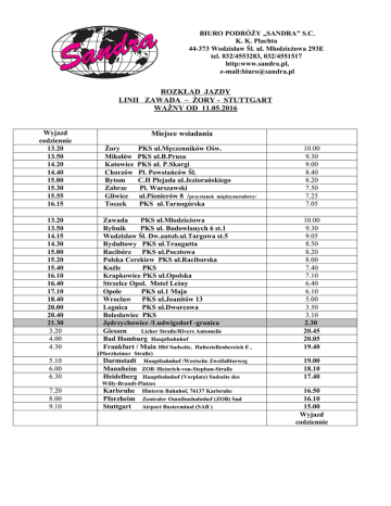 ŻORY - STUTTGART WAŻNY OD 11.05.2016 Miejsce wsiadania
