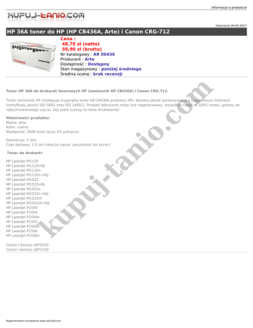 Informacje o produkcie Utworzono 04-03-2017 HP 36A toner do HP (HP CB436A, Arte) i Canon CRG-712 Cena : 48,70 zł (netto) 59,90 zł (brutto) io .c om Nr katalogowy : AR 00436 Producent : Arte Dostępność : Dostępny Stan magazynowy : poniżej średniego Średnia ocena : brak recenzji Toner HP 36A do drukarek laserowych HP (zamiennik HP CB436A) i Canon CRG-712. Toner zamiennik HP (zastępuje oryginalny toner HP CB436A produkcji HP). Wysoka jakość porównywalna z oryginalnymi tonerami (certyfikaty jakości ISO 9001 oraz ISO 14001). Produkt fabrycznie nowy (nie regenerowany, wszystkie części w 100% nowe), gotowy do natychmiastowego użycia. Daj sobie szansę na tanie drukowanie! Właściwości produktu: Marka: Arte Kolor: czarny Wydajność: 2000 stron (przy 5% pokryciu) an Gwarancja: 2 lata Czas dostawy: 1-2 dni robocze (opcje: paczkomat lub kurier) uj ku p HP LaserJet M1120 HP LaserJet M1120mfp HP LaserJet M1120n HP LaserJet M1120n mfp HP LaserJet M1522 HP LaserJet M1522mfp HP LaserJet M1522n HP LaserJet M1522n mfp HP LaserJet M1522nf HP LaserJet M1522nf mfp HP LaserJet P1500 HP LaserJet P1504 HP LaserJet P1504n HP LaserJet P1505 HP LaserJet P1505n HP LaserJet P1506 HP LaserJet P1506n -t Toner do drukarki: Canon i-Sensys LBP3010 Canon i-Sensys LBP3100 Wygenerowano w programie www.oscGold.com