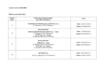 oznaczenie sprawy 12/U/2011 Zbiorcze zestawienie ofert Numer oferty Firma (nazwa) lub nazwisko oraz adres wykonawcy Cena 1. Przedsiębiorstwo WielobranŜowe „LECH” Sp. z o.o. ul. Smoleńska 1a, 85-833 Bydgoszcz Netto: 36.951.273,58 zł Brutto: 45.450.066,50 zł Konsorcjum firm: 2. EIFFAGE BUDOWNICTWO MITEX S.A. – Lider ul. Postępu 5A, 02-676 Warszawa AGTES Sp. z o.o. – Partner ul. Puławska 300A, 02-819 Warszawa Netto: 32.706.491,68 zł Brutto: 40.228.984,77 zł Konsorcjum firm: 3. 4. ERBUD S.A. – Lider ul. Puławska 300A, 02-819 Warszawa MCX Sp. z o.o. – Partner ul. Gotarda 9, 02-683 Warszawa Netto: 30.034.657,59 zł SKANSKA S.A. Netto: 28.341.586,85 zł ul. Gen. J. Zajączka 9; 01-518 Warszawa Brutto: 34.860.151,82 zł Brutto: 36.942.628,84 zł 5. Konsorcjum firm: Mostostal Warszawa S.A. – Lider ul. Konstruktorska 11A; 02-673 Warszawa FIRMA ATLINE Spółka Jawna Sławomir Pruski - Partner 6. Konsorcjum firm: Przedsiębiorstwo Budowlano-Usługowe „BUDOPOL” Spółka Akcyjna - Lider ul. Fordońska 199, 85-739 Bydgoszcz Przedsiębiorstwo Produkcyjno – Usługowe „TELARM” Ferdynand Rzóska – Partner ul. Morska 8, 85-722 Bydgoszcz 7. Przedsiębiorstwo Budowlano-Usługowo-Handlowe „AGAT” Sp. z o.o. ul. Domaszowska 106, 25-150 Kielce 8. Konsorcjum firm: Fadbet S.A. – Lider ul. 27 Lipca 60, 15-182 Białystok Centrum Informatyki „ZETO” S.A. – Uczestnik ul. Skorupska 9, 15-048 Białystok 9. Konsorcjum firm: Polimex- Mostostal S.A. – Lider ul. Czackiego 15/17, 00-950 Warszawa KenBIT Sp. j. – Partner ul. śytnia 15, 01-014 Warszawa Netto: 27.203.251,31 zł Brutto: 33.459.999,11 zł Netto: 27.848.862,46 zł Brutto: 34.254.100,83 zł Netto: 33.308.925,82 zł Brutto: 40.969.978,76 zł Netto: 31.547.206,50 zł Brutto: 38.803.064,00 zł Netto: 28.150.503,64 zł Brutto: 34.625.119,48 zł Konsorcjum firm: 10. Przedsiębiorstwo Budowlano - Usługowe „DORBUD” S.A. – Lider ul. Zagnańska 153, 25-563 Kielce PPHU CONTACT O/K Sp. z o.o. ul. Piwowarska 28, 25-561 Kielce Netto: 33.940.242,60 zł Brutto: 41.746.498,40 zł Konsorcjum firm: 11. Przedsiębiorstwo Robót InŜynieryjnych „POL – AQUA” S.A. – Lider ul. Dworska 1, 05-500 Piaseczno Przedsiębiorstwo „AGAT” S.A. – Partner ul. Paderewskiego 1, 95-040 Koluszki Netto: 33.358.739,24 zł Brutto: 41.031.249,27 zł Konsorcjum firm: 12. Pamar Sp. z o.o. – Lider ul. Palisadowa 20, 01-940 Warszawa Przedsiębiorstwo Budowlano-MontaŜowe śAK-ZIB – Członek ul. Palisadowa 20/22, 01-940 Warszawa PIB UNI – SAN – Członek ul. Alzacka 1, 01-940 Warszawa Netto: 30.707.039,17 zł Brutto: 37.769.658,18 zł ................................................................. (podpis osoby sporządzającej zestawienie)
