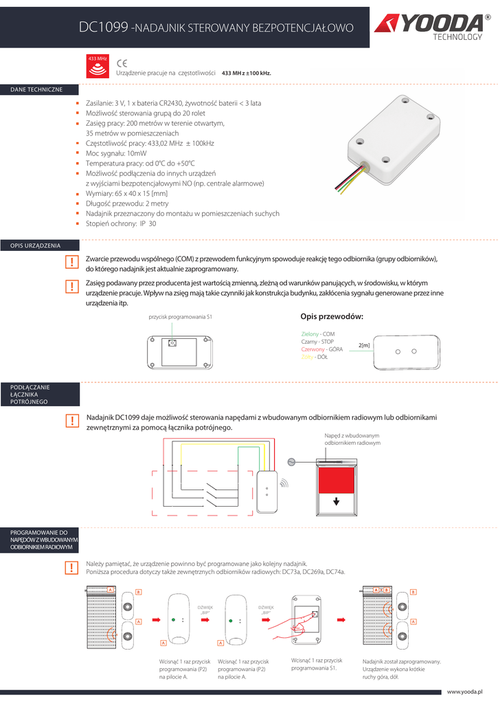 DC1099 -NADAJNIK STEROWANY BEZPOTENCJAŁOWO 433 MHz Urządzenie pracuje na częstotliwości 433 MH z ±100 kHz. DANE TECHNICZNE Zasilanie: 3 V, 1 x bateria CR2430, żywotność baterii < 3 lata Możliwość sterowania grupą do 20 rolet Zasięg pracy: 200 metrów w terenie otwartym, 35 metrów w pomieszczeniach Częstotliwość pracy: 433,02 MHz ± 100kHz Moc sygnału: 10mW Temperatura pracy: od 0°C do +50°C Możliwość podłączenia do innych urządzeń z wyjściami bezpotencjałowymi NO (np. centrale alarmowe) Wymiary: 65 x 40 x 15 [mm] Długość przewodu: 2 metry Nadajnik przeznaczony do montażu w pomieszczeniach suchych Stopień ochrony: IP 30 OPIS URZĄDZENIA Zwarcie przewodu wspólnego (COM) z przewodem funkcyjnym spowoduje reakcję tego odbiornika (grupy odbiorników), do którego nadajnik jest aktualnie zaprogramowany. Zasięg podawany przez producenta jest wartością zmienną, zleżną od warunków panujących, w środowisku, w którym urządzenie pracuje. Wpływ na zsięg mają takie czynniki jak konstrukcja budynku, zakłócenia sygnału generowane przez inne urządzenia itp. Opis przewodów: przycisk programowania S1 Zielony - COM Czarny - STOP Czerwony - GÓRA Żółty - DÓŁ 2[m] PODŁĄCZANIE ŁĄCZNIKA POTRÓJNEGO Nadajnik DC1099 daje możliwość sterowania napędami z wbudowanym odbiornikiem radiowym lub odbiornikami zewnętrznymi za pomocą łącznika potrójnego. Napęd z wbudowanym odbiornikiem radiowym PROGRAMOWANIE DO NAPĘDÓW Z WBUDOWANYM ODBIORNIKIEM RADIOWYM Należy pamiętać, że urządzenie powinno być programowane jako kolejny nadajnik. Poniższa procedura dotyczy także zewnętrznych odbiorników radiowych: DC73a, DC269a, DC74a. A + B DŹWIĘK „BIP” Wcisnąć 1 raz przycisk programowania (P2) na pilocie A. DŹWIĘK „BIP” Wcisnąć 1 raz przycisk programowania (P2) na pilocie A. Wcisnąć 1 raz przycisk programowania S1. Nadajnik został zaprogramowany. Urządzenie wykona krótkie ruchy góra, dół. www.yooda.pl DC1099 -NADAJNIK STEROWANY BEZPOTENCJAŁOWO PROGRAMOWANIE DO ODBIORNIKÓW PROGRAMOWANIE DO RADIOWYCH ODBIORNIKÓW ZINTEGROWANYCH SERII CAMELEO Z PRZEŁĄCZNIKIEM Dłuższa niż 10 sekund przerwa, między kolejnymi wciśnięciami przycisku, spowoduje automatyczne wyjście bez zapisywania wprowadzonych zmian. OK Nadajnik został zapisany w pamięci Włączyć zasilanie Wcisnąć przycisk P2 Dioda błyska w krótkich odstępach czasu Wciśnięcie przycisku STOP powoduje zaświecenie się diody na stałe Na krótko zwieramy przewód zielony z czerwonym Dioda błyska i gaśnie PROGRAMOWANIE DO ODBIORNIKÓW SERII SHAKKI Dłuższa niż 10 sekund przerwa, między kolejnymi wciśnięciami przycisku, spowoduje automatyczne wyjście bez zapisywania wprowadzonych zmian. OK Nadajnik został zapisany w pamięci Włączyć zasilanie Wcisnąć przycisk P2 Dioda błyska w krótkich odstępach czasu Wciśnięcie przycisku STOP powoduje zaświecenie się diody na stałe Na krótko zwieramy przewód zielony z czerwonym Dioda błyska i gaśnie www.yooda.pl