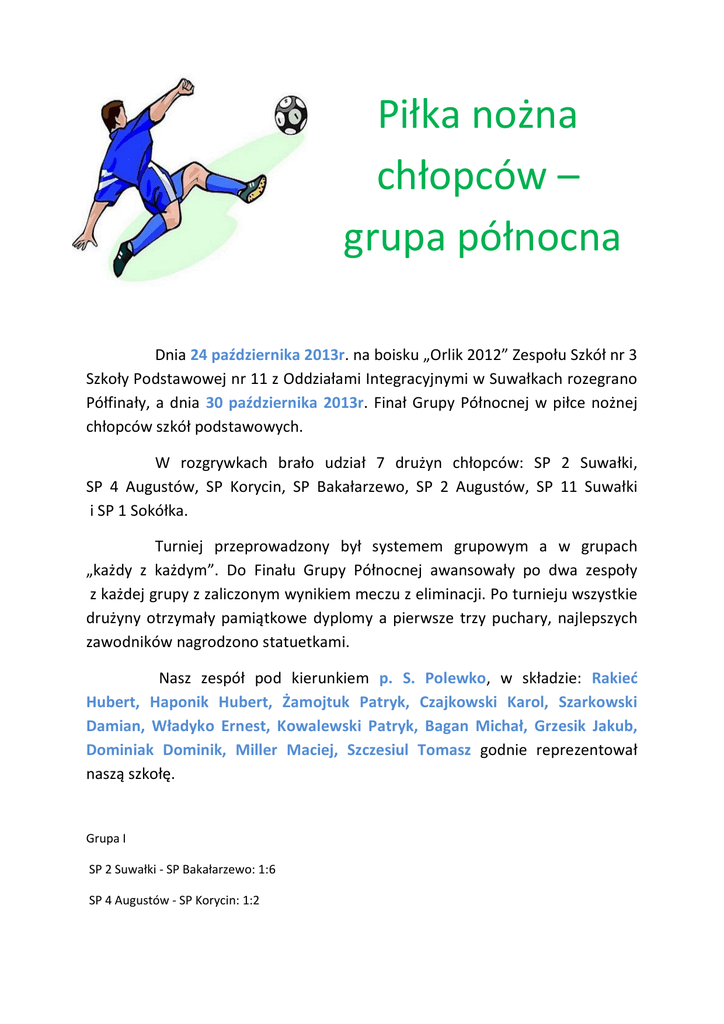 Piłka nożna chłopców – grupa północna Dnia 24 października 2013r. na boisku „Orlik 2012” Zespołu Szkół nr 3 Szkoły Podstawowej nr 11 z Oddziałami Integracyjnymi w Suwałkach rozegrano Półfinały, a dnia 30 października 2013r. Finał Grupy Północnej w piłce nożnej chłopców szkół podstawowych. W rozgrywkach brało udział 7 drużyn chłopców: SP 2 Suwałki, SP 4 Augustów, SP Korycin, SP Bakałarzewo, SP 2 Augustów, SP 11 Suwałki i SP 1 Sokółka. Turniej przeprowadzony był systemem grupowym a w grupach „każdy z każdym”. Do Finału Grupy Północnej awansowały po dwa zespoły z każdej grupy z zaliczonym wynikiem meczu z eliminacji. Po turnieju wszystkie drużyny otrzymały pamiątkowe dyplomy a pierwsze trzy puchary, najlepszych zawodników nagrodzono statuetkami. Nasz zespół pod kierunkiem p. S. Polewko, w składzie: Rakieć Hubert, Haponik Hubert, Żamojtuk Patryk, Czajkowski Karol, Szarkowski Damian, Władyko Ernest, Kowalewski Patryk, Bagan Michał, Grzesik Jakub, Dominiak Dominik, Miller Maciej, Szczesiul Tomasz godnie reprezentował naszą szkołę. Grupa I SP 2 Suwałki - SP Bakałarzewo: 1:6 SP 4 Augustów - SP Korycin: 1:2 SP Bakałarzewo - SP Korycin: 2:2 SP 2 Suwałki - SP 4 Augustów: 4:1 SP 4 Augustów - SP Bakałarzewo: 1:5 SP Korycin - SP 2 Suwałki: 3:2 Awans do FINAŁU GRUPY PÓŁNOCNEJ: 1. SP Bakałarzewo 2. SP Korycin GRUPA II SP 2 Augustów - SP 1 Sokółka: 0:2 SP 2 Augustów - SP 11 Suwałki: 1:3 SP 11 Suwałki - SP 1 Sokółka: 2:0 Awans do FINAŁU GRUPY PÓŁNOCNEJ: 1. SP 11 Suwałki 2. SP 1 Sokółka FINAŁGRUPYPÓŁNOCNEJ: 1) 1 – 4: SP Bakałarzewo – SP 1 Sokółka: 3:2 2) 2 – 3: SP Korycin – SP 11 Suwałki: 2:3 3) 4 – 3: SP 1 Sokółka – SP 11 Suwałki: 0:2 (wynik z eliminacji) 4) 1 – 2: SP 2 Bakałarzewo – SP Korycin: 2:2 (wynik z eliminacji) 5) 2 – 4: SP Korycin – SP 1 Sokółka: 1:0 6) 3 – 1: SP 11 Suwałki – SP Bakałarzewo: 2:3 Końcowa klasyfikacja szkół: 1. SP Bakałarzewo 45 pkt 2. SP 11 Suwałki 39 3. SP Korycin 34 4. SP 1 Sokółka 30 5. SP 2 Suwałki 26 SP 2 Augustów 26 7. SP 4 Augustów 24 Awans do Finału Igrzysk Województwa Podlaskiego w piłce nożnej chłopców: 1. SP Bakałarzewo 2. SP 11 Suwałki 3. SP Korycin M. Kasperuk