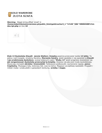 Warning: Illegal string offset 'small' in /home/zoba3/domains/xerosox.pl/public_html/gold/cache/3_1^%%58^586^586E658B%%in dex.tpl.php on line 18 Klub 13 Dyskoteka Klaudii - Jennie Walters. Książkę powinna przeczytać każda 13 latka. To jedna z serii książek, Urodziny Karoliny, Marzenia Sandry. Jeżeli spodoba ci się opowieść o Klaudii i jej urodzinowej dyskotece, szukaj kolejnych części "Klubu 13" Jeżeli pragniesz dowiedzieć się jak zorganizować dyskotekę przeczytaj tą książkę. Dowiesz się jaka jest moda dyskotekowa, błyszczący komplet obróżka i bransoletki. Farbowane podkoszulki, wymarzone napoje, poncz tropikalny. Pływające lody, kolorowy lód, czas na tańce. Magazyn szczęśliwej nastolatki. Przyjaźń i miłość moda i uroda plotki o gwiazdach konkursy, wróżby i magia. Strona 1 z 1