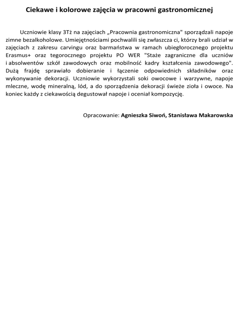 Ciekawe i kolorowe zajęcia w pracowni gastronomicznej Uczniowie klasy 3Tż na zajęciach „Pracownia gastronomiczna" sporządzali napoje zimne bezalkoholowe. Umiejętnościami pochwalili się zwłaszcza ci, którzy brali udział w zajęciach z zakresu carvingu oraz barmaństwa w ramach ubiegłorocznego projektu Erasmus+ oraz tegorocznego projektu PO WER "Staże zagraniczne dla uczniów i absolwentów szkół zawodowych oraz mobilność kadry kształcenia zawodowego". Dużą frajdę sprawiało dobieranie i łączenie odpowiednich składników oraz wykonywanie dekoracji. Uczniowie wykorzystali soki owocowe i warzywne, napoje mleczne, wodę mineralną, lód, a do sporządzenia dekoracji świeże zioła i owoce. Na koniec każdy z ciekawością degustował napoje i oceniał kompozycję. Opracowanie: Agnieszka Siwoń, Stanisława Makarowska