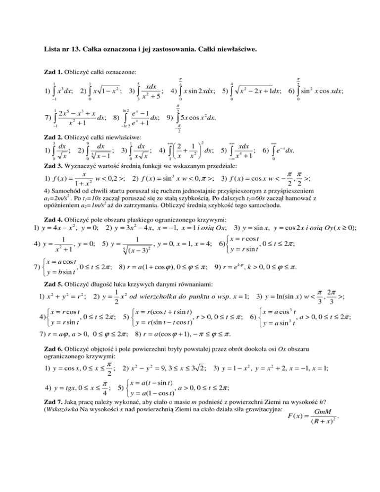 Lista nr 13. Całka oznaczona i jej zastosowania. Całki niewła ciwe. Zad 1. Obliczy całki oznaczone: π 1 1 5 −1 0 3 1) x 3 dx; 2) x 1 − x 2 ; 3) π 4 4 xdx ; 4) x sin 2 xdx; 5) x2 + 5 0 2 x 2 − 2 x + 1dx; 6) sin 2 x cos xdx; 0 0 π 1 ln 2 2x5 − x3 + x ex − 1 7) dx ; 8 ) dx; 9) x2 + 1 ex + 1 −1 − ln 2 Zad 2. Obliczy całki niewła ciwe: 3 1) 0 dx ; 2) x 9 0 3 dx ; 3) x −1 Zad 3. Wyznaczy warto 1) f ( x ) = 1 0 dx ; 4) x x +∞ 1 2 − 5 x cos x 2 dx. π 2 2 1 + x x2 2 +∞ xdx dx ; 5) ; 6) x4 + 1 −∞ +∞ e − x dx. 0 redni funkcji we wskazanym przedziale: x π π w < 0,2 >; 2) f ( x ) = sin 3 x w < 0, π >; 3) f ( x ) = cos x w < − , >; 2 1+ x 2 2 4) Samochód od chwili startu poruszał si ruchem jednostajnie przy pieszonym z przy pieszeniem a1=2m/s2 . Po t1=10s zacz ł porusza si ze stał szybko ci . Po dalszych t2=60s zacz ł hamowa z opó nieniem a2=1m/s2 a do zatrzymania. Obliczy redni szybko tego samochodu. Zad 4. Obliczy pole obszaru płaskiego ograniczonego krzywymi: 1) y = 4 x − x 2 , y = 0; 2) y = 3 x 2 − 4 x, x = −1, x = 1 i osi Ox; 3) y = sin x , y = cos 2 x i osi Oy ( x ≥ 0); 4) y = 7) 1 , y = 0; 5) y = x +1 2 x = a cos t y = b sin t 1 5 ( x − 3) 2 , y = 0, x = 1, x = 4; 6) x = r cos t y = r sin t , 0 ≤ t ≤ 2π ; , 0 ≤ t ≤ 2π ; 8) r = a (1 + cos ϕ ), 0 ≤ ϕ ≤ π ; 9) r = e k ϕ , k > 0, 0 ≤ ϕ ≤ π . Zad 5. Obliczy długo łuku krzywych danymi równaniami: π 2π 1 2 x od wierzcholk a do punktu o wsp. x = 1; 3) y = ln(sin x ) w < , >; 2 3 3 x = r cos t x = r (cos t + t sin t ) x = a cos 3 t 4) , 0 ≤ t ≤ 2π ; 5) , r > 0, 0 ≤ t ≤ π ; 6) , a > 0, 0 ≤ t ≤ 2π ; y = r (sin t − t cos t ) y = r sin t y = a sin 3 t 1) x 2 + y 2 = r 2 ; 2) y = 7) r = aϕ , a > 0, 0 ≤ ϕ ≤ 2π ; 8) r = a (cos ϕ + 1), − π ≤ ϕ ≤ π . Zad 6. Obliczy obj to i pole powierzchni bryły powstałej przez obrót dookoła osi Ox obszaru ograniczonego krzywymi: 1) y = cos x, 0 ≤ x ≤ 4) y = tgx, 0 ≤ x ≤ π π 4 2 ; 2) x 2 − y 2 = 9, 3 ≤ x ≤ 3 2 ; 3) y = 1 − x 2 , y = x 2 + 2, x = −1, x = 1; ; 5) x = a (t − sin t ) , a > 0, 0 ≤ t ≤ 2π ; y = a (1 − cos t ) Zad 7. Jak prac nale y wykona , aby ciało o masie m podnie z powierzchni Ziemi na wysoko h? (Wskazówka Na wysoko ci x nad powierzchni Ziemi na ciało działa siła grawitacyjna: GmM F ( x) = ( R + x )2 . Zad 8. Samolot zwiadowczy S i rakieta R, która ma go zestrzeli , poruszaj si po prostej. W chwili t=0 odległo mi dzy nimi wynosiła d=9[km]. Szybko samolotu w chwili t, gdzie t>=0, wyra a si wzorem vs (t)=1+16t [km/min], a szybko rakiety vR (t)=1+4t3 [km/min]. Po jakim czasie rakieta trafi w samolot? y = r 2 − x 2 wzgl dem osi Ox przy Zad 9. Obliczy moment bezwładno ci łuku półokr gu zało eniu, e g sto g=1. Zad 10. Obliczy współrz dne rodka ci ko ci łuku asteroidy przy zało eniu, e g sto g=const. 2 2 2 x 3 + y 3 = a 3 , a > 0, 0 ≤ x ≤ a, Zad 11. Obliczy moment statyczny wzgl dem osi Oy łuku cykloidy x = a (t − sin t ), y = a (1 − cos t ), a > 0, 0 ≤ t ≤ π 2 , przy zało eniu, e g sto g=1. Zad 12. Znale współrz dne rodka ci ko ci obszaru płaskiego ograniczonego krzyw oraz prostymi y=0 i x=4, je li g sto p=const. y=2 x y ≥ 0,