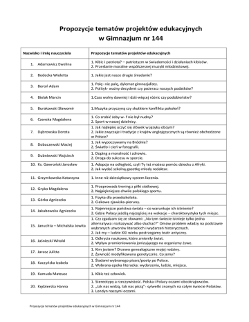 Propozycje tematów projektów edukacyjnych w Gimnazjum nr 144 Nazwisko i imię nauczyciela Propozycje tematów projektów edukacyjnych 1. Adamowicz Ewelina 1. Kibic i patriota? – patriotyzm w świadomości i działaniach kibiców. 2. Przesłanie moralne współczesnej muzyki młodzieżowej. 2. Bodecka Wioletta 1. Jakie jest nasze drugie śniadanie? 3. Boroń Adam 1. Palę- nie palę, dylemat gimnazjalisty. 2. Polityk- ważny decydent czy pożeracz naszych podatków? 4. Bielak Marcin 1.Czas wolny dawniej i dziś-więcej różnic czy podobieństw? 5. Burakowski Sławomir 1.Muzyka przyczyną czy skutkiem konfliktu pokoleń? 6. Czenska Magdalena 7. Dąbrowska Dorota 8. Dobaczewski Maciej 9. Dubniewski Wojciech 1. Co zrobić żeby w- f nie był nudny? 2. Sport w naszej dzielnicy. 1. Jak najlepiej uczyć się słówek w języku obcym? 2. Jakie zwyczaje i tradycje z krajów anglojęzycznych są również obchodzone w Polsce? 1. Jak wypoczywamy na Bródnie? 2. Światło i cień w fotografii. 1. Doping a moralność i zdrowie. 2. Droga do sukcesu w sporcie. 10. Ks. Gawroński Jarosław 1. Adopcja na odległość, czyli Ty też możesz pomóc dziecku z Afryki. 2. Jak wydać szkolną gazetkę-młody redaktor. 11. Grzymkowska Katarzyna 1. Inne niż dziesiątkowy system liczenia. 12. Gryko Magdalena 1. Przeprowadz trening z piłki siatkowej. 2. Najpiękniejsze chwile polskiego sportu. 13. Górka Agnieszka 1. Fizyka dla przedszkolaka. 2. Ciekawe zjawiska-pioruny. 14. Jakubowska Agnieszka 15. Januchta – Michalska Jowita 16. Jaśniecki Witold 1. Najmniejsze państwa świata – co warunkuje ich istnienie? 2. Gdzie Polacy jeżdżą najczęściej na wakacje – charakterystyka tych miejsc. 1. Czy zgadzam się ze słowami: „Na tym świecie istnieje tylko jedna alternatywa: rozkazywać albo słuchać?” Omów problem władzy na podstawie wybranych utworów literackich i wydarzeń historycznych. 2. Jak my – ludzie XXI wieku postrzegamy teatr antyczny. 1. Odkrycia naukowe, które zmieniły świat. 2. Wpływ promieniowania jonizującego na organizmy żywe. 17. Jarosz Julitta 1. Kim jestem? Drzewo genealogiczne mojej rodziny. 2. Żywność modyfikowana genetycznie. Co jemy? 18. Kaczyńska Izabela 1. Śladami wybranego pisarz/poety po Polsce. 2. Wybrana epoka literacka: wydarzenia, ludzie, miejsca. 19. Kamuda Mateusz 1. Kibic też człowiek. 20. Kędzierska Hanna 1. Stereotypy a rzeczywistość. Polska i Polacy oczami obcokrajowców. 2. „Jak nas widzą, tak nas piszą”- sylwetki znanych na całym świecie Polaków. 3. Londyn naszymi oczami. Propozycje tematów projektów edukacyjnych w Gimnazjum nr 144 21. Kępczyńska Barbara 1. Co pozostało z dziedzictwa starożytnych Greków? 22. Komarnicka Emilia 1. Skuteczna komunikacja – czyli jak mówić, żeby nas słuchano? 23. Konieczka Joanna 1.Targówek – miejsca i ludzie, którzy tworzą jego historię. 2. Wolontariat drogowskazem do zrozumienia i tolerancji. 24. Kotlińska Magdalena 1. Teraz i kiedyś – dlaczego warto uczyć się języków obcych? 2. Zaplanuj 7-dniową wycieczkę klasową do Paryża. 25. Kowalczuk Mariusz 1. Domy kultury. Jaki wpływ mają na życie kulturalne mieszkańców dzielnicy? 2. Moje ulubione miejsca obcowania z kulturą i sztuką. 26. Kowalski Michał 1. Pomaluj mój świat. 2. Savoir vivre- dobre maniery. 27. Krzyżanowski Adam 1. Szanuj wodę, może jej zabraknąć. 28. Kwiatkowski Paweł 1. Wartości olimpijskie a postawy współczesnych olimpijczyków. 29. Leoniak Anna 30. Łodygowski Karol 1. Jak opracować warszawski atlas zabytków związanych z kulturą odrodzenia? 2. W jaki sposób pokazać motyw miłości w sztuce i literaturze? 1. Stereotypy polsko-angielskie i ang.-polskie. 2. Jak zmniejszyć zużycie paliwa w samochodzie. 31. Łukaszewicz Maria 1. Jak zaplanować wycieczkę po…(dowolne miasto w krajach niemieckojęzycznych lub Rosji). 32. Łukaszewicz Mariusz 1. Wpływ zdrowego odżywiania na organizm. 33. Macek Michał 1. Uczeń, piłkarz, trener. Jak zostać trenerem piłki nożnej. 34. Mikulska Jolanta 1. Czy rodzina ma wpływ na nasze poglądy? 2. Skąd się bierze depresja wśród nastolatków? 35. Mochocka Izabela 1. Gra o gimnazjum-gra edukacyjna. 2. Spacer Traktem Królewskim-odkrywamy przeszłość naszego miasta. 36. Nowak Justyna 1. Tacy jesteśmy – subkultury młodzieżowe. 37. Małgorzata Ostrzyniewska Dorota Chylak 1. „Pozostaw po sobie ślad”-akcja zbierania książek na rzecz biblioteki szkolnej. 2. Kibic i kibol – jacy jesteśmy?. 3. Czy telewizja jest źródłem informacji? 4. „Blask świętości” – montaż słowno- muzyczny z okazji 7 rocznicy śmierci Jana Pawła II. 38. Pawelczyk Marta 1. Historia mojej rodziny-tworzymy drzewo genealogiczne. 39. Pawelec Krystyna 1. Zabytki Łazienek Królewskich na tle historii Polski. 40. Pawlak Agnieszka 1. Jaki wpływ na życie ma chemia w łazience. 2. Jakie procesy chemiczne wspomagają bożonarodzeniowy obiad. 41. Ruciński Marek 1. Sportowa moda na przestrzeni lat na przykładzie koszykówki. 42. Sawicka Grażyna 1. Jak zorganizować ciekawą wycieczkę po Mazowszu? Propozycje tematów projektów edukacyjnych w Gimnazjum nr 144 43. Sikorski Tomasz 44. Sokołowska Ewa 1. Jakie funkcje spełnia klub sportowy działający w dużym mieście? 2. Zorganizować i przeprowadzić mini igrzyska olimpijskie dla uczniów naszej szkoły. 1. Angielski w przestrzeni publicznej. 2. Podróż marzeń – zaplanuj wakacje w gronie przyjaciół. 45. Świdowicz Mariusz 1. Młody reporter-jak działa radio w twoim mieście? 46. Tadrzak Ewa 1. Obiekty niedostępne. 2. Zastosowanie Twierdzenia Pitagorasa. 47. Taut Paweł 1. Linux – wolne oprogramowanie - strona www. 2. Sztuczki i porady do Windows – strona www. 3. Strona internetowa mojej klasy. 48. Wasiluk Bogusław 1. Jak zorganizować dzień sportu szkolnego? 49. Wiśniewska Karolina 50. Wnuk Bożena 51. Zaniewicz-Kowalczuk Ewa 1. Język angielski w życiu codziennym. 2. Taniec jako aktywna form