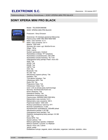 ELEKTRONIK S.C. Utworzono : 04 marzec 2017 Telekomunikacja > Telefony Komórkowe > SONY XPERIA MINI PRO BLACK SONY XPERIA MINI PRO BLACK Model : TELSOEKOM0086 SONY XPERIA MINI PRO BLACK Producent : Sony Ericsson Gwarancja: 24 miesiące gwarancji fabrycznej Pasma pracy GSM: 850 /900/1800/1900 Maks. czas rozmów: 4,7 h Maks. czas czuwania: 331 h Bateria: 1200 mAh Wymiary (dł x szer x gr): 92x53x18 mm Waga: 136 g Kolor: czarny System operacyjny: Android Wyświetlacz (rodzaj): TFT dotykowy Wyświetlacz (rozdzielczość): 320 x480 Wyświetlacz (liczba kolorów): 16,7 mln Obsługiwane karty pamięci Flash: micro SD WAP: Tak GPRS: Tak EDGE: Tak UMTS: Tak IrDA: Nie Bluetooth: Tak W-LAN: Tak Wbudowany aparat cyfrowy: Tak Dyktafon: Tak Tryb głośno mówiący: Tak Odtwarzacz MP3: Tak Radio FM: Tak Połączenia Video: Tak Odtwarzacz Video: Tak www: Link na stronę opisu technicznego Wymiary: 92,00x53,00x18,00 mm Ekran dotykowy: Tak Klawiatura Qwerty: Tak Klawiatura numeryczna: Nie Pasma pracy: 850/900/1800/1900 MHz Maksymalny czas rozmów: 5,4 h Maksymalny czas czuwania: 340 h Pojemność baterii: 1200 mAh Rodzaj wyświetlacza: kolorowy TFT Rozmiar wyświetlacza: 3 cale Rozdzielczość wyświetlacza: 320x480 piksel Wbudowana pamięć: 0,32 GB Obsługiwane karty pamięci: Tak Wielkość obsługiwanej karty pamięci: 32 GB WiFi: Tak Moduł GPS: Tak Aparat cyfrowy: Tak Matryca głównego aparatu: 5 Mpiksel Matryca aparatu z przodu: 0,3 Mpiksel Złącza: micro usb, 3,5mm Języki: polski Dodatkowe funkcje: zegarek, alarm, kalkulator, organizer, kalndarz, dyktafon, vibra kontakt : - [email protected] Strona 1 ELEKTRONIK S.C. Utworzono : 04 marzec 2017 Telekomunikacja > Telefony Komórkowe > SONY XPERIA MINI PRO BLACK SONY XPERIA MINI PRO BLACK Zawartość zestawu: kompletna Cena : 909,51 zł Brutto ( 745,50 zł Netto) Dostępność: Produkt dostępny w naszym sklepie od 13 styczeń 2012 kontakt : - [email protected] Strona 2