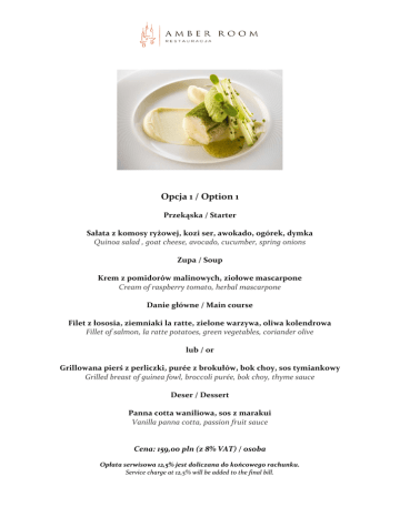 Opcja 1 / Option 1 Przekąska / Starter Sałata z komosy ryżowej, kozi ser, awokado, ogórek, dymka Quinoa salad , goat cheese, avocado, cucumber, spring onions Zupa / Soup Krem z pomidorów malinowych, ziołowe mascarpone Cream of raspberry tomato, herbal mascarpone Danie główne / Main course Filet z łososia, ziemniaki la ratte, zielone warzywa, oliwa kolendrowa Fillet of salmon, la ratte potatoes, green vegetables, coriander olive lub / or Grillowana pierś z perliczki, purée z brokułów, bok choy, sos tymiankowy Grilled breast of guinea fowl, broccoli purée, bok choy, thyme sauce Deser / Dessert Panna cotta waniliowa, sos z marakui Vanilla panna cotta, passion fruit sauce Cena: 159,00 pln (z 8% VAT) / osoba Opłata serwisowa 12,5% jest doliczana do końcowego rachunku. Service charge at 12,5% will be added to the final bill. Opcja 2 / Option 2 Przekąska / Starter Pierożki ze szpinakiem i serem ricotta, oliwa bazyliowa, parmezan Ravioli with spinach and ricotta cheese, basil oil, parmesan Zupa / Soup Minestrone, pomidory, pesto z natki Minestrone, tomatoes, parsley pesto Danie główne / Main course Filet z okonia, kuskus, marynowany ogórek, pesto z natki Seabass fillet, cous cous, marinated cucumber, parsley pesto lub / or Policzki cielęce, kasza gryczana, zielona fasolka, sos z czerwonego wina Veal cheeks, buckwheat, green beans, red wine sauce Deser / Dessert Fondant czekoladowy, lody malinowe, melisa Chocolate fondant , raspberry ice cream, lemon balm Cena: 169,00 pln (z 8% VAT) / osoba Opłata serwisowa 12,5% jest doliczana do końcowego rachunku. Service charge at 12,5% will be added to the final bill. Opcja 3 / Option 3 Przekąska / Starter Tatar z polędwicy wołowej, ogórek małosolny, jajko przepiórcze Beef tartare, cucumber, quail egg Zupa / Soup Rosół z królika, domowy makaron Rabbit consommé, home-made pasta Danie główne / Main course Udko kaczki confit, kalarepa, purée z pietruszki, jabłko, sos z trawy żubrowej Duck leg confit, kohlrabi, parsley purée, apples, Bison Grass sauce lub / or Filet z troci, szpinak, zielone szparagi, kapary, kawior z łososia Fillet of sea trout, spinach, green asparagus, capers, salmon caviar Deser / Dessert Sernik jogurtowy z truskawkami, mięta Yogurt cheesecake with strawberries, mint Cena: 179,00 pln (z 8% VAT) / osoba Opłata serwisowa 12,5% jest doliczana do końcowego rachunku. Service charge at 12,5% will be added to the final bill Opcja 4 / Option 4 Przekąska / Starter Tatar z tuńczyka, awokado, imbir, limonka Tuna tartare, avocado, ginger, lime Zupa / Soup Zupa szczawiowa, jajko przepiórcze Sorrel soup, quail egg Danie główne / Main course Filet z dorsza, czarny ryż, bok choy, fasolka szparagowa, pesto z natki Fillet of cod, black rice, bok choy, green beans, parsley pesto lub / or Polędwica cielęca, marchew, jarmuż, perłowa cebula, amarantus Fillet of veal, carrots, kale, pearl onions, amaranth Deser / Dessert Karmelizowana tarta cytrynowa, sorbet truskawkowy Caramelized lemon tart, strawberry sorbet Cena: 189,00 pln (z 8% VAT) / osoba Opłata serwisowa 12,5% jest doliczana do końcowego rachunku. Service charge at 12,5% will be added to the final bill. Opcja 5 / Option 5 Przekąska / Starter Krewetki tygrysie, chorizo, purée marakuja, chilli, kolendra Tiger prawns, chorizo, passion fruit purée, chilli, coriander Zupa / Soup Krem z pora, crème fraiche, płatki czarnej trufli Cream of leek soup, crème frâiche, black truffle Danie główne / Main course Filet z żabnicy, czarny ryż, koper włoski, velouté z małży Monkfish, wild rice, fennel, mussel velouté lub / or Filet z polędwicy wołowej, ziemniaki, zielony groszek, grzyby Beef fillet, potatoes, green peas, mushrooms Deser / Dessert Mus jogurtowy, ziarna Chia, malina, miód akacjowy Yoghurt mousse, Chia seeds, raspberry, acacia honey Cena: 229,00 pln (z 8% VAT) / osoba Opłata serwisowa 12,5% jest doliczana do końcowego rachunku. Service charge at 12,5% will be added to the final bill.