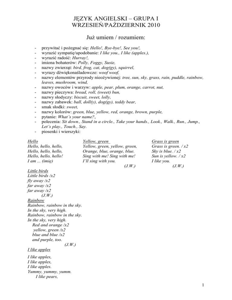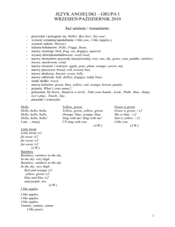 JĘZYK ANGIELSKI – GRUPA I WRZESIEŃ/PAŹDZIERNIK 2010 Już umiem / rozumiem: - przywitać i pożegnać się: Hello!, Bye-bye!, See you!, wyrazić sympatię/upodobanie: I like you., I like (apples.), wyrazić radość: Hurray!, imiona bohaterów: Polly, Foggy, Susie, nazwy zwierząt: bird, frog, cat, dog(gy), squirrel, wyrazy dźwiękonaśladowcze: woof woof, nazwy elementów przyrody nieożywionej: tree, sun, sky, grass, rain, puddle, rainbow, leaves, mushroom, wind, nazwy owoców i warzyw: apple, pear, plum, orange, carrot, nut, nazwy pieczywa: bread, roll, (sweet) bun, nazwy słodyczy: biscuit, sweet, lolly, nazwy zabawek: ball, doll(y), dog(gy), teddy bear, smak słodki: sweet, nazwy kolorów: green, blue, yellow, red, orange, brown, purple, pytanie: What’s your name?, polecenia: Sit down., Stand in a circle., Take your hands., Look., Walk., Run., Jump., Let’s play., Touch., Say. piosenki i wierszyki: Hello Hello, hello, hello, Hello, hello, hello, Hello, hello, hello! I am ... (imię) Yellow, green Yellow, green, yellow, green, Orange, blue, orange, blue. Sing with me! Sing with me! I’ll sing with you. (J.W.) Grass is green Grass is green. / x2 Sky is blue. / x2 Sun is yellow. / x2 I like you. (J.W.) Little birds Little birds /x2 fly away /x2 far away /x2 far away /x2 (J.W.) Rainbow Rainbow, rainbow in the sky. In the sky, very high. Rainbow, rainbow in the sky. In the sky, very high. Red and orange /x2 yellow, green /x2 blue and blue /x2 and purple, too. (J.W.) I like apples I like apples, I like apples, I like apples. Yummy, yummy, yumm. I like pears, 1 I like pears, I like pears. Yummy, yummy, yumm. I like plums, I like plums, I like plums. Yummy, yummy, yumm. (J.W.) Rain Rain, rain, rain, rain is falling down, making, making puddles all around. Splash, splash, splash. /x4 (J.W.) Come to the window Come to the window /x2 and look through the pain. /x2 It’s raining, it’s raining, /x2 it’s raining all day. /x2 Let’s play! Let’s play! /x2 Hurray, hurray! /x2 Let’s play! Let’s play /x2 all day, all day. /x2 Let’s play all day. (J.W.) In the forest In the forest, in the forest little squirrels jump, jump. Leaves fall down, leaves fall down, mushrooms grow on the ground. Leaves fall down, leaves fall down, mushrooms grow all around. (J.W.) Frogs and dogs Jump, jump, jump, jump little frogs. Walk, walk, walk, walk little dogs. // x2 (J.W.) Wind is blowing Wind is blowing. Wind is blowing. Trees are bending here and there. Leaves are floating in the air. (J.W.) Do you like me, teddy bear? Do you like me, teddy bear? Yes, I do. Yes, I do. Do you like me, teddy bear? Yes! – I like you, too. (J.W.) 2 I like you I like you, Polly, /x2 little dolly. /x2 I like you, Polly, /x2 very, very much. /x2 I like you, Foggy, /x2 little doggy. /x2 I like you, Foggy, /x2 very, very much. /x2 (J.W.) Many leaves are falling down Many, many leaves are falling down, /x2 making a carpet on the ground. /x2 Walk, walk, walk through the leaves. /x2 Run, run, run among the trees. /x2 Many, many leaves are falling down. (J.W.) Pat-a-cake baker’s man Pat-a-cake, pat-a-cake baker’s man. Make me a cake as fast as you can. Pat it and prick it, and mark it with ‘B’, and put it in the oven for baby and me. For baby and me, for baby and me. And put it in the oven for baby and me. (znana piosenka angielska dla dzieci) Sweets A biscuit, a lolly and a sweet (clap, clap) /x2 A biscuit, a lolly /x2 A biscuit, a lolly and a sweet (clap, clap) (J.W.) Nauczyciel: Joanna Wójciak 3