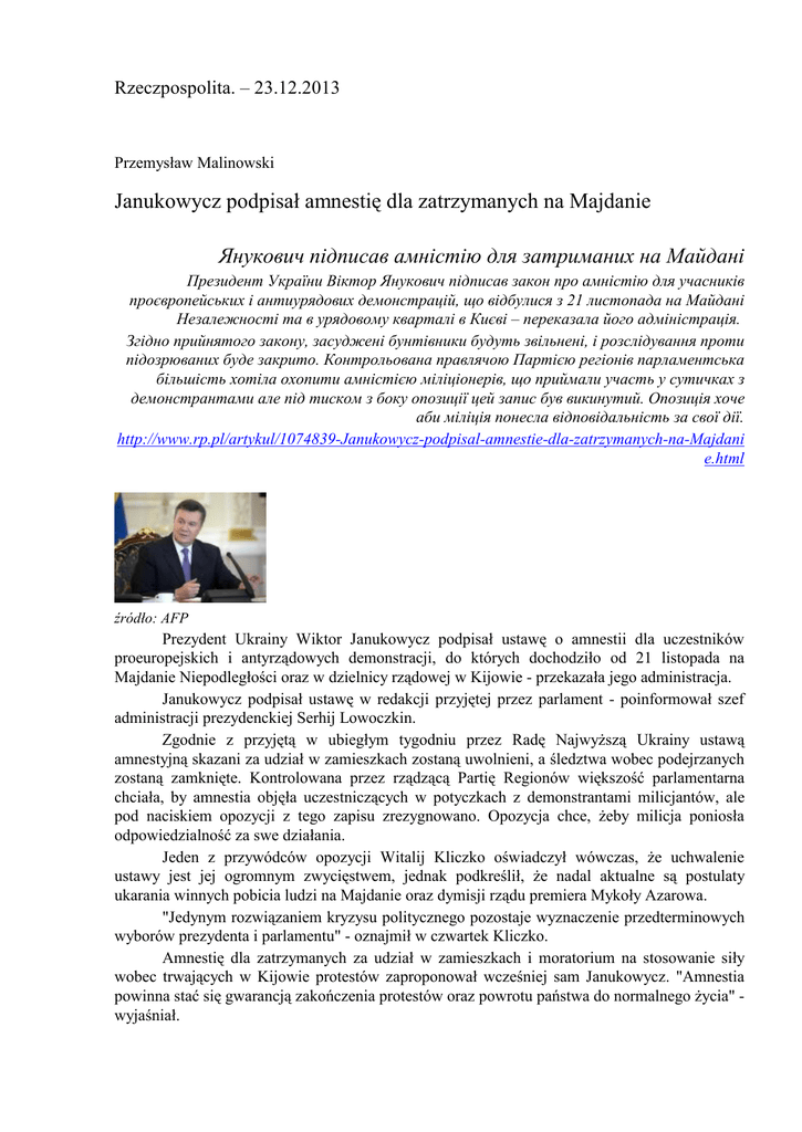 Rzeczpospolita. – 23.12.2013 Przemysław Malinowski Janukowycz podpisał amnestię dla zatrzymanych na Majdanie Янукович підписав амністію для затриманих на Майдані Президент України Віктор Янукович підписав закон про амністію для учасників проєвропейських і антиурядових демонстрацій, що відбулися з 21 листопада на Майдані Незалежності та в урядовому кварталі в Києві – переказала його адміністрація. Згідно прийнятого закону, засуджені бунтівники будуть звільнені, і розслідування проти підозрюваних буде закрито. Контрольована правлячою Партією регіонів парламентська більшість хотіла охопити амністією міліціонерів, що приймали участь у сутичках з демонстрантами але під тиском з боку опозиції цей запис був викинутий. Опозиція хоче аби міліція понесла відповідальність за свої дії. http://www.rp.pl/artykul/1074839-Janukowycz-podpisal-amnestie-dla-zatrzymanych-na-Majdani e.html źródło: AFP Prezydent Ukrainy Wiktor Janukowycz podpisał ustawę o amnestii dla uczestników proeuropejskich i antyrządowych demonstracji, do których dochodziło od 21 listopada na Majdanie Niepodległości oraz w dzielnicy rządowej w Kijowie - przekazała jego administracja. Janukowycz podpisał ustawę w redakcji przyjętej przez parlament - poinformował szef administracji prezydenckiej Serhij Lowoczkin. Zgodnie z przyjętą w ubiegłym tygodniu przez Radę Najwyższą Ukrainy ustawą amnestyjną skazani za udział w zamieszkach zostaną uwolnieni, a śledztwa wobec podejrzanych zostaną zamknięte. Kontrolowana przez rządzącą Partię Regionów większość parlamentarna chciała, by amnestia objęła uczestniczących w potyczkach z demonstrantami milicjantów, ale pod naciskiem opozycji z tego zapisu zrezygnowano. Opozycja chce, żeby milicja poniosła odpowiedzialność za swe działania. Jeden z przywódców opozycji Witalij Kliczko oświadczył wówczas, że uchwalenie ustawy jest jej ogromnym zwycięstwem, jednak podkreślił, że nadal aktualne są postulaty ukarania winnych pobicia ludzi na Majdanie oraz dymisji rządu premiera Mykoły Azarowa. "Jedynym rozwiązaniem kryzysu politycznego pozostaje wyznaczenie przedterminowych wyborów prezydenta i parlamentu" - oznajmił w czwartek Kliczko. Amnestię dla zatrzymanych za udział w zamieszkach i moratorium na stosowanie siły wobec trwających w Kijowie protestów zaproponował wcześniej sam Janukowycz. "Amnestia powinna stać się gwarancją zakończenia protestów oraz powrotu państwa do normalnego życia" wyjaśniał. Od 21 listopada, gdy na Ukrainie rozpoczęły się protesty wywołane odmową podpisania przez władze umowy stowarzyszeniowej z UE, milicja zatrzymała, a sądy skazały na kary dwóch miesięcy pozbawienia wolności kilkanaście osób. 30 listopada nad ranem milicja brutalnie spacyfikowała uczestników demonstracji na Majdanie Niepodległości, wśród których dominowali studenci kijowskich uczelni. 1 grudnia doszło do zamieszek przed administracją prezydencką, wywołanych - jak twierdzi opozycja przez wynajętych przez władze prowokatorów. Po obu tych zdarzeniach o pomoc medyczną poprosiło łącznie ponad 300 osób. Protesty w Kijowie trwają już ponad miesiąc. Koncentrują się one na Majdanie Niepodległości, gdzie stoi otoczone barykadami miasteczko namiotowe.