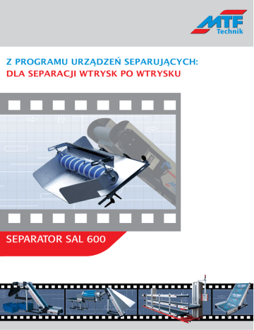 Technik Z PROGRAMU URZĄDZEŃ SEPARUJĄCYCH: DLA SEPARACJI WTRYSK PO WTRYSKU MTF Walce separująco- rozdzielające Typ TA i Separatory ślimakowe Typ SAL/SAR są częścią programu Multi-Tech Program i są specjalnie przeznaczone do instalacji na wszystkich rodzajach taśm serii Multi-Tech. Napęd odbywa się poprzez integrację silnika bębnowego z regulacją. Separatory oddzielają prosto z maszyny wtryśnięte detale od wlewek, z wszystkich rodzajów przemysłów wtrysku tworzyw, dzięki temu manualne sortowanie jest już niepotrzebne. Ze względu na zaawansowaną konstrukcję, można w ciągu kilku sekund dopasować geometrię urządzenia do rożnorodnych części. Zalety • Proste i wygodne ustawianie na różnorodną geometrię części • Najprostsza obsługa • Szybkie przebudowy bez konieczności zastosowania narzędzi • Optymalne wyniki separowania poprzez dokładną możliwość dopasowania walców rozdzielających – tj. ustawienia pokrycia ślimaka • Obłożenie Poliestrowe powyżej walca ślimaka zapobiegające cofaniu się części • Szybkie i proste zakładanie i rozmontowanie separatora na transporter, dotyczy również wymiany kompletnych wsadów • Łatwe dopasowanie do transporterów serii Multi-Tech • Nieścieralne napędy separatorów, poprzez silniki bębnowe • Najwyższe bezpieczeństwo pracy poprzez unikanie miejsc wciągających i elektronikę wyłączeniową • Krótkie terminy dostaw Dane techniczne • Silnik bębnowy z czujnikiem momentu obrotowego moc 30W, przyłącze 230V/50Hz • 7 stopniowa ilość obrotów pomiędzy 15 i 92 U/min • Walce separacyjno rozdzielające z 1, 2 lub 3 walcami z różnorodnymi obłożeniami • Szkielet ślimaka walcowego z PVC z wymiennym lub przymocowanym na stałe ślimakiem z różnorodnych materiałów i dostarczany w różnorodnych wysokościach • Standardowo dostarczane do transporterów o szerokości użytkowej od 600mm • Opcjonalne wyposażenie z kolcami do uelastyczniania separacji haczykowatych wlewek Technik