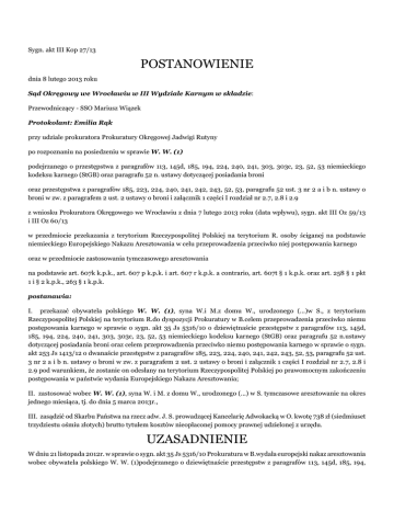 Sygn. akt III Kop 27/13 POSTANOWIENIE dnia 8 lutego 2013 roku Sąd Okręgowy we Wrocławiu w III Wydziale Karnym w składzie: Przewodniczący - SSO Mariusz Wiązek Protokolant: Emilia Rąk przy udziale prokuratora Prokuratury Okręgowej Jadwigi Rutyny po rozpoznaniu na posiedzeniu w sprawie W. W. (1) podejrzanego o przestępstwa z paragrafów 113, 145d, 185, 194, 224, 240, 241, 303, 303c, 23, 52, 53 niemieckiego kodeksu karnego (StGB) oraz paragrafu 52 n. ustawy dotyczącej posiadania broni oraz przestępstwa z paragrafów 185, 223, 224, 240, 241, 242, 243, 52, 53, paragrafu 52 ust. 3 nr 2 a i b n. ustawy o broni w zw. z paragrafem 2 ust. 2 ustawy o broni i załącznik 1 części I rozdział nr 2.7, 2.8 i 2.9 z wniosku Prokuratora Okręgowego we Wrocławiu z dnia 7 lutego 2013 roku (data wpływu), sygn. akt III Oz 59/13 i III Oz 60/13 w przedmiocie przekazania z terytorium Rzeczypospolitej Polskiej na terytorium R. osoby ściganej na podstawie niemieckiego Europejskiego Nakazu Aresztowania w celu przeprowadzenia przeciwko niej postępowania karnego oraz w przedmiocie zastosowania tymczasowego aresztowania na podstawie art. 607k k.p.k., art. 607 p k.p.k. i art. 607 r k.p.k. a contrario, art. 607t § 1 k.p.k. oraz art. 258 § 1 pkt 1 i § 2 k.p.k., 263 § 1 k.p.k. postanawia: I. przekazać obywatela polskiego W. W. (1), syna W.i M.z domu W., urodzonego (...)w S., z terytorium Rzeczypospolitej Polskiej na terytorium R.do dyspozycji Prokuratury w B.celem przeprowadzenia przeciwko niemu postępowania karnego w sprawie o sygn. akt 35 Js 5316/10 o dziewiętnaście przestępstw z paragrafów 113, 145d, 185, 194, 224, 240, 241, 303, 303c, 23, 52, 53 niemieckiego kodeksu karnego (StGB) oraz paragrafu 52 n.ustawy dotyczącej posiadania broni oraz celem przeprowadzenia przeciwko niemu postępowania karnego w sprawie o sygn. akt 253 Js 1413/12 o dwanaście przestępstw z paragrafów 185, 223, 224, 240, 241, 242, 243, 52, 53, paragrafu 52 ust. 3 nr 2 a i b n. ustawy o broni w zw. z paragrafem 2 ust. 2 ustawy o broni i załącznik 1 części I rozdział nr 2.7, 2.8 i 2.9 pod warunkiem, że zostanie on odesłany na terytorium Rzeczypospolitej Polskiej po prawomocnym zakończeniu postępowania w państwie wydania Europejskiego Nakazu Aresztowania; II. zastosować wobec W. W. (1), syna W. i M. z domu W., urodzonego (...) w S. tymczasowe aresztowanie na okres jednego miesiąca, tj. do dnia 5 marca 2013r., III. zasądzić od Skarbu Państwa na rzecz adw. J. S. prowadzącej Kancelarię Adwokacką w O. kwotę 738 zł (siedmiuset trzydziestu ośmiu złotych) brutto tytułem kosztów nieopłaconej pomocy prawnej udzielonej z urzędu. UZASADNIENIE W dniu 21 listopada 2012r. w sprawie o sygn. akt 35 Js 5316/10 Prokuratura w B.wydała europejski nakaz aresztowania wobec obywatela polskiego W. W. (1)podejrzanego o dziewiętnaście przestępstw z paragrafów 113, 145d, 185, 194, 224, 240, 241, 303, 303c, 23, 52, 53 niemieckiego kodeksu karnego (StGB) oraz paragrafu 52 n. ustawy dotyczącej posiadania broni. Przestępstwa te określono jako naruszenie ustawy o broni (czyn 1); opór wobec egzekwujących funkcjonariuszy w zbiegu ze zniewagą (czyn 2); zniewaga (czyn 3); groźba w zbiegu ze zniewagą (czyn 4); niebezpieczne uszkodzenie ciała (czyn 5); usiłowanie zmuszania (czyn 6); groźba w zbiegu ze zniewagą (czyn 7); groźba (czyny 8 i 9); uszkodzenie rzeczy w zbiegu z groźbą (czyn 10); usiłowanie uszkodzenia ciała w zbiegu z oporem wobec egzekwujących funkcjonariuszy w zbiegu ze zniewagą (czyn 11); zniewaga (czyn 12); groźba w zbiegu ze zniewagą (czyn 13); zniewaga (czyny 14 i 15); usiłowanie zmuszania (czyn 16); groźba (czyn 17); pozorowanie przestępstw (przypadek 18); groźba (czyn 19). W dniu 13 grudnia 2012r. w sprawie o sygn. akt 253 Js 1413/12 Prokuratura w B.wydała europejski nakaz aresztowania wobec obywatela polskiego W. W. (1)podejrzanego o dwanaście przestępstw z paragrafów 185, 223, 224, 240, 241, 242, 243, 52, 53, paragrafu 52 ust. 3 nr 2 a i b n. ustawy o broni w zw. z paragrafem 2 ust. 2 ustawy o broni i załącznik 1 części I rozdział nr 2.7, 2.8 i 2.9. Przestępstwa te określono jako występek kradzieży w szczególnie ciężkim przypadku (1, 2 i 12); groźba ze zbrodnią (przypadki 3, 4, 5, 6, 7, 9, 10, 11); niebezpieczne uszkodzenie ciała (przypadki 3, 4, 5); naruszenie Ustawy o broni (przypadek 3); zmuszanie (przypadek 4), zniewaga (przypadki 5, 8 i 11), uszkodzenie ciała (przypadki 6, 8 i 10). W dniu 7 lutego 2013 roku do Sądu Okręgowego we Wrocławiu wpłynął wniosek Prokuratora Okręgowego we Wrocławiu w kwestii tymczasowego aresztowania wymienionego i jego przekazania z terytorium Rzeczypospolitej Polskiej na terytorium R. na podstawie art. 607k § 1 k.p.k. W trakcie posiedzenia Sądu w dniu 8 lutego 2013r. podejrzany nie wyraził zgody na przekazanie go na terytorium R.ani na to, by w wypadku ewentualnego przekazania prowadzono przeciwko niemu postępowania o przestępstwa nieobjęte powyższymi ENA a także na ewentualne wykonywanie kary za takie przestępstwa. Sąd zważył, co następuje. Wniosek Prokuratora zasługuje na uwzględnienie. W ocenie Sądu, w przedmiotowej sprawie zostały spełnione warunki, od których wystąpienia polskie przepisy procedury karnej – wyrażone w rozdziale 65b k.p.k. – uzależniają wykonanie Europejskiego Nakazu Aresztowania. Przekazanie ma nastąpić w celu przeprowadzenia przeciwko W. W. (1) postępowań karnych. Brak jest przesłanek określonych w art. 607p § 1 k.p.k. które obligowałyby Sąd do odmowy wykonania Nakazu. W. W. (1)jest podejrzany o przestępstwa, które nie podlegają darowaniu na mocy amnestii, nie zapadło w stosunku do nich prawomocne orzeczenie w innym państwie odnośnie tego samego czynu, nie przekazano go również na podstawie prawomocnego orzeczenia do innego państwa Unii Europejskiej. Nadto odpowiedzialność ściganego nie ulega ograniczeniu na gruncie prawa polskiego z racji jego wieku. Wyko