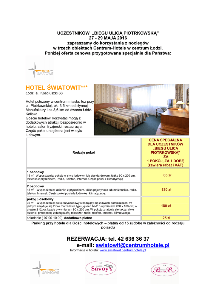 UCZESTNIKÓW „BIEGU ULICĄ PIOTRKOWSKĄ” 27 - 29 MAJA 2016 zapraszamy do korzystania z noclegów w trzech obiektach Centrum-Hotele w centrum Łodzi. Poniżej oferta cenowa przygotowana specjalnie dla Państwa: HOTEL ŚWIATOWIT*** Łódź, al. Kościuszki 68 Hotel położony w centrum miasta, tuż przy ul. Piotrkowskiej, ok. 3,5 km od słynnej Manufaktury i ok.3,6 km od dworca ŁódźKaliska. Goście hotelowi korzystać mogą z dodatkowych atrakcji bezpośrednio w hotelu: salon fryzjerski, restauracja. Część pokoi urządzona jest w stylu ludowym. Rodzaje pokoi CENA SPECJALNA DLA UCZESTNIKÓW „BIEGU ULICĄ PIOTRKOWSKĄ” ZA 1 POKÓJ, ZA 1 DOBĘ (zawiera rabat i VAT) 1 osobowy 2. 15 m Wyposażenie: pokoje w stylu ludowym lub standardowym, łóżko 90 x 200 cm, łazienka z prysznicem, radio, telefon, Internet. Część pokoi z klimatyzacją 65 zł 2 osobowy 2. 15 m Wyposażenie: łazienka z prysznicem, łóżka pojedyncze lub małżeńskie, radio, telefon, Internet. Część pokoi posiada lodówkę i klimatyzację. 130 zł pokój 3 osobowy 2. 36 m Wyposażenie: pokój trzyosobowy składający się z dwóch pomieszczeń. W jednym znajduje się łóżko małżeńskie typu „queen bed” o wymiarach 200 x 160 cm; w drugim 2 łóżka, każde o wymiarach 90 x 200 cm. W pokoju znajdują się także: dwie łazienki, przedpokój z dużą szafą, telewizor, radio, telefon, Internet, klimatyzacja. 180 zł 25 zł Parking przy hotelu dla Gości hotelowych – płatny od 15 zł/dobę w zależności od rodzaju pojazdu śniadanie ( 07.00-10.00) dodatkowo płatne REZERWACJA: tel. 42 636 36 37 e-mail: [email protected] Informacje o hotelu: www.swiatowit.centrumhotele.pl HOTEL SAVOY** Łódź, ul. Traugutta 6 Hotel w stylu retro. Goście wjeżdżają na piętra zabytkową windą z obsługą. Hotel położony jest doskonale, tuż przy sławnej ul. Piotrkowskiej będącej wizytówką Łodzi. W pobliżu znajdują się: kina, puby restauracje i kawiarnie. Rodzaje pokoi CENA SPECJALNA DLA UCZESTNIKÓW „BIEGU ULICĄ PIOTRKOWSKĄ” ZA 1 POKÓJ, ZA 1 DOBĘ (zawiera rabat i VAT) 1 osobowy 2 18m , położenie – od dziedzińca. Wyposażenie: łazienka z prysznicem, telewizor, radio, telefon, Internet. Możliwość dostawki. 65 zł 1 osobowy w stylu retro 2 18 m , położenie - od dziedzińca. Stylowe wyposażenie: meble w stylu retro, sekretarzyk, łazienka z prysznicem i biczami wodnymi, telewizor, radio, suszarka do włosów, telefon, Internet. 2 osobowy 2 20 m , położenie - od dziedzińca lub od frontu. Pokoje składają się z jednego pomieszczenia lub sypialni i pokoju dziennego. Wyposażenie: łazienka z prysznicem, łóżka pojedyncze lub małżeńskie, telewizor, radio, telefon, Internet. 130 zł 2 osobowy w stylu retro 2 20 m , położenie – od dziedzińca. Wyposażenie: meble w stylu retro, sekretarzyk, łóżko małżeńskie, łazienka z prysznicem lub wanną, suszarka do włosów, telewizor, radio, telefon, Internet. 3 osobowy 2 20 m , położenie - od dziedzińca lub od frontu. Pokoje składają się z jednego pomieszczenia lub sypialni i pokoju dziennego. Wyposażenie: łazienka z prysznicem, łóżka pojedyncze lub małżeńskie, telewizor, radio, telefon, Internet. Śniadanie (07.00-10.00) dodatkowo płatne 180 zł 25 zł Parking strzeżony około 200m od hotelu – od 25 zł/za dobę w zależności od rodzaju pojazdu; REZERWACJA: tel. 42 632 93 60 e-mail: [email protected] Informacje o hotelu: www.savoy.centrumhotele.pl HOTEL POLONIA PALAST** Łódź, ul. Narutowicza 38 Hotel Polonia Palast** to 100 letni obiekt „z duszą”, wpisany do Rejestru Zabytków. Położony jest około 400 m od ul. Piotrkowskiej (głównej arterii handlowo-rozrywkowej miasta) oraz ok. 1 km od słynnej łódzkiej Manufaktury. Rodzaje pokoi CENA SPECJALNA DLA UCZESTNIKÓW „BIEGU ULICĄ PIOTRKOWSKĄ” ZA 1 POKÓJ, ZA 1 DOBĘ (zawiera rabat i VAT) 1 osobowy 11 m2 - 16 m2 Wyposażenie: łazienka z prysznicem, łóżko 90/200cm, TV, radio, telefon. Położenie: od ulicy. 2 osobowy 16 m2 - 23 m2 Wyposażenie: łazienka z wanną lub prysznicem, łóżka pojedyncze lub małżeńskie, TV, radio, telefon. Położenie: od ulicy. Możliwość dostawki. 65 zł 130 zł 3 osobowy 23 m2. Pokoje składają się z sypialni i pokoju dziennego. Wyposażenie: łazienka z wanną i prysznicem, łóżka pojedyncze lub małżeńskie, TV, radio, telefon. Dostawka (możliwa na rozkładanym łóżku). Położenie: od dziedzińca lub od ulicy. Śniadanie (07.00-10.00) dodatkowo płatne 180 zł 17 zł Parking strzeżony około 200m od hotelu – od 25 zł/za dobę w zależności od rodzaju pojazdu; REZERWACJA: tel. 42 632 87 73 e-mail: [email protected] Informacje o hotelu: www.polonia.centrumhotele.pl WARUNKI REZERWACJI, PŁATNOŚCI I ANULACJI DLA UCZESTNIKÓW „BIEGU ULICĄ PIOTRKOWSKĄ” w terminie: 27-29.05.2016 roku. 1. Rezerwacja może być dokonana telefonicznie lub mailowo. Aby skorzystać z powyższych cen z rabatem konieczne jest podanie hasła: „BIEG ULICĄ PIOTRKOWSKĄ” oraz dokonanie gwarancji rezerwacji. 2. Obowiązkowa jest gwarancja w wysokości minimum 50% wartości rezerwacji poprzez: preautoryzację na karcie płatniczej/kredytowej lub przelew na konto Centrum-Hotele. Druk preautoryzacji w języku polskim i angielskim dostępny jest w Recepcji Hotelu. 3. Istnieje możliwość skorzystania z zakwaterowania bez wcześniejszej rezerwacji bezpośrednio w hotelu, w miarę dostępności pokoi. Aby skorzystać z cen specjalnych konieczne jest podanie w recepcji hasła „BIEG ULICĄ PIOTRKOWSKĄ” 4. Rezerwacje traktowane są jako rezerwacje gwarantowane (tzn. wymagają formy pisemnej i nie podlegają automatycznej anulacji przez hotel o godz. 19.00 w przypadku braku przyjazdu Gościa do tego czasu). Rezerwacje gwarantowane zachowują swoją ważność do zakończenia doby hotelowej tj. do godziny 12.00 dnia następnego. Brak przyjazdu Gościa w pierwszej dobie traktowany jest jako niedojazd co oznacza, że Gość