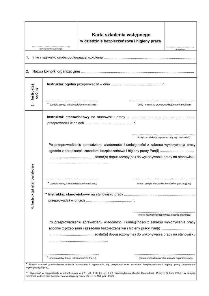 Karta szkolenia wstępnego w dziedzinie bezpieczeństwa i higieny pracy ........................................... ............................... Nazwa pracodawcy (pieczęć) Numer karty 1. Imię i nazwisko osoby podlegającej szkoleniu ............................................................................................. 3. InstruktaŜ ogólny 2. Nazwa komórki organizacyjnej .................................................................................................................... InstruktaŜ ogólny przeprowadził w dniu .................................................... r. ............................................................... * (podpis osoby, której udzielono instruktaŜu) ......................................................................... (imię i nazwisko przeprowadzającego instruktaŜ) InstruktaŜ stanowiskowy na stanowisku pracy ...................................................................... przeprowadził w dniach ................................................. r. ........................................................................ (imię i nazwisko przeprowadzającego instruktaŜ) Po przeprowadzeniu sprawdzianu wiadomości i umiejętności z zakresu wykonywania pracy zgodnie z przepisami i zasadami bezpieczeństwa i higieny pracy Pan(i) ................................... 4. InstruktaŜ stanowiskowy .............................................. został(a) dopuszczony(na) do wykonywania pracy na stanowisku ............................................................. ............................................................... * (podpis osoby, której udzielono instruktaŜu) ....................................................................... (data i podpis kierownika komórki organizacyjnej) ** InstruktaŜ stanowiskowy na stanowisku pracy ......................................................................... przeprowadził w dniach ............................................... r. ................................................................ (imię i nazwisko przeprowadzającego instruktaŜ) Po przeprowadzeniu sprawdzianu wiadomości i umiejętności z zakresu wykonywania pracy zgodnie z przepisami i zasadami bezpieczeństwa i higieny pracy Pan(i) ................................... .............................................. został(a) dopuszczony(na) do wykonywania pracy na stanowisku ............................................................. ......................................................... * (podpis osoby, której udzielono instruktaŜu) .............................................................. (data i podpis kierownika komórki organizacyjnej) * Podpis stanowi potwierdzenie odbycia instruktaŜu i zapoznania się przepisami oraz zasadami bezpieczeństwa i higieny pracy dotyczącymi wykonywanych prac, ** Wypełniać w przypadkach, o których mowa w § 11 ust. 1 pkt 2 i ust. 2 i 3 rozporządzenia Ministra Gospodarki i Pracy z 27 lipca 2004 r. w sprawie szkolenia w dziedzinie bezpieczeństwa i higieny pracy (Dz. U. nr 180, poz. 1860) PROGRAM SZKOLENIA WSTĘPNEGO w zakresie bezpieczeństwa i higieny pracy I. Program ramowy instruktaŜu ogólnego Temat szkolenia Liczba godzin* 1 2 3 1. 2. Istota bezpieczeństwa i higieny pracy Zakres obowiązków i uprawnień pracodawcy, pracowników oraz poszczególnych komórek organizacyjnych zakładu pracy i organizacji społecznych w zakresie bezpieczeństwa i higieny pracy Odpowiedzialność za naruszenie przepisów lub zasad bezpieczeństwa i higieny pracy Zasady poruszania się na terenie zakładu pracy ZagroŜenia wypadkowe i zagroŜenia dla zdrowia występujące w zakładzie i podstawowe środki zapobiegawcze Podstawowe zasady bezpieczeństwa i higieny pracy związane z obsługą urządzeń technicznych oraz transportem wewnątrzzakładowym Zasady przydziału odzieŜy roboczej i obuwia roboczego oraz środków ochrony indywidualnej, w tym w odniesieniu do stanowiska pracy instruowanego Porządek i czystość w miejscu pracy- ich wpływ na zdrowie i bezpieczeństwo pracownika Profilaktyczna opieka lekarska- zasady jej sprawowania w odniesieniu do stanowiska instruowanego Podstawowe zasady ochrony przeciwpoŜarowej oraz postępowania w razie poŜaru Postępowanie w razie wypadku, w tym organizacja i zasady udzielania pierwszej pomocy RAZEM: L.p. 3. 4. 5. 6. 7. 8. 9. 10. 11. 0,6 0,5 0,4 0,5 1 3 godz. II. Program ramowy instruktaŜu stanowiskowego Temat szkolenia* Liczba ) godzin** 1 2 3 1. Przygotowanie pracownika do wykonywania określonej pracy, w tym w szczególności: a) omówienie warunków z uwzględnieniem: - elementów pomieszczenia pracy, w którym ma pracować pracownik, mających wpływ na warunki pracy pracownika (np. oświetlenie ogólne, ogrzewanie, wentylacja, urządzenia techniczne, urządzenia ochronne), - elementów stanowiska roboczego mających wpływ na bezpieczeństwo i higienę pracy (np. pozycja przy pracy, oświetlenie miejscowe, wentylacja miejscowa, urządzenia zabezpieczające, ostrzegawcze i sygnalizacyjne, narzędzia, surowce i produkty), - przebiegu procesu pracy na stanowisku pracy w nawiązaniu do procesu produkcyjnego (działalności) w całej komórce organizacyjnej i zakładzie pracy, b) omówienie zagroŜeń występujących przy określonych czynnościach na stanowisku pracy, wyników oceny ryzyka zawodowego związanego z wykonywaną pracą i sposobów ochrony przed zagroŜeniami oraz zasad postępowania w razie wypadku lub awarii, c) przygotowanie wyposaŜenia stanowiska roboczego do wykonywania określonego zadania Pokaz przez instruktora sposobu wykonywania pracy na stanowisku pracy zgodnie z przepisami i zasadami bezpieczeństwa i higieny pracy, z uwzględnieniem metod bezpiecznego wykonywania poszczególnych czynności i ze szczególnym zwróceniem uwagi na czynności trudne i niebezpieczne Próbne wykonanie zadania przez pracownika pod kontrolą instruktora Samodzielna praca pracownika pod kontrolą instruktora Om