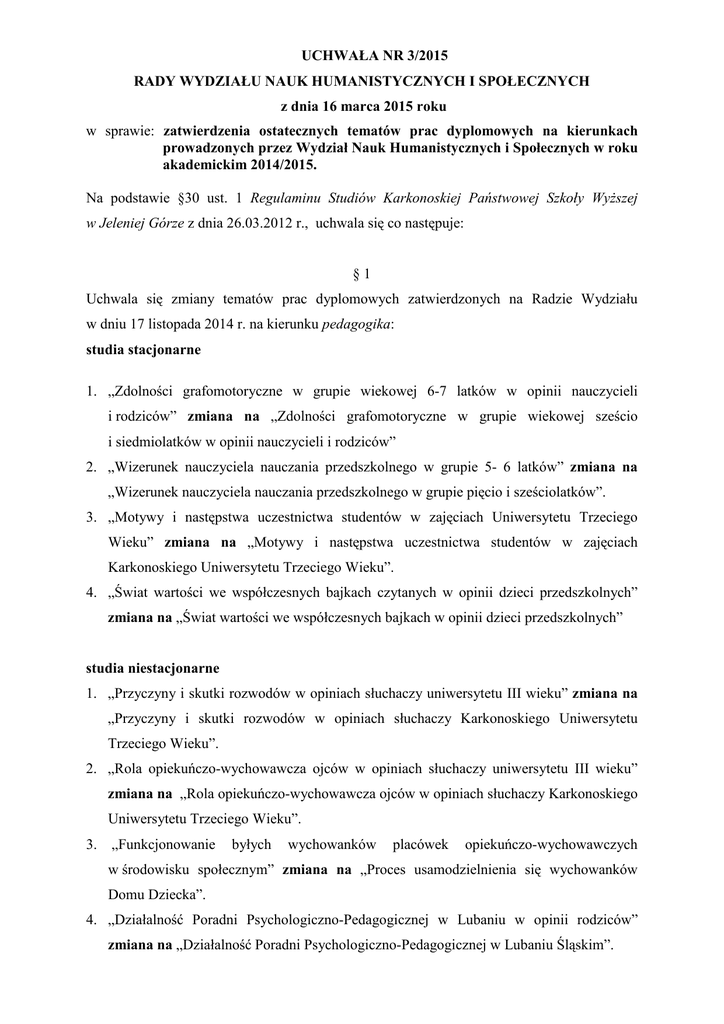 UCHWAŁA NR 3/2015 RADY WYDZIAŁU NAUK HUMANISTYCZNYCH I SPOŁECZNYCH z dnia 16 marca 2015 roku w sprawie: zatwierdzenia ostatecznych tematów prac dyplomowych na kierunkach prowadzonych przez Wydział Nauk Humanistycznych i Społecznych w roku akademickim 2014/2015. Na podstawie §30 ust. 1 Regulaminu Studiów Karkonoskiej Państwowej Szkoły WyŜszej w Jeleniej Górze z dnia 26.03.2012 r., uchwala się co następuje: §1 Uchwala się zmiany tematów prac dyplomowych zatwierdzonych na Radzie Wydziału w dniu 17 listopada 2014 r. na kierunku pedagogika: studia stacjonarne 1. „Zdolności grafomotoryczne w grupie wiekowej 6-7 latków w opinii nauczycieli i rodziców” zmiana na „Zdolności grafomotoryczne w grupie wiekowej sześcio i siedmiolatków w opinii nauczycieli i rodziców” 2. „Wizerunek nauczyciela nauczania przedszkolnego w grupie 5- 6 latków” zmiana na „Wizerunek nauczyciela nauczania przedszkolnego w grupie pięcio i sześciolatków”. 3. „Motywy i następstwa uczestnictwa studentów w zajęciach Uniwersytetu Trzeciego Wieku” zmiana na „Motywy i następstwa uczestnictwa studentów w zajęciach Karkonoskiego Uniwersytetu Trzeciego Wieku”. 4. „Świat wartości we współczesnych bajkach czytanych w opinii dzieci przedszkolnych” zmiana na „Świat wartości we współczesnych bajkach w opinii dzieci przedszkolnych” studia niestacjonarne 1. „Przyczyny i skutki rozwodów w opiniach słuchaczy uniwersytetu III wieku” zmiana na „Przyczyny i skutki rozwodów w opiniach słuchaczy Karkonoskiego Uniwersytetu Trzeciego Wieku”. 2. „Rola opiekuńczo-wychowawcza ojców w opiniach słuchaczy uniwersytetu III wieku” zmiana na „Rola opiekuńczo-wychowawcza ojców w opiniach słuchaczy Karkonoskiego Uniwersytetu Trzeciego Wieku”. 3. „Funkcjonowanie byłych wychowanków placówek opiekuńczo-wychowawczych w środowisku społecznym” zmiana na „Proces usamodzielnienia się wychowanków Domu Dziecka”. 4. „Działalność Poradni Psychologiczno-Pedagogicznej w Lubaniu w opinii rodziców” zmiana na „Działalność Poradni Psychologiczno-Pedagogicznej w Lubaniu Śląskim”. 5. „Wpływ długotrwałego pobytu wychowanków w placówce opiekuńczo-wychowawczej na ich zachowania w grupie rówieśniczej” zmiana na „Proces adaptacji wychowanków w Domu Dziecka”. 6. „Nauka jako istotny element w procesie przygotowania skazanego do Ŝycia na wolności” zmiana na „Nauczanie skazanych istotnym czynnikiem w procesie resocjalizacji penitencjarnej”. 7. „Trudności w uczeniu się wychowanków Domu Dziecka” zmiana na „Trudności w uczeniu się wychowanków Domu Dziecka w opinii wychowawców i nauczycieli”. §2 Uchwala się zmianę tematu pracy dyplomowej zatwierdzonego na Radzie Wydziału w dniu 17 listopada 2014 r. na kierunku dziennikarstwo i komunikacja społeczna: 1. „Kultura upokarzania na przykładzie programów „Sekrety Chirurgii” zmiana na „Kultura upokarzania na przykładzie telewizyjnego programu „Sekrety Chirurgii”. §3 Uchwala się zmiany tematów prac dyplomowych zatwierdzonych na Radzie Wydziału w dniu 17 listopada 2014 r. na kierunku filologia: filologia angielska 1. „Piłka noŜna jako styl Ŝycia w autobiografiach kluczowych angielskich zawodników” zmiana na „Autobiografie piłkarzy i uprawianie sportu jako inspiracja stylu Ŝycia”. 2. „Wybór najbardziej efektywnej metody nauczania języka dla wprowadzania angielskiego słownictwa na pierwszym etapie edukacyjnym” zmiana na „Dobór najbardziej efektywnej metody nauczania języka dla wprowadzania angielskiego słownictwa na pierwszym etapie edukacyjnym”. 3. „Portrety gangstera w Ojcu Chrzestnym Mario Puzo” zmiana na „Portrety gangstera w Ojcu Chrzestnym Mario Puzo i w trylogii Ojciec Chrzestny Francisa Forda Coppola”. §4 Uchwala się, Ŝe pozostałe tematy ustalone na Radzie Wydziału w dniu 17 listopada 2014 r. (Uchwała nr 29/2014), łącznie z tematami wniesionymi w § 1, 2, i 3 niniejszej Uchwały są ostatecznymi tematami prac dyplomowych w roku akademickim 2014/2015. §5 Uchwała wchodzi w Ŝycie z dniem podjęcia. §6 Wykonanie Uchwały powierza się Dziekanowi Wydziału Nauk Humanistycznych i Społecznych. Przewodniczący Rady Wydziału Nauk Humanistycznych i Społecznych dr Leszek Albański