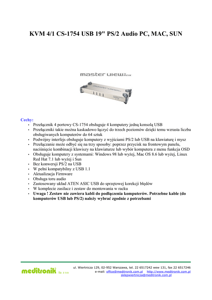 KVM 4/1 CS-1754 USB 19" PS/2 Audio PC, MAC, SUN Cechy: • Przełącznik 4 portowy CS-1754 obsługuje 4 komputery jedną konsolą USB • Przełączniki takie można kaskadowo łączyć do trzech poziomów dzięki temu wzrasta liczba obsługiwanych komputerów do 64 sztuk • Podwójny interfejs obsługuje komputery z wyjściami PS/2 lub USB na klawiaturę i mysz • Przełączanie może odbyć się na trzy sposoby: poprzez przycisk na frontowym panelu, naciśnięcie kombinacji klawiszy na klawiaturze lub wybór komputera z menu funkcja OSD • Obsługuje komputery z systemami: Windows 98 lub wyżej, Mac OS 8.6 lub wyżej, Linux Red Hat 7.1 lub wyżej i Sun • Bez konwersji PS/2 na USB • W pełni kompatybilny z USB 1.1 • Aktualizacja Firmware • Obsługa toru audio • Zastosowany układ ATEN ASIC USB do sprzętowej korekcji błędów • W komplecie zasilacz i zestaw do montowania w racku • Uwaga ! Zestaw nie zawiera kabli do podłączenia komputerów. Potrzebne kable (do komputerów USB lub PS/2) należy wybrać zgodnie z potrzebami ul. Wiertnicza 129, 02-952 Warszawa, tel. 22 6517242 wew 131, fax 22 6517246 e-mail: [email protected] http://www.meditronik.com.pl [email protected] Widok frontowy Widok z tyłu Diagram: ul. Wiertnicza 129, 02-952 Warszawa, tel. 22 6517242 wew 131, fax 22 6517246 e-mail: [email protected] http://www.meditronik.com.pl [email protected] Specyfikacja: Funkcje Specyfikacja Złącza komputera 4 Wybór portu CPU (KVM) przycisk/kombinacja klawiszy/OSD Kontrolki LED Konsola Złącza komputera On Line 4 Pomarańczowa Selected 4 Zielona Klawiatura 1 x USB typ A Mysz 1 x USB typ A Video 1 x HDB 15 żeńska Audio 1 x Port Stereo + 1 x Port Mikrofon Audio 4 x port STEREO + 1 x Port Mikrofon Video 4 x SPDB (V15 )żeńska Zasilanie energią 1 x DC 5V, 2.6A Skanowanie wewnętrzne 1-255 Sek. (default 5 sek.) Aktualizacja Firmware RJ 11 x 1 Rozdzielczość do 2048 X 1536 Wymiary (L x W x H) 43.2 x 15.4 x 4.5 cm Obudowa Metal Waga 2.64 kg ul. Wiertnicza 129, 02-952 Warszawa, tel. 22 6517242 wew 131, fax 22 6517246 e-mail: [email protected] http://www.meditronik.com.pl [email protected]