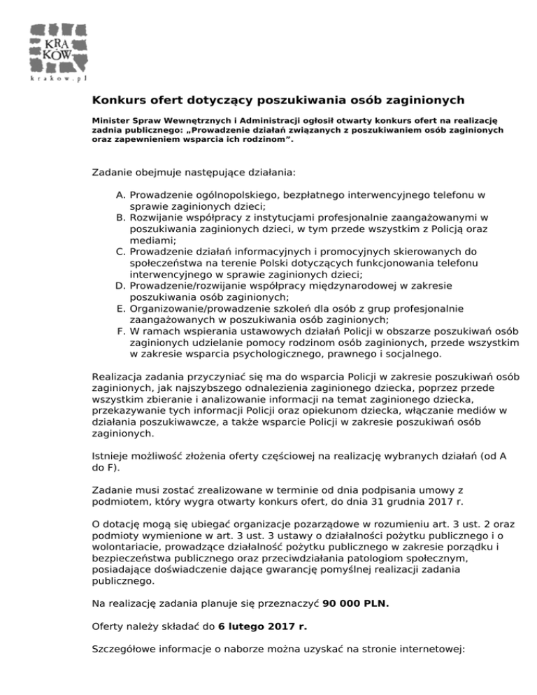 Konkurs ofert dotyczący poszukiwania osób zaginionych Minister Spraw Wewnętrznych i Administracji ogłosił otwarty konkurs ofert na realizację zadnia publicznego: „Prowadzenie działań związanych z poszukiwaniem osób zaginionych oraz zapewnieniem wsparcia ich rodzinom”. Zadanie obejmuje następujące działania: A. Prowadzenie ogólnopolskiego, bezpłatnego interwencyjnego telefonu w sprawie zaginionych dzieci; B. Rozwijanie współpracy z instytucjami profesjonalnie zaangażowanymi w poszukiwania zaginionych dzieci, w tym przede wszystkim z Policją oraz mediami; C. Prowadzenie działań informacyjnych i promocyjnych skierowanych do społeczeństwa na terenie Polski dotyczących funkcjonowania telefonu interwencyjnego w sprawie zaginionych dzieci; D. Prowadzenie/rozwijanie współpracy międzynarodowej w zakresie poszukiwania osób zaginionych; E. Organizowanie/prowadzenie szkoleń dla osób z grup profesjonalnie zaangażowanych w poszukiwania osób zaginionych; F. W ramach wspierania ustawowych działań Policji w obszarze poszukiwań osób zaginionych udzielanie pomocy rodzinom osób zaginionych, przede wszystkim w zakresie wsparcia psychologicznego, prawnego i socjalnego. Realizacja zadania przyczyniać się ma do wsparcia Policji w zakresie poszukiwań osób zaginionych, jak najszybszego odnalezienia zaginionego dziecka, poprzez przede wszystkim zbieranie i analizowanie informacji na temat zaginionego dziecka, przekazywanie tych informacji Policji oraz opiekunom dziecka, włączanie mediów w działania poszukiwawcze, a także wsparcie Policji w zakresie poszukiwań osób zaginionych. Istnieje możliwość złożenia oferty częściowej na realizację wybranych działań (od A do F). Zadanie musi zostać zrealizowane w terminie od dnia podpisania umowy z podmiotem, który wygra otwarty konkurs ofert, do dnia 31 grudnia 2017 r. O dotację mogą się ubiegać organizacje pozarządowe w rozumieniu art. 3 ust. 2 oraz podmioty wymienione w art. 3 ust. 3 ustawy o działalności pożytku publicznego i o wolontariacie, prowadzące działalność pożytku publicznego w zakresie porządku i bezpieczeństwa publicznego oraz przeciwdziałania patologiom społecznym, posiadające doświadczenie dające gwarancję pomyślnej realizacji zadania publicznego. Na realizację zadania planuje się przeznaczyć 90 000 PLN. Oferty należy składać do 6 lutego 2017 r. Szczegółowe informacje o naborze można uzyskać na stronie internetowej: https://bip.mswia.gov.pl/bip/otwarte-konkursy-ofert/24438,Otwarty-konkurs-ofert-na-r ealizacje-zadania-publicznego-pnquotProwadzenie-dziala.html Powered by TCPDF (www.tcpdf.org)