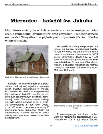 www.ciekawe-miejsca.net Szlak Romański: Mieronice Mieronice – kościół św. Jakuba Mało która świątynia w Polsce zawiera w sobie umiejętne połączenie romańskiej architektury oraz gotyckich i renesansowych malowideł. Wszystko to w pięknie położonym kościele św. Jakuba w Mieronicach. Wszystkie te zmiany nie powiększyły jednak za bardzo miniaturowej świątyni. Od XV wieku nie zmieniło się tu nic poza dostawieniem (zapewne w XVIII wieku) drewnianej dzwonnicy. W 1570 roku na krótko świątynia stała się zborem ariańskim. Dzisiaj kościół w Mieronicach, o długości niecałych 20 metrów należy do najmniejszych w okolicy (obok Mokrska Dolnego). Kościół w Mieronicach w całej swej okazałości Kościół w Mieronicach (na południe od Jędrzejowa) to jedna z najmniejszych świątyń romańskich w Polsce. W połowie XIII wieku w miejscowości tej zbudowano kościół o ceglanym prezbiterium (zachowanym do dziś) i drewnianej nawie. Tak wybudowana świątynia była wzmiankowana m.in. w wykazie świętopietrza z 1326 roku. Dopiero w XV wieku zdecydowano zastąpić drewnianą nawę kamienną. Wtedy też dobudowano kruchtę, zakrystię, dobudówkę północną oraz poszerzono okna prezbiterium. Wewnętrzne ściany pokrywają średniowieczne freski Z interesującego nas okresu zachowało się romańskie prezbiterium o wymiarach ok. 7,5 x 6,5 metra. Zbudo26 nr 6 (15), Czerwiec 2008 www.ciekawe-miejsca.net Szlak Romański: Mieronice wane zostało z cegieł (dość wczesne zastosowanie, jak na ten teren!) w układzie wendyjskim. Jedyną dekoracją zewnętrzną jest fryz z przeplatających się arkadek. Wewnątrz prezbiterium zachowało się autentyczne sklepienie krzyżowo-żebrowe z bardzo ciekawymi wspornikami. Wykonanie każdego z nich jest inne: jeden złożony jest jakby z rozkwitających pąków róży, drugi – z liści dębowych. Pomiędzy detalami architektury romańskiej umieszczone zostały w XIV wieku gotyckie freski, które doskonale komponują się z surowością świątyni. Na pierwszy rzut oka nie sposób zauważyć, że zostały w tym miejscu później dodane. Freski przedstawiają Narodziny i Pasję Chrystusa (Pojmanie Chrystusa, Chrystus niosący krzyż, Ukrzyżowanie), a także Panny mądre i głupie. Niektóre przedstawienia nie zostały zidentyfikowane z powodu słabego stanu zachowania. Pozostałe wyposażenie kościoła to m.in. renesansowe sakrarium (miejsce przechowywania hostii) i epitafium oraz nieco późniejsze empora i malowidła na ścianach nawy. Poza tym warty uwagi jest także średniowieczny dzwon z napisem minuskułowym, umieszczony na dzwonnicy. Kościół w Mieronicach oraz jego otoczenie na pewno wywrą na nas niezapomniane wrażenie. Tekst i zdjęcia: Jakub Jagiełło Informacje praktyczne: Mieronice leżą w południowej części woj. świętokrzyskiego, w pow. jędrzejowskim. Najłatwiej dojechać tu drogą krajową nr 7 i skręcić w Wodzisławiu (ciekawą synagogę opisujemy w numerze majowym), stąd ok. 4 km na zachód. Z Kielc jest ok. 65 km, z Krakowa 80 km. Kościół jest czasami zamknięty, wtedy trzeba udać się do księdza proboszcza. Romański wspornik sklepienia z motywem liści dębowych 27 nr 6 (15), Czerwiec 2008