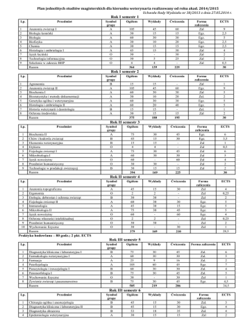Plan jednolitych studiów magisterskich dla kierunku weterynaria realizowany od roku akad. 2014/2015 Uchwała Rady Wydziału nr 38/2013 z dnia 27.05.2014 r. Rok I semestr 1 Lp. Przedmiot Anatomia zwierząt I Biologia komórki Biologia Biofizyka Chemia Histologia i embriologia I Język łaciński Technologia informacyjna Szkolenie w zakresie BHP Razem 1 2 3 4 5 6 7 8 9 Symbol grupy A A A A A A O O O Ogółem Wykłady Ćwiczenia 105 30 60 30 30 45 30 30 4 364 45 15 30 10 15 15 5 4 139 60 15 30 20 15 30 30 25 225 Ogółem Wykłady Ćwiczenia 15 105 60 30 60 60 15 30 375 15 45 30 10 30 20 15 15 180 60 30 20 30 40 15 195 Ogółem Wykłady Ćwiczenia 75 45 15 4 75 60 60 30 30 394 30 15 15 4 30 30 30 15 169 45 30 45 30 60 15 225 Ogółem Wykłady Ćwiczenia 45 2 30 60 45 75 60 2 30 30 379 15 2 30 30 30 30 2 30 169 30 30 15 45 60 30 210 Ogółem Wykłady 75 60 25 105 60 75 30 75 505 Forma zaliczenia Zal Egz. Egz. Egz. Egz. Zal Zal Zal Zal ECTS Forma zaliczenia Zal Egz. Zal Zal. Egz. Egz. Zal. Zal ECTS Forma zaliczenia Egz. Egz. Zal Zal Zal Zal Zal Zal Zal ECTS 9 2,5 5 2,5 2,5 4 2 2 0,5 30 Rok I semestr 2 Lp. 1 2 3 4 5 6 7 8 Przedmiot Agronomia Anatomia zwierząt II Biochemia I Biostatystyka i metody dokumentacji Genetyka ogólna i weterynaryjna Histologia i embriologia II Historia weterynarii i deontologia Ochrona środowiska Razem Symbol grupy B A A A A A B A 1 9 5 2 5 5 1 2 30 Rok II semestr 3 Lp. 1 2 3 4 5 6 7 8 9 Przedmiot Biochemia II Chów i hodowla zwierząt Ekonomia weterynaryjna Etykieta Fizjologia zwierząt I Mikrobiologia I Język nowożytny Przedmiot humanistyczny Technologie w produkcji zwierzęcej Razem Symbol grupy A B B O A A O O B 6 3,5 1 0,5 6 5 4 2 2 30 Rok II semestr 4 Lp. 1 2 3 4 5 6 7 8 9 10 Przedmiot Anatomia topograficzna Ergonomia Etologia, dobrostan i ochrona zwierząt Fizjologia zwierząt II Immunologia Mikrobiologia II Język nowożytny Ochrona własności intelektualnej Przedmiot humanistyczny Wychowanie fizyczne Razem Symbol grupy A O B A A A O O O O Forma zaliczenia Zal Zal Zal Egz. Egz. Egz. Egz. Zal Zal Zal ECTS Ćwiczenia Forma zaliczenia ECTS 30 30 9 60 30 30 30 219 45 30 16 45 30 45 30 45 286 Zal. Zal. Zal. Egz. Zal. Zal. Zal Egz. 6 5 2 7 4 5 1 4,5 34,5 Ogółem Wykłady Ćwiczenia ECTS 45 45 53 30 15 15 18 15 30 30 35 15 Forma zaliczenia Zal. Egz. Zal. Zal 4 0,25 2 5 5 5 4 0,25 2 1 28,5 Praktyka hodowlana – 80 godz.; 2 pkt. ECTS Rok III semestr 5 Lp. 1 2 3 4 5 6 7 8 Przedmiot Diagnostyka kliniczna i laboratoryjna I Farmakologia weterynaryjna I Farmacja Patofizjologia Parazytologia i inwazjologia I Patomorfologia I Wychowanie fizyczne Żywienie zwierząt i paszoznawstwo Razem Symbol grupy B A A A B B O B Rok III semestr 6 Lp. 1 2 3 4 Przedmiot Chirurgia ogólna i anestezjologia Diagnostyka kliniczna i laboratoryjna II Diagnostyka obrazowa Epidemiologia weterynaryjna Symbol grupy B B B A 3 4 4 2 5 6 7 8 Farmakologia weterynaryjna II Ochrona zdrowia publicznego w stanach zagrożeń Parazytologia i inwazjologia II Patomorfologia II Razem A B B B 60 30 45 75 383 30 15 15 30 153 30 15 30 45 230 Egz. Zal. Egz. Zal. 5 2 4 6 30 Rok IV semestr 7 Lp. Przedmiot Symbol grupy Ogółem Wykłady Ćwicz. Forma zaliczenia ECTS B B B B B B B A A 45 60 53 60 60 45 75 75 30 503 15 30 23 30 30 15 30 30 15 218 30 30 30 30 30 30 45 45 15 285 Zal Zal Zal Egz. Zal. Egz. Zal Egz. Zal. 3 3 3 4 4 3 4 4 2 30 Ogółem Wykłady Ćwicz. ECTS 45 60 30 60 30 30 37 60 40 60 15 467 15 20 15 20 10 10 13 15 20 25 15 178 30 40 15 40 20 20 24 45 20 35 289 Forma zaliczenia Zal. Zal Zal. Zal Zal Zal Zal Egz. Zal Zal Zal. ECTS Chirurgia zwierząt gospodarskich Choroby wewnętrzne zw. gospodarskich I Choroby zakaźne zw. gosp. I Higiena środków żywienia zwierząt Higiena zwierząt rzeźnych I Patomorfologia III Rozród i położnictwo zw. gospodarskich I Toksykologia Weterynaria sądowa Razem 1 2 3 4 5 6 7 8 9 Rok IV semestr 8 Lp. Przedmiot 1 2 3 4 5 6 7 8 9 10 11 Symbol grupy B B B B B B B B B B B Andrologia i unasienianie Chirurgia koni Choroby ryb Choroby wewnętrzne koni Choroby wewnętrzne zw. gospodarskich II Choroby zakaźne koni Choroby zakaźne zw. gosp. II Higiena zwierząt rzeźnych II Rozród i położnictwo zw. gospodarskich II Rozród i położnictwo koni Zoonozy Razem Praktyka kliniczna – 160 godz.; 4 pkt. ECTS Praktyka w inspekcji weterynaryjnej – 80 godz.; 2,5 pkt. ECTS 3 4 2 4 2 2 2 4 2 4 1 30 Rok V semestr 9 Lp. Przedmiot Symbol grupy B B B B B B Ogółem Wykłady Ćwicz 60 75 75 45 30 30 25 30 30 15 15 15 35 45 45 30 15 15 Forma zaliczenia Zal Zal Zal Zal Zal. Zal. 1 2 3 4 5 6 Chirurgia psów i kotów Choroby ptaków Choroby wewnętrzne psów i kotów Choroby zakaźne psów i kotów Choroby zwierząt futerkowych Dietetyka 7 8 Higiena produktów pochodzenia zwierzęcego Prewencja weterynaryjna B B 75 30 30 - 45 30 Zal. Zal. 5 2 9 Rozród i położnictwo psów i kotów Razem B 60 480 30 190 30 290 Zal 4 30 Ogółem Wykłady Ćwiczenia ECTS 45 30 60 45 60 60 45 30 45 45 465 30 15 30 15 15 30 135 15 15 30 30 45 30 45 30 45 45 330 Forma zaliczenia Zal. Zal. Egz. Egz. Egz. Egz. Zal. Zal. Zal. Zal. Ogółem Wykłady Ćwiczenia ECTS 45 45 45 90 225 45 45 45 45 45 45 180 Forma zaliczenia Egz. Egz. Egz. Zal. 3 5 4 3 2 2 Rok V semestr 10 Lp. Przedmiot 1 2 3 4 5 6 7 8 9 10 Symbol grupy B B B B B B B B B B Administracja i ustawodawstwo weterynaryjne Choroby owadów użytkowych Choroby ptaków Higiena mleka Higiena produktów pochodzenia zwierzęcego Prewencja weterynaryjna Staż-Choroby koni I Staż-Choroby ptaków Staż-Choroby psów i kotów I Staż-Choroby zwierząt gospodarskich I Razem Praktyka kliniczna – 160 godz.; 4 pkt. ECTS Praktyka w inspekcji weterynaryjnej – 80 godz.; 2,5 pkt. ECTS 3 2 4 3 4 3 3 2 3 3 30 Rok VI semestr 11 Lp. 1 2 3 4 Przedmiot Staż-Choroby koni II Staż-Choroby psów i kotów II Staż-Choroby zwierząt gospodarskich II Przedmioty do wyboru* Razem Symbol grupy B B B B 7 7 7 9 30