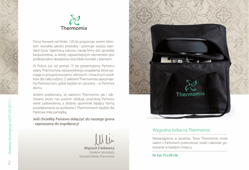 Firma Vorwerk od blisko 130 lat proponuje swoim klientom wysokiej jakości produkty i promuje wyższy standard życia. Tajemnicą sukcesu naszej firmy jest sprzedaż bezpośrednia, w której najważniejszym elementem jest profesjonalne doradztwo oraz bliski kontakt z klientem. Katalog obowiązuje od 01.03.2011 r. W Polsce już od ponad 15 lat prezentujemy Państwu zalety Thermomixa, niezawodnego urządzenia, które pomaga w przygotowywaniu zdrowych i smacznych posiłków dla całej rodziny. Z zaletami Thermomixa zapoznajemy Państwa tam, gdzie będzie on używany – w Państwa domu. 2 Jestem przekonany, że zarówno Thermomix, jak i oferowany przez nas poziom obsługi, przyniosą Państwu wiele zadowolenia, a drobny upominek będący formą podziękowania za spotkanie z Thermomixem będzie dla Państwa miłą pamiątką. Jeśli chcieliby Państwo dołączyć do naszego grona - zapraszamy do współpracy! Wygodna torba na Thermomix Wojciech Ćmikiewicz Dyrektor Sprzedaży Vorwerk Polska Thermomix Niezastąpiona w podróży. Teraz Thermomix może razem z Państwem przemierzać świat i ułatwiać gotowanie w każdym miejscu. Nr kat. PLL09106