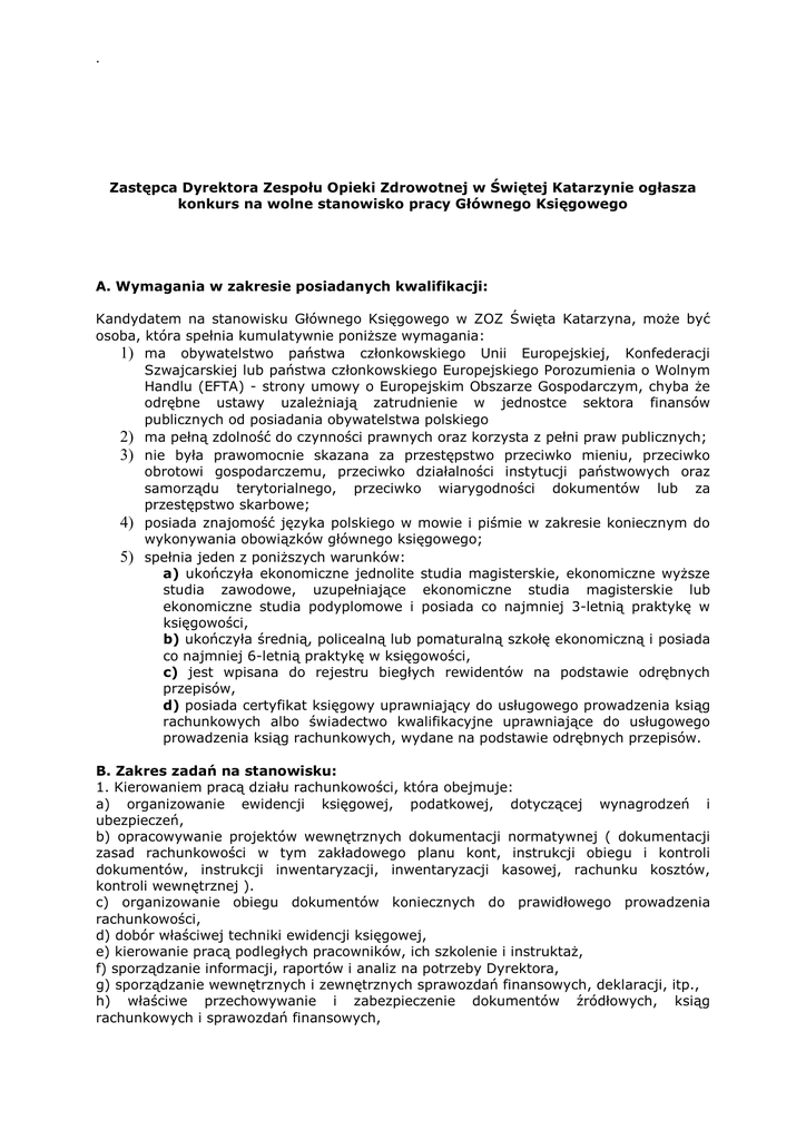 . Zastępca Dyrektora Zespołu Opieki Zdrowotnej w Świętej Katarzynie ogłasza konkurs na wolne stanowisko pracy Głównego Księgowego A. Wymagania w zakresie posiadanych kwalifikacji: Kandydatem na stanowisku Głównego Księgowego w ZOZ Święta Katarzyna, moŜe być osoba, która spełnia kumulatywnie poniŜsze wymagania: 1) ma obywatelstwo państwa członkowskiego Unii Europejskiej, Konfederacji Szwajcarskiej lub państwa członkowskiego Europejskiego Porozumienia o Wolnym Handlu (EFTA) - strony umowy o Europejskim Obszarze Gospodarczym, chyba Ŝe odrębne ustawy uzaleŜniają zatrudnienie w jednostce sektora finansów publicznych od posiadania obywatelstwa polskiego 2) ma pełną zdolność do czynności prawnych oraz korzysta z pełni praw publicznych; 3) nie była prawomocnie skazana za przestępstwo przeciwko mieniu, przeciwko obrotowi gospodarczemu, przeciwko działalności instytucji państwowych oraz samorządu terytorialnego, przeciwko wiarygodności dokumentów lub za przestępstwo skarbowe; 4) posiada znajomość języka polskiego w mowie i piśmie w zakresie koniecznym do wykonywania obowiązków głównego księgowego; 5) spełnia jeden z poniŜszych warunków: a) ukończyła ekonomiczne jednolite studia magisterskie, ekonomiczne wyŜsze studia zawodowe, uzupełniające ekonomiczne studia magisterskie lub ekonomiczne studia podyplomowe i posiada co najmniej 3-letnią praktykę w księgowości, b) ukończyła średnią, policealną lub pomaturalną szkołę ekonomiczną i posiada co najmniej 6-letnią praktykę w księgowości, c) jest wpisana do rejestru biegłych rewidentów na podstawie odrębnych przepisów, d) posiada certyfikat księgowy uprawniający do usługowego prowadzenia ksiąg rachunkowych albo świadectwo kwalifikacyjne uprawniające do usługowego prowadzenia ksiąg rachunkowych, wydane na podstawie odrębnych przepisów. B. Zakres zadań na stanowisku: 1. Kierowaniem pracą działu rachunkowości, która obejmuje: a) organizowanie ewidencji księgowej, podatkowej, dotyczącej wynagrodzeń i ubezpieczeń, b) opracowywanie projektów wewnętrznych dokumentacji normatywnej ( dokumentacji zasad rachunkowości w tym zakładowego planu kont, instrukcji obiegu i kontroli dokumentów, instrukcji inwentaryzacji, inwentaryzacji kasowej, rachunku kosztów, kontroli wewnętrznej ). c) organizowanie obiegu dokumentów koniecznych do prawidłowego prowadzenia rachunkowości, d) dobór właściwej techniki ewidencji księgowej, e) kierowanie pracą podległych pracowników, ich szkolenie i instruktaŜ, f) sporządzanie informacji, raportów i analiz na potrzeby Dyrektora, g) sporządzanie wewnętrznych i zewnętrznych sprawozdań finansowych, deklaracji, itp., h) właściwe przechowywanie i zabezpieczenie dokumentów źródłowych, ksiąg rachunkowych i sprawozdań finansowych, i) przeciwdziałanie nieprawidłowością w dokumentacji, ewidencji i sprawozdawczości finansowej i podatkowej. 2. Wykonywanie wewnętrznej kontroli finansowej, 3. Opracowywanie analiz ekonomiczno – finansowych dotyczących sytuacji majątku, finansów, rentowności i płynności Zakładu oraz diagnozowanie systemu ekonomicznofinansowego i przedstawianie Dyrektorowi wyników tej oceny, wskazywanie na ewentualne zagroŜenia /bariery oraz prowadzenie działań w tym zakresie. 4. Opracowywanie projektów planów finansowych oraz współudział w opracowywaniu planów rozwoju zakładu. 5. Opiniowanie umów, kontraktów i porozumień zawieranych przez zakład, ich zgodność z obowiązującymi regulacjami prawnymi (finansowymi i podatkowymi ), 6. Dokonywanie wstępnej kontroli zgodności operacji gospodarczych i finansowych z planem finansowym oraz dokonywanie wstępnej kontroli kompletności i rzetelności dokumentów dotyczących operacji gospodarczych i finansowych. C. Wymagane od kandydata dokumenty: a) list motywacyjny, b) Ŝyciorys ze szczegółowym przebiegiem kariery zawodowej, c) kserokopia świadectwa pracy oraz dokumentów potwierdzających praktykę w księgowości, d) kserokopię dyplomu ukończenia studiów wyŜszych oraz dokumentu potwierdzającego wymagane wykształcenie lub staŜ pracy ( potwierdzone za zgodność z oryginałem przez kandydata ), e) kserokopia dowodu osobistego lub innego dokumentu poświadczającego obywatelstwo polskie, f) oświadczenie o posiadaniu pełnej zdolności do czynności prawnych oraz korzystania w pełni z praw publicznych, g) oświadczenie o niekaralności, h) zaświadczenie o stanie zdrowia, Wymagane dokumenty aplikacyjne: podanie-list motywacyjny, Ŝyciorys zawodowy ( z uwzględnieniem dokładnego przebiegu kariery zawodowej ) , powinny być opatrzone klauzulą – „WyraŜam zgodę na przetwarzanie moich danych osobowych zawartych w ofercie pracy dla potrzeb niezbędnych do realizacji procesu rekrutacji zgodnie z ustawą z dnia 29 sierpnia 1997 r. o ochronie danych osobowych ( Dz.U. z 20202 r., Nr 101, poz. 926, z poź. zm. )”. - „ W przypadku nie zakwalifikowania mnie do danego etapu rekrutacji dokumenty aplikacyjne proszę odesłać na adres ….” Gdzie po słowie adres „ naleŜy wskazać adres na który maja być odesłane. Podanie i oferty pracy naleŜy składać w zamkniętych kopertach z opisem „oferta pracy na stanowisko Głównego Księgowego” w Zespole Opieki Zdrowotnej w Świętej Katarzynie , ul.śeromskiego 1 w pokoju nr 107 – Sekretariat I piętro, w terminie 30 kwietnia 2012 r.. Podania złoŜone po tym terminie lub nie spełniające wymogów formalnych nie będą brane pod uwagę przy rozpatrywaniu. 2