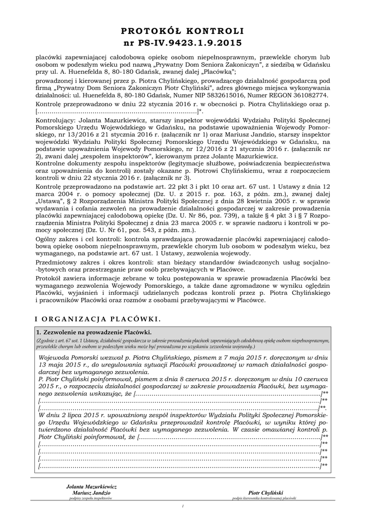 PROTOKÓŁ KONTROLI nr PS-IV.9423.1.9.2015 placówki zapewniającej całodobową opiekę osobom niepełnosprawnym, przewlekle chorym lub osobom w podeszłym wieku pod nazwą „Prywatny Dom Seniora Zakoniczyn”, z siedzibą w Gdańsku przy ul. A. Huenefelda 8, 80-180 Gdańsk, zwanej dalej „Placówką”; prowadzonej i kierowanej przez p. Piotra Chylińskiego, prowadzącego działalność gospodarczą pod firmą „Prywatny Dom Seniora Zakoniczyn Piotr Chyliński”, adres głównego miejsca wykonywania działalności: ul. Huenefelda 8, 80-180 Gdańsk, Numer NIP 5832615016, Numer REGON 361082774. Kontrolę przeprowadzono w dniu 22 stycznia 2016 r. w obecności p. Piotra Chylińskiego oraz p. [……………………………………………………………………]*. Kontrolujący: Jolanta Mazurkiewicz, starszy inspektor wojewódzki Wydziału Polityki Społecznej Pomorskiego Urzędu Wojewódzkiego w Gdańsku, na podstawie upoważnienia Wojewody Pomorskiego, nr 13/2016 z 21 stycznia 2016 r. (załącznik nr 1) oraz Mariusz Jandzio, starszy inspektor wojewódzki Wydziału Polityki Społecznej Pomorskiego Urzędu Wojewódzkiego w Gdańsku, na podstawie upoważnienia Wojewody Pomorskiego, nr 12/2016 z 21 stycznia 2016 r. (załącznik nr 2), zwani dalej „zespołem inspektorów”, kierowanym przez Jolantę Mazurkiewicz. Kontrolne dokumenty zespołu inspektorów (legitymacje służbowe, poświadczenia bezpieczeństwa oraz upoważnienia do kontroli) zostały okazane p. Piotrowi Chylińskiemu, wraz z rozpoczęciem kontroli w dniu 22 stycznia 2016 r. (załącznik nr 3). Kontrolę przeprowadzono na podstawie art. 22 pkt 3 i pkt 10 oraz art. 67 ust. 1 Ustawy z dnia 12 marca 2004 r. o pomocy społecznej (Dz. U. z 2015 r. poz. 163, z późn. zm.), zwanej dalej „Ustawą”, § 2 Rozporządzenia Ministra Polityki Społecznej z dnia 28 kwietnia 2005 r. w sprawie wydawania i cofania zezwoleń na prowadzenie działalności gospodarczej w zakresie prowadzenia placówki zapewniającej całodobową opiekę (Dz. U. Nr 86, poz. 739), a także § 4 pkt 3 i § 7 Rozporządzenia Ministra Polityki Społecznej z dnia 23 marca 2005 r. w sprawie nadzoru i kontroli w pomocy społecznej (Dz. U. Nr 61, poz. 543, z późn. zm.). Ogólny zakres i cel kontroli: kontrola sprawdzająca prowadzenie placówki zapewniającej całodobową opiekę osobom niepełnosprawnym, przewlekle chorym lub osobom w podeszłym wieku, bez wymaganego, na podstawie art. 67 ust. 1 Ustawy, zezwolenia wojewody. Przedmiotowy zakres i okres kontroli: stan bieżący standardów świadczonych usług socjalno-bytowych oraz przestrzeganie praw osób przebywających w Placówce. Protokół zawiera informacje zebrane w toku postępowania w sprawie prowadzenia Placówki bez wymaganego zezwolenia Wojewody Pomorskiego, a także dane zgromadzone w wyniku oględzin Placówki, wyjaśnień i informacji udzielanych podczas kontroli przez p. Piotra Chylińskiego i pracowników Placówki oraz rozmów z osobami przebywającymi w Placówce. I ORGANIZACJA PLACÓWKI. 1. Zezwolenie na prowadzenie Placówki. (Zgodnie z art. 67 ust. 1 Ustawy, działalność gospodarcza w zakresie prowadzenia placówek zapewniających całodobową opiekę osobom niepełnosprawnym, przewlekle chorym lub osobom w podeszłym wieku może być prowadzona po uzyskaniu zezwolenia wojewody.) Wojewoda Pomorski wezwał p. Piotra Chylińskiego, pismem z 7 maja 2015 r. doręczonym w dniu 13 maja 2015 r., do uregulowania sytuacji Placówki prowadzonej w ramach działalności gospodarczej bez wymaganego zezwolenia. P. Piotr Chyliński poinformował, pismem z dnia 8 czerwca 2015 r. doręczonym w dniu 10 czerwca 2015 r., o rozpoczęciu działalności gospodarczej w zakresie prowadzenia Placówki, bez wymaganego zezwolenia wskazując, że [……………………………………………………………………………....]** [……………………………………………………………………………………………………………….……….]** [……………………………………………………………………………………………………………………….]**. W dniu 2 lipca 2015 r. upoważniony zespół inspektorów Wydziału Polityki Społecznej Pomorskiego Urzędu Wojewódzkiego w Gdańsku przeprowadził kontrolę Placówki, w wyniku której potwierdzono działalność Placówki bez wymaganego zezwolenia. W czasie omawianej kontroli p. Piotr Chyliński poinformował, że [……………………………………………………………………………..]** [……………………………………………………………………………………………………………………..…]** [……………………………………………………………………………………………………………………..…]** [……………………………………………………………………………………………………………………..…]** [……………………………………………………………………………………………………………………..…]** Jolanta Mazurkiewicz Mariusz Jandzio Piotr Chyliński podpisy zespołu inspektorów podpis kierownika kontrolowanej placówki 1 Protokół nr PS-IV.9423.1.9.2015 z przeprowadzonej 22 stycznia 2016 r. kontroli standardu świadczonych usług przez placówkę zapewniającą całodobową opiekę osobom niepełnosprawnym, przewlekle chorym lub osobom w podeszłym wieku pod nazwą „Prywatny Dom Seniora Zakoniczyn”, z siedzibą w Gdańsku przy ul. A. Huenefelda 8, 80-180 Gdańsk. [……………………………………………………………………………………………………………………..…]** [……………………………………………………………………………………………………………………..…]** [……………………………………………………………