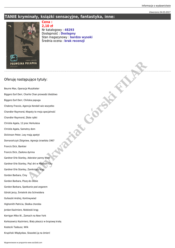 Informacje o wydawnictwie Utworzono 04-03-2017 TANIE kryminały, książki sensacyjne, fantastyka, inne: Cena : 2,10 zł LA R Nr katalogowy : 48293 Dostępność : Dostępny Stan magazynowy : bardzo wysoki Średnia ocena : brak recenzji FI Oferuję następujące tytuły: Beurre Max, Operacja Muszkieter sk i Biggers Earl Derr, Charlie Chan prowadzi śledztwo Biggers Earl Derr, Chińska papuga Chandler Raymond, Kłopoty to moja specjalność G Chandler Raymond, Złote rybki Christie Agata, 12 prac Herkulesa ar ia t Christie Agata, Samotny dom Dickinson Peter, Lwy mają apetyt Domarańczyk Zbigniew, Agresja izraelska 1967 ty k w Francis Dick, Bankier Francis Dick, Zasłona dymna Gardner Erle Stanley, Adorator panny West Gardner Erle Stanley, Pięć dni w Madison City An Gardner Erle Stanley, Zamknięty krąg Gordon Barbara, Ćmy Gordon Barbara, Piszę do ciebie Gordon Barbara, Spotkanie pod zegarem Górski Jerzy, Śmietnik dra Schneidera Guliaszki Andrej, Kontrwywiad Highsmith Patricia, Słodka choroba Jordan Kazimierz, Niebieski krąg Kerrigan Mike W., Zamach na New York Korkozowicz Kazimierz, Biały płaszcz w brązową kratę Kostecki Tadeusz, Wilk Krupiński Włądysław, Skazałeś ją na śmierć Wygenerowano w programie www.oscGold.com ór Chabrey Fracois, Agencja Kendall wie wszystko Krzysztoń Barbara, Agata Krzysztoń Barbara, Karolino nie przeszkadzaj Lembowicz Tadeusz, Złota czasza księcia Bogusława Marciniak Jerzy, Uwaga komunikat nadzwyczajny Marczyński Antoni, Kłopoty ze spadkiem McClure James, Lamparty północy Milc Stanisłw, Co się zdarzyło Królewnie śnieżce Minkowski Aleksander, Wyznania odszczepieńca Morena Artur, Czas zatrzymuje się dla umarłych Nienacki Zbigniew, Laseczka i tajemnica R Odrowąż-Pieniążek Janusz, Cocktail u księżney Gieorgijew LA Piecuch Henryk, Czas szpiegów Scerbanenco Giorgio, Zabiję cię 12 listopada FI Siewierski Jerzy, Nie zabija się Świętego Mikołaja Szafar Tadeusz, Dien Bien Phu sk i Toster Lena, Krzesełka lorda Blotton Wilnowski Kazimierz, Gorąca linia ór każdy egz. w cenie: An ar ia t ty k w Zweryfikowane: Tak. Wydawnictwo zwarte: Tak. G Dostępne opcje TANIE kryminały, książki sensacyjne, fantastyka, inne: