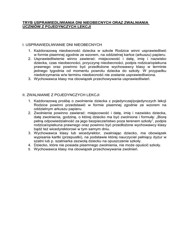 TRYB USPRAWIEDLIWIANIA DNI NIEOBECNYCH ORAZ ZWALNIANIA UCZNIÓW Z POJEDYNCZYCH LEKCJI I. USPRAWIEDLIWIANIE DNI NIEOBECNYCH 1. Każdorazową nieobecność dziecka w szkole Rodzice winni usprawiedliwić w formie pisemnej zgodnie ze wzorem, na oddzielnej kartce (arkuszu) papieru. 2. Usprawiedliwienie winno zawierać: miejscowość i datę, imię i nazwisko dziecka, czas nieobecności, przyczynę nieobecności, podpis rodzica/opiekuna prawnego oraz powinno być przedłożone wychowawcy klasy w terminie jednego tygodnia od momentu powrotu dziecka do szkoły. W przypadku niedotrzymania w/w terminu nieobecność nie zostanie usprawiedliwiona. 3. Wychowawca klasy ma obowiązek przechowywania usprawiedliwień. II. ZWALNIANIE Z POJEDYNCZYCH LEKCJI 1. Każdorazową prośbę o zwolnienie dziecka z pojedynczej/pojedynczych lekcji Rodzice powinni przedstawić w formie pisemnej zgodnie ze wzorem na oddzielnym arkuszu papieru. 2. Zwolnienie powinno zawierać: miejscowość i datę, imię i nazwisko dziecka, datę zwolnienia, godzinę, o której dziecko ma być zwolnione i formułę: „Biorę pełną odpowiedzialność za jego bezpieczeństwo poza terenem szkoły”, podpis rodzica/opiekuna prawnego oraz powinno być przedłożone wychowawcy klasy bądź też wicedyrektorowi w tym samym dniu. 3. Wychowawca klasy lub wicedyrektor, zwalniając dziecko, ma obowiązek wypisania kartki (przepustki), na podstawie której nauczyciel pełniący dyżur w szatni lub p. szatniarka zezwolą dziecku na opuszczenie szkoły. 4. Dziecko, które nie posiada pisemnego zwolnienia, nie może opuścić szkoły. 5. Wychowawca klasy ma obowiązek przechowywania zwolnień .