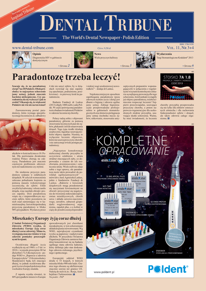 : eru r nąt e un b i r T m z nu t 1WewplanNews Im DENTAL TRIBUNE DENTAL TRIBUNE Polish Edition The World’s Dental Newspaper · Polish Edition ISSN 1730-315X www.dental-tribune.com VOL. 11, NR 3+4 CENA: 9,50 zł Opinie News Wydarzenia Diagnostyka HIV w gabinecie dentystycznym Wiele przyczyn halitozy Targi Stomatologiczne Krakdent® 2013 Strona 2 Strona 5 Zaawansowaną postać paradontozy, która wymaga specjalistycznego leczenia (m.in. odbudowy Lighthunter/Shutterstock.com ubytków w kościach) ma co 10. Polak. Dla porównania dwukrotnie rzadziej Polacy chorują na cukrzycę. Paradontoza jest znacznie częstszym problemem zdrowotnym niż nadciśnienie czy otyłość. Do niedawna przyczyn paradontozy szukano w osłabionych dziąsłach. W celu ich wzmocnienia zalecano pobudzanie krążenia za pomocą masażu wykonywanego szczoteczką do zębów. Efekt zwykle był odwrotny: włosie raniło dziąsła, więc nasilało obrzęk i proces zapalny. Dziś paradontozę wiąże się z nieprawidłowym myciem zębów, które pozostawia na nich osad zamieniający się w kamień nazębny. Jest on bezpośrednią przyczyną parodontozy w blisko 90% przypadków. Wystarczy przez 4 dni nie umyć zębów, by w dziąsłach rozwinął się stan zapalny (są opuchnięte, podrażnione, przekrwione) – to pierwszy krok ku paradontozie. Badania Fundacji dr Laskus (2013) objęły 1000 osób z całej Polski. W części poświęconej paradontozie zbadano świadomość Polaków w zakresie leczenia tej choroby. Polacy radzą sobie z objawami paradontozy głównie za pomocą stosowania leczniczych past do zębów, płukanek i żeli do smarowania dziąseł. Tego typu środki działają aseptycznie, łagodzą i usuwają niektóre objawy zapalne. Niestety, to wyłącznie leczenie objawowe, które nie usuwa przyczyny choroby i nie zatrzymuje trwale postępu paradontozy. „Najczęstsze konsekwencje nieleczonej choroby przyzębia to oczywiście osłabienie i utrata struktur otaczających zęby, co doprowadza z czasem do ich rozchwiania, przemieszczenia i ostatecznie utraty. Wiele osób nie zdaje sobie z tego sprawy, ale paradontoza może także prowadzić do powikłań ogólnoustrojowych” – mówi dr n. med. Agnieszka Laskus, jeden z fundatorów Fundacji dr Laskus. „Bakterie z kieszonek dziąsłowych mogą przedostawać się naczyniami krwionośnymi na obwód i przyczyniać się negatywnie do tworzenia mikrozakrzepów, zmian miażdżycowych, chorób serca i układu sercowo-naczyniowego, zawałów, zaburzeń gospodarki węglowodanowej organizmu, zapaleń płuc, a u kobiet w ciąży do przedwczesnych porodów Mieszkańcy Europy żyją coraz dłużej Z badań Światowej Organizacji Zdrowia (WHO) wynika, że mieszkańcy Europy żyją coraz dłużej i coraz zdrowiej. Mimo to, występują znaczne różnice w tym zakresie pomiędzy poszczególnymi krajami. Oczekiwana długość życia wydłużyła się od 1980 r. o 5 lat i w 2010 r. wyniosła przeciętnie 80 lat dla kobiet i 72,5 dla mężczyzn – podaje WHO w „Raporcie o zdrowiu Europejczyków”. O ile mieszkańcy Skandynawii będą żyli znacząco dłużej, to jednak oczekiwana długość życia w krajach położonych na wschodzie Europy zmalała. Z raportu wynika również, że 80% przypadków śmierci w Europie spowodowanych jest chorobami niezakaźnymi, w tym schorzeniami układu krążenia i nowotworami. Wg WHO, największymi czynnikami ryzyka są papierosy i nadużywanie alkoholu. W przyszłości Światowa Organizacja Zdrowia zamierza bardziej koncentrować się na badaniu ogólnego stanu zdrowia ludności, który definiuje jako stan doskonałego zdrowia cielesnego, psychicznego i społecznego. Europejski oddział WHO działa w 53 krajach, w których mieszka blisko 900 mln ludzi. Granice tego obszaru są zdefiniowane znacznie szerzej niż granice UE. Należą do nich m.in.: Rosja, Azerbejdżan i Turkmenistan. DT Na podst.: PAP i niskiej wagi urodzeniowej noworodków” – dodaje dr Laskus. Najskuteczniejszym sposobem zapobiegania paradontozie (poza zdrowym trybem życia i dietą) jest dbanie o higienę i zdrowie ogólne jamy ustnej. Zabiegi higienizacyjne przeprowadzane profesjonalnie w gabinetach stomatologicznych oraz domowa pielęgnacja jamy ustnej (technika mycia zębów, nitkowanie, stosowanie anty- 6 AD Paradontozę trzeba leczyć! Szacuje się, że na paradontozę cierpi 7 na 10 Polaków. Obok próchnicy to najczęstsze schorzenie jamy ustnej, jednak znacznie bardziej niebezpieczne. Czy paradontozę da się wyleczyć i jak to zrobić? Okazuje się, że większość Polaków nie wie nic na ten temat! Strona septycznych preparatów wspomagających) w połączeniu z regularnymi wizytami kontrolnymi u lekarza są najlepszą prewencją dla tego schorzenia. Jeżeli jednak wystąpiły już objawy parodontozy, trzeba koniecznie rozpocząć leczenie! Najpierw przeciwzapalne, usuwające przyczyny choroby, a potem naprawczo-regeneracyjne dla uszkodzonych struktur przyzębia, usuwające skutki schorzenia. Ważne, by mieć świadomość, że leczenie choroby przyzębia przeprowadza się nie tylko dla efektów estetycznych uśmiechu i dla zachowania funkcjonalności zębów i dziąseł, ale także zdrowia całego organizmu. DT AD 2 DENTAL TRIBUNE Opinie Polish Edition Testy i badania przesiewowe w kierunku HIV w gabinecie stomatologicznym Stephen N. Abel, Carrigan L. Parish i Lisa R. Metsch, USA Na całym świecie ok. 34 mln ludzi żyje z HIV/AIDS. 2,5 mln nowych osób co roku zaraża się wirusem HIV. Wg szacunków Centers for Disease Control and Prevention (CDC) tylko USA żyje z HIV/AIDS ok. 1,14 miliona osób w wieku powyżej 13 lat, z czego 207 600 (18,1%) nie wie o swoim zakażeniu. Co roku wirusem HIV zaraża się 40 000-50 000 Amerykanów. Liczba ta utrzymywała się w ciągu ostatnich 10 lat na stosunkowo stałym poziomie. Badania wykazują, że uzyskawszy dodatni wynik ba- z 2006 r. usunęły 2 główne przeszkody, utrudniające szybkie przeprowadzanie badań w