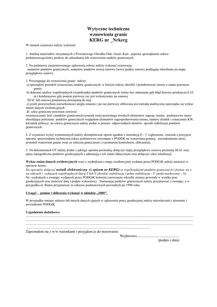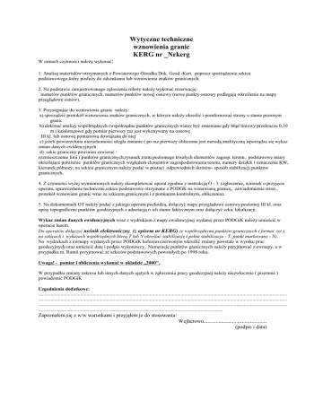 Wytyczne techniczne wznowienia granic KERG nr _Nrkerg W ramach czynności naleŜy wykonać: 1. Analizę materiałów otrzymanych z Powiatowego Ośrodka Dok. Geod.-Kart. poprzez sporządzenie szkicu podstawowego,który posłuŜy do odszukania lub wznowienia znaków granicznych. 2. Na podstawie zarejestrowanego zgłoszenia roboty naleŜy wykonać rezerwację: numerów punktów granicznych, numerów punktów nowej osnowy (nowe punkty osnowy podlegają wkreśleniu na mapy przeglądowe osnów). 3. Przystępując do wznowienia granic naleŜy: a) sporządzić protokół wznowienia znaków granicznych, w którym naleŜy określić i poinfornować strony o stanie prawnym granic b) dokonać analizy współrzędnych (współrzędne punktów granicznych winny być zmieniane gdy błąd liniowy przekracza 0,10 m i kaŜdorazowo gdy pomiar pierwszy raz jest wykonywany na osnowę III kl. lub osnowę pomiarową dowiązaną do niej c) jeŜeli powierzchnia nieruchomości uległa zmianie ( po raz pierwszy obliczona jest metodą analityczną )sporządza się wykaz zmian danych ewidencyjnych d) szkic graniczny powinien zawierać : rozmieszczenie linii i punktów granicznych,rysunek rzutu poziomego trwałych elementów zagosp. terenu, podstawowe miary określające połoŜenie punktów granicznych względem elementów zagospodarowania terenu, numery działek i oznaczenie KW, kierunek północy; na szkicu granicznym naleŜy podać w postaci odpowiednich skrótów- sposób stabilizacji punktów granicznych. 4. Z czynności wyŜej wymienionych naleŜy skompletować operat zgodnie z instrukcją O - 3 (zgłoszenie, wniosek o przyjęcie operatu, sprawozdanie techniczne,szkice podstawowe otrzymane z PODGK na wznawianą granicę, zawiadomienia stron , protokół wznowieni granic wraz ze szkicem granicznym i z pomiarem kontrolnym, obliczenia). 5. Na dokumentach OT naleŜy podać z jakiego operatu pochodzą, dołączyć mapy przeglądowe osnowy poziomej III kl. oraz opisy topograficzne punktów geodezyjnych z adnotacją o ich stanie faktycznym oraz dołączyć szkic lokalizacji. Wykaz zmian danych ewidencyjnych wraz z wydrukiem z mapy ewidencyjnej wydanej przez PODGiK naleŜy umieścić w operacie luzem. Do operatów dołączyć nośnik elektroniczny (z opisem nr KERG) ze współrzędnymi punktów granicznych ( format .txt ), na szkicach i wykazach współrzędnych literą T lub N określać stabilizację ( pełna stabilizacja - T, punkt markowany - N). Na wydrukach z ewmapy wydanych przez PODGiK kolorem czerwonym wkreślić zmiany powstałe w wyniku prac geodezyjnych oraz umieścić datę i podpis wykonawcy . Numerację punktów granicznych naleŜy przyjmować z ewmapy, a w przypadku m. Rumii przyjmować ze szkiców podstawowych powstałych po 1998 roku. Uwaga! - pomiar i obliczenia wykonać w układzie „2000". W przypadku zmiany zakresu lub innych danych ujętych w zgłoszeniu pracy geodezyjnej naleŜy niezwłocznie ( pisemnie ) powiadomić PODGiK Uzgodnienia dodatkowe: ......................................................................................................................................................................................................... ......................................................................................................................................................................................................... ......................................................................................................................................................................................................... ..................................................................................................................................................... Zapoznałem się z w/w warunkami i przyjąłem je do stosowania: Wejherowo.............................................. (podpis i data)