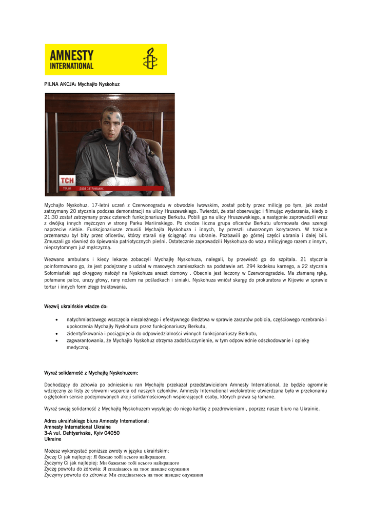 PILNA AKCJA: Mychajło Nyskohuz Mychajło Nyskohuz, 17-letni uczeń z Czerwonogradu w obwodzie lwowskim, został pobity przez milicję po tym, jak został zatrzymany 20 stycznia podczas demonstracji na ulicy Hruszewskiego. Twierdzi, że stał obserwując i filmując wydarzenia, kiedy o 21:30 został zatrzymany przez czterech funkcjonariuszy Berkutu. Pobili go na ulicy Hruszewskiego, a następnie zaprowadzili wraz z dwójką innych mężczyzn w stronę Parku Mariinskiego. Po drodze liczna grupa oficerów Berkutu uformowała dwa szeregi naprzeciw siebie. Funkcjonariusze zmusili Mychajła Nyskohuza i innych, by przeszli utworzonym korytarzem. W trakcie przemarszu był bity przez oficerów, którzy starali się ściągnąć mu ubranie. Pozbawili go górnej części ubrania i dalej bili. Zmuszali go również do śpiewania patriotycznych pieśni. Ostatecznie zaprowadzili Nyskohuza do wozu milicyjnego razem z innym, nieprzytomnym już mężczyzną. Wezwano ambulans i kiedy lekarze zobaczyli Mychajłę Nyskohuza, nalegali, by przewieźć go do szpitala. 21 stycznia poinformowano go, że jest podejrzany o udział w masowych zamieszkach na podstawie art. 294 kodeksu karnego, a 22 stycznia Sołomiański sąd okręgowy nałożył na Nyskohuza areszt domowy . Obecnie jest leczony w Czerwonogradzie. Ma złamaną rękę, połamane palce, urazy głowy, rany nożem na pośladkach i siniaki. Nyskohuza wniósł skargę do prokuratora w Kijowie w sprawie tortur i innych form złego traktowania. Wezwij ukraińskie władze do: natychmiastowego wszczęcia niezależnego i efektywnego śledztwa w sprawie zarzutów pobicia, częściowego rozebrania i upokorzenia Mychajły Nyskohuza przez funkcjonariuszy Berkutu, zidentyfikowania i pociągnięcia do odpowiedzialności winnych funkcjonariuszy Berkutu, zagwarantowania, że Mychajło Nyskohuz otrzyma zadośćuczynienie, w tym odpowiednie odszkodowanie i opiekę medyczną. Wyraź solidarność z Mychajłą Nyskohuzem: Dochodzący do zdrowia po odniesieniu ran Mychajło przekazał przedstawicielom Amnesty International, że będzie ogromnie wdzięczny za listy ze słowami wsparcia od naszych członków. Amnesty International wielokrotnie utwierdzana była w przekonaniu o głębokim sensie podejmowanych akcji solidarnościowych wspierających osoby, których prawa są łamane. Wyraź swoją solidarność z Mychajłą Nyskohuzem wysyłając do niego kartkę z pozdrowieniami, poprzez nasze biuro na Ukrainie. Adres ukraińskiego biura Amnesty International: Amnesty International Ukraine 3-A vul. Dehtyarivska, Kyiv 04050 Ukraine Możesz wykorzystać poniższe zwroty w języku ukraińskim: Życzę Ci jak najlepiej: Я бажаю тобі всього найкращого, Życzymy Ci jak najlepiej: Ми бажаємо тобі всього найкращого Życzę powrotu do zdrowia: Я сподіваюсь на твоє швидке одужання Życzymy powrotu do zdrowia: Ми сподіваємось на твоє швидке одужання ADRESY: Markijan Malskyj Ambasador Nadzwyczajny i Pełnomocny Ukrainy w Rzeczypospolitej Polskiej Ambasada Ukrainy w Rzeczypospolitej Polskiej Al. J. Ch. Szucha 7 00-580 Warszawa Polska PRESIDENT VICTOR YANUKOVYCH VUL. BANKOVAYA 11 01220 KYIV UKRAINE TEL: +380 44 255 78 00 (INFO PHONE FOR THE CITIZENS) PRESIDENTIAL ADMINISTRATION: +380 44 255 68 51 FAX: +38 44 255 61 61 EMAIL: INFORM@АPU.GOV.UA SALUTATION: DEAR PRESIDENT PROSECUTOR GENERAL VIKTOR PAVLOVICH PSHONKA VUL. RIZNITSKA 13/15 01601 KYIV UKRAINE TEL: +380 44 200 7574 FAX: + 380 44 280 2603 EMAIL: [email protected] SALUTATION: DEAR PROSECUTOR GENERAL MINISTER OF INTERNAL AFFAIRS VITALIY ZAKHARCHENKO VUL. AKADEMIKA BOGOMOLTSA 10 01024 KYIV UKRAINE TEL: + 380 44 256 03 33 FAX: +380 44 253 97 96 EMAIL: [email protected] SALUTATION: DEAR MINISTER THE UKRAINIAN PARLIAMENTARY COMMISSIONER FOR HUMAN RIGHTS VALERIA LUTKOVSKA VUL. INSTITUTSKA 21/8 01008 KYIV UKRAINE TEL: +380 44 253 2091 FAX: +380 44 226 3427 EMAIL: [email protected] [email protected]