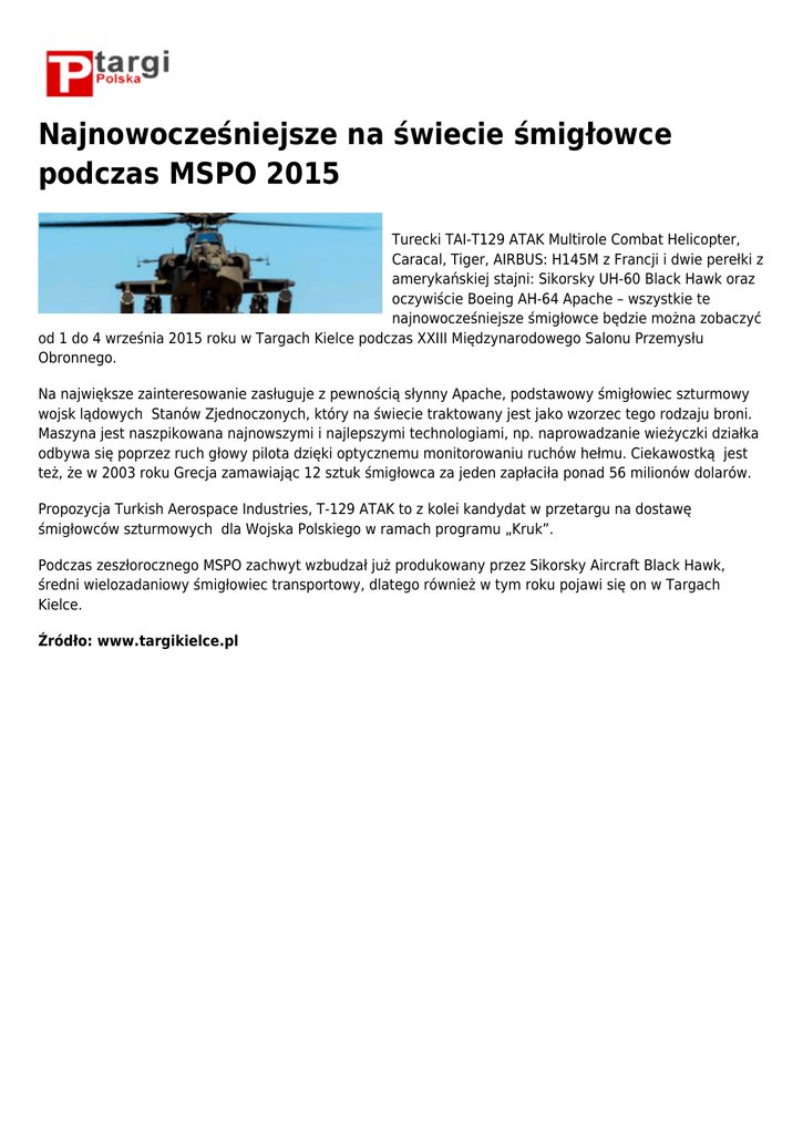 Najnowocześniejsze na świecie śmigłowce podczas MSPO 2015 Turecki TAI-T129 ATAK Multirole Combat Helicopter, Caracal, Tiger, AIRBUS: H145M z Francji i dwie perełki z amerykańskiej stajni: Sikorsky UH-60 Black Hawk oraz oczywiście Boeing AH-64 Apache – wszystkie te najnowocześniejsze śmigłowce będzie można zobaczyć od 1 do 4 września 2015 roku w Targach Kielce podczas XXIII Międzynarodowego Salonu Przemysłu Obronnego. Na największe zainteresowanie zasługuje z pewnością słynny Apache, podstawowy śmigłowiec szturmowy wojsk lądowych Stanów Zjednoczonych, który na świecie traktowany jest jako wzorzec tego rodzaju broni. Maszyna jest naszpikowana najnowszymi i najlepszymi technologiami, np. naprowadzanie wieżyczki działka odbywa się poprzez ruch głowy pilota dzięki optycznemu monitorowaniu ruchów hełmu. Ciekawostką jest też, że w 2003 roku Grecja zamawiając 12 sztuk śmigłowca za jeden zapłaciła ponad 56 milionów dolarów. Propozycja Turkish Aerospace Industries, T-129 ATAK to z kolei kandydat w przetargu na dostawę śmigłowców szturmowych dla Wojska Polskiego w ramach programu „Kruk”. Podczas zeszłorocznego MSPO zachwyt wzbudzał już produkowany przez Sikorsky Aircraft Black Hawk, średni wielozadaniowy śmigłowiec transportowy, dlatego również w tym roku pojawi się on w Targach Kielce. Źródło: www.targikielce.pl