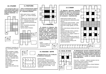 10. Z FILMEM 11. MUZYCZNA Po rozwiązaniu jolki w zacieniowanych polach będzie można odczytać ciągiem rozwiązanie dodatkowe – tytuł filmu. Litery w zacieniowanych rzędach złożą się na rozwiązanie dodatkowe - wizytówkę wokalistki. S - łódzki zespół rockowy („Listopad”, „Spadam”, „Los, cebula i krokodyle łzy”) - „Zakazany owoc dumnie krąży mi nad głową / Zakazany owoc marzeń ciemnych …” (Krzysztof Antkowiak) - nadwykonania dla koncertowej publiczności - Diana, amerykańska piosenkarka soulowa i aktorka - najniższe rejestry fortepianu K Ż C Ń min. 2 5/6 min. 3 9 / 10 - „szkieletowe” przeszkody, bariery utrudniające osiągnięcie celu - drobny przestępca, chuligan - odmiana agatu z naprzemianległymi warstewkami - telebim albo jego składnik - Hanna - pisarka i dziennikarka, Diana - wokalistka i pianistka dżezowa - busz australijski pełen eukaliptusów i akacji - palma iglasta - boczna część czoła - światło lampy lub połysk klejnotów I G K 12. Z PIOSENKĄ Po wpisaniu do diagramu słów pionowych (o jednakowej literze początkowej) pola zacieniowane należy uzupełnić czteroliterowymi wyrazami składającymi się na tytuł piosenki, tak aby w rzędach powstały trzy rzeczowniki pospolite w mianowniku liczby pojedynczej (uznawane będą rozwiązania tylko zgodne z autorskim). 8 2 3 5 1 min. 2 6/7 W diagramie ujawniono wszystkie spółgłoski B i D. Litery w zaznaczonych rzędach oraz litery z pól ponumerowanych od 1 do 11 złożą się na dodatkowe rozwiązanie – wizytówkę Iksa. 1 2 3 9 4 7 - graniczny podatek - imię Leonenko, ukraińskiej pieśniarki i aktorki serialowej („Barwy szczęścia”) - pyton, pomógł Baloo i Bagheerze uwolnić Mowgliego uwięzionego przez lud małp - „ Kochane baby, ach, te baby, … by je łyżkami jadł” 4 5 15. JOLKA, ŻE OHO! ● ● ● ● U min. 2 6/7+3 6 7 8 D 4 1 9 8 - szklista pokrywa kafelka lub ciasta - część wiecznego pióra zdejmowana przed pisaniem - z piosenki tego zespołu pochodzi… motto trudnej jolki turniejowej: „być zagadką, której nikt nie zdąży zgadnąć, nim minie czas” - bardzo cienka tkanina wełniana jak kraina azjatycka - eksplozja radosnego nastroju, zachwytu - skomponował „Cztery pory roku” - koty kojarzące się z czołgami i liderami rozwoju wśród państw - imię Hanny, współzałożyciela wytwórni filmów animowanych (z Josephem Barberą) - element samochodu z kłami - kwadratowy element zdobiący sufit - szpileczka pantofelka Wszystkie litery od 1 do 12 złożą się na dodatkowe rozwiązanie. 11 12 D 14. JOLECZKA - SZYFR min. 1 4/5 10 O I - bunkry - zbiórka na wspólny cel - „sznurkowe” ćwiczenie gimnastyczne 6 13. Z IKSEM I 6 5 7 2 D 3 B 9 10 10 11 11 min. 4 11 / 12 W odgadywanych wyrazach występuje tylko jedna, ta sama spółgłoska. Ujawniono jedyną samogłoskę U. Litery z pól z kropką, odczytane rzędami, złożą się na nazwisko Piotra, tytułowego bohatera pewnego dramatu. Dodatkowe 3 punkty za podanie nazwiska autora tego utworu. - Oscar de la … lub David …, bokserzy zawodowi, byli mistrzowie świata (punkt za każde z nazwisk) - polska sieć telefonii komórkowej - kanadyjski park narodowy położony w Górach Skalistych (podpowiedź w tytule zadania) - jeden z największych światowych portali internetowych - hawajska wyspa z Honolulu