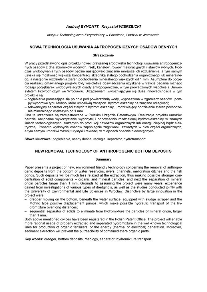 Andrzej EYMONTT, Krzysztof WIERZBICKI Instytut Technologiczno-Przyrodniczy w Falentach, Oddział w Warszawie NOWA TECHNOLOGIA USUWANIA ANTROPOGENICZNYCH OSADÓW DENNYCH Streszczenie W pracy przedstawiono opis projektu nowej, przyjaznej środowisku technologii usuwania antropogenicznych osadów z dna zbiorników wodnych, rzek, kanałów, rowów melioracyjnych i stawów rybnych. Podczas wydobywania tych osadów będzie następowało znacznie mniejsze ich rozluźnienie, a tym samym uzyska się możliwość większej koncentracji składnika stałego pochodzenia organicznego lub mineralnego, a następnie rozdzielenia ziaren pochodzenia mineralnego większych od 1 mm. Asumptem do podjęcia realizacji omawianego projektu były wieloletnie doświadczenia uzyskane w trakcie badania różnego rodzaju pogłębiarek wydobywających osady antropogeniczne, w tym prowadzonych wspólnie z Uniwersytetem Przyrodniczym we Wrocławiu. Urządzeniami wyróżniającymi się dużą innowacyjnością w tym projekcie są: – pogłębiarka poruszająca się po dnie pod powierzchnią wody, wyposażona w zgarniacz osadów i pompy wyporowe typu Mohno, które umożliwią transport hydromieszaniny na znaczne odległości; – sekwencyjny separator części stałych z hydromieszaniny, umożliwiający oddzielenie ziaren pochodzenia mineralnego większych od 1 mm. Oba te urządzenia są zarejestrowane w Polskim Urzędzie Patentowym. Realizacja projektu umożliwi bardziej racjonalne wykorzystanie wydobytej i odpowiednio rozdzielonej hydromieszaniny w znanych liniach technologicznych, służących do produkcji nawozów organicznych lub energii cieplnej bądź elektrycznej. Ponadto wydobycie osadów zapobiegnie zagniwaniu zawartych w nich części organicznych, a tym samym umożliwi rozwój turystyki i rekreacji w miejscach obecnie niedostępnych. Słowa kluczowe: pogłębiarka, osady denne, reologia, separator, hydrotransport NEW REMOVAL TECHNOLOGY OF ANTHROPOGENIC BOTTOM DEPOSITS Summary Paper presents a project of new, environment friendly technology concerning the removal of anthropogenic deposits from the bottom of water reservoirs, rivers, channels, melioration ditches and the fish ponds. Such deposits will be much less relaxed at the extraction, thus making possible stronger concentration of solid components – organic and mineral particles, and next the separation of mineral origin particles larger than 1 mm. Grounds to assuming the project were many years’ experience gained from investigations of various types of dredging’s, as well as the studies conducted jointly with the University of Environmental and Life Sciences in Wrocław. Distinctive by large innovation in the project were: – dredger moving on the bottom, beneath the water surface, equipped with sludge scraper and the Mohno type positive displacement pumps, which make possible hydraulic transport of the hydromixture over long distances; – sequential separator of solids to eliminate from hydromixture the particles of mineral origin, larger than 1 mm. Both above mentioned divices have been registered in the Polish Patent Office. The project will enable more rational usage of properly extracted and separated hydromixture in the well-known technological lines for production of organic fertilizers, or the energy (thermal or electrical) generation. Moreover, sediment extraction will prevent the putrescibility of contained there organic parts. Key words: dredger, bottom deposits, rheology, separator, hydromixture transport