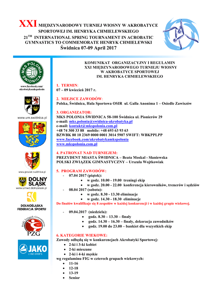 XXI MIĘDZYNARODOWY TURNIEJ WIOSNY W AKROBATYCE SPORTOWEJ IM. HENRYKA CHMIELEWSKIEGO 21 INTERNATIONAL SPRING TOURNAMENT IN ACROBATIC GYMNASTICS TO COMMEMORATE HENRYK CHMIELEWSKI TH Świdnica 07-09 April 2017 KOMUNIKAT ORGANIZACYJNY I REGULAMIN XXI MIĘDZYNARODOWEGO TURNIEJU WIOSNY W AKROBATYCE SPORTOWEJ IM. HENRYKA CHMIELEWSKIEGO 1. TERMIN: 07 – 09 kwiecień 2017 r. 2. MIEJSCE ZAWODÓW: Polska, Świdnica, Hala Sportowa OSIR ul. Galla Anonima 1 – Osiedle Zawiszów 3. ORGANIZATOR: MKS POLONIA ŚWIDNICA 58-100 Świdnica ul. Pionierów 29 e-mail: [email protected] e-mail: [email protected] +48 74 300 33 88 mobile: +48 693 63 93 63 BZWBK 80 10 2369 0000 0001 3014 5907 SWIFT: WBKPPLPP www.facebook.com/akrobatykamkspolonia www.mkspolonia.com.pl 4. PATRONAT NAD TURNIEJEM: PREZYDENT MIASTA ŚWIDNICA – Beata Moskal - Słaniewska POLSKI ZWIĄZEK GIMNASTYCZNY – Urszula Wojtkowiak 5. PROGRAM ZAWODÓW: - 07.04 2017 (piątek): • w godz. 10.00 - 19.00 treningi ekip • w godz. 20.00 - 22.00 konferencja kierowników, trenerów i sędziów - 08.04 2017 (sobota): • w godz. 8.30 - 13.30 eliminacje • w godz. 14.30 - 18.30 eliminacje Do finałów kwalifikuje się 8 zespołów w każdej konkurencji i w każdej grupie wiekowej. - 09.04.2017 • • • (niedziela): godz. 8.30 – 13.30 – finały godz. 14.30 – 16.30 – finały, dekoracja zawodników godz. 19.00 do 23.00 – bankiet dla wszystkich ekip 6. KATEGORIE WIEKOWE: Zawody odbędą się w konkurencjach Akrobatyki Sportowej: • 2-ki i 3-ki kobiet • 2-ki mieszane • 2-ki i 4-ki męskie wg regulaminu FIG w czterech grupach wiekowych: • 11-16 • 12-18 • 13-19 • Senior XXI MIĘDZYNARODOWY TURNIEJ WIOSNY W AKROBATYCE SPORTOWEJ IM. HENRYKA CHMIELEWSKIEGO 21 INTERNATIONAL SPRING TOURNAMENT IN ACROBATIC GYMNASTICS TO COMMEMORATE HENRYK CHMIELEWSKI TH Świdnica 07-09 April 2017 7. ZAKWATEROWANIE: Szczegóły zakwaterowania udostępnimy w terminie do 15 stycznia 2017 r. na stronie internetowej PZG www.pzg.pl oraz na stronie MKS POLONIA Świdnica www.mkspolonia.com.pl 8. FINANSE: Ekipy przyjeżdżają na własny koszt. Startowe w wysokości 70 zł od zawodnika - płatne na konto organizatora lub gotówką przy akredytacji: BZWBK 80 10 2369 0000 0001 3014 5907 SWIFT: WBKPPLPP 9. ZGŁOSZENIA: Przesyłamy na adres e-mail organizatora: [email protected]; [email protected] w terminie do: • wstępne do 15.02.2017 r. z podaniem ilości kobiet i mężczyzn oraz ilości dni pobytu. • ostateczne do 10.03.2017 r. z podaniem imiona i nazwiska zawodnika, konkurencji oraz osób towarzyszących. Opisy układów oraz pliki z muzyką w formacie mp3 przesyłamy do 21.03.2016 na adres e-mail : [email protected] ; [email protected] - 10. UBEZPIECZENIA: Każda ekipa musi posiadać ważne ubezpieczenie OC klubu lub reprezentacji. Każdy zawodnik przy akredytacji musi posiadać aktualne badania lekarskie wg wymogów danego Związku Gimnastycznego. Organizator zapewnia pomoc medyczną na miejscu zawodów. Sędziów powołuje Komitet Organizacyjny Turnieju Wiosny. 11.NAGRODY: Za pierwsze miejsce w każdej konkurencji puchar Za trzy pierwsze miejsca medale Za pozostałe miejsca dyplomy Nagrody rzeczowe dla 3 najlepszych zawodników - wyznaczają sponsorzy Turnieju 12. AKREDYTACJA: 07.04.2017 Hotel Sportowy "Tora" ul. Śląska 31 58-100 Świdnica Wiceprezes Zarządu MKS POLONIA Świdnica Wojciech Pojasek Prezes Zarządu MKS POLONIA Świdnica Piotr Szczygieł