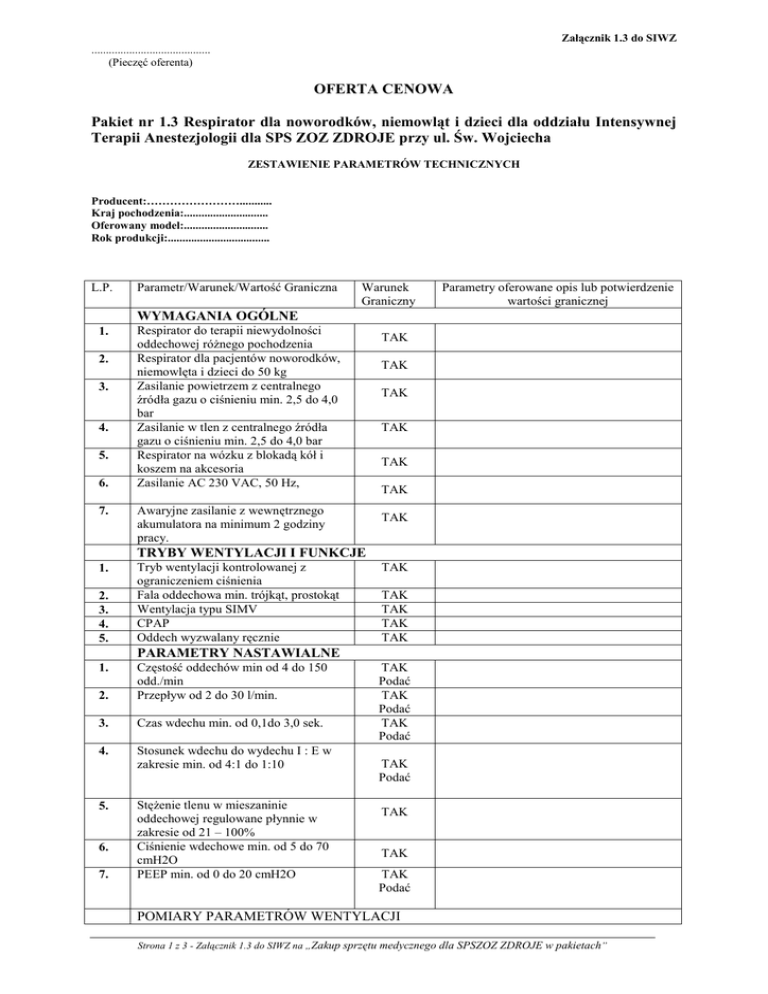 Załącznik 1.3 do SIWZ ......................................... (Pieczęć oferenta) OFERTA CENOWA Pakiet nr 1.3 Respirator dla noworodków, niemowląt i dzieci dla oddziału Intensywnej Terapii Anestezjologii dla SPS ZOZ ZDROJE przy ul. Św. Wojciecha ZESTAWIENIE PARAMETRÓW TECHNICZNYCH Producent:……………………........... Kraj pochodzenia:............................. Oferowany model:............................. Rok produkcji:................................... L.P. Parametr/Warunek/Wartość Graniczna Warunek Graniczny Parametry oferowane opis lub potwierdzenie wartości granicznej WYMAGANIA OGÓLNE 1. 2. 3. 4. 5. 6. 7. Respirator do terapii niewydolności oddechowej róŜnego pochodzenia Respirator dla pacjentów noworodków, niemowlęta i dzieci do 50 kg Zasilanie powietrzem z centralnego źródła gazu o ciśnieniu min. 2,5 do 4,0 bar Zasilanie w tlen z centralnego źródła gazu o ciśnieniu min. 2,5 do 4,0 bar Respirator na wózku z blokadą kół i koszem na akcesoria Zasilanie AC 230 VAC, 50 Hz, Awaryjne zasilanie z wewnętrznego akumulatora na minimum 2 godziny pracy. TAK TAK TAK TAK TAK TAK TAK TRYBY WENTYLACJI I FUNKCJE 1. 2. 3. 4. 5. Tryb wentylacji kontrolowanej z ograniczeniem ciśnienia Fala oddechowa min. trójkąt, prostokąt Wentylacja typu SIMV CPAP Oddech wyzwalany ręcznie TAK TAK TAK TAK TAK PARAMETRY NASTAWIALNE 2. Częstość oddechów min od 4 do 150 odd./min Przepływ od 2 do 30 l/min. 3. Czas wdechu min. od 0,1do 3,0 sek. 4. Stosunek wdechu do wydechu I : E w zakresie min. od 4:1 do 1:10 1. 5. 6. 7. StęŜenie tlenu w mieszaninie oddechowej regulowane płynnie w zakresie od 21 – 100% Ciśnienie wdechowe min. od 5 do 70 cmH2O PEEP min. od 0 do 20 cmH2O TAK Podać TAK Podać TAK Podać TAK Podać TAK TAK TAK Podać POMIARY PARAMETRÓW WENTYLACJI Strona 1 z 3 - Załącznik 1.3 do SIWZ na „Zakup sprzętu medycznego dla SPSZOZ ZDROJE w pakietach” 1. CPAP min. od 0 do 20 cmH2O TAK 2. Wyświetlacz LCD do prezentacji parametrów wentylacji oraz komunikatów Prezentacja ciśnienia chwilowego oraz wdechowego ciśnienia szczytowego Ciągły pomiar ciśnienia w układzie oddechowym pacjenta Całkowita częstość oddychania nastawiona i zmierzona. Średnie ciśnienie w układzie oddechowym Stosunek wdech/wydech I:E liczone Ciśnienie PEEP TAK 3. 4. 5. 6. 7. 8. TAK TAK TAK TAK TAK TAK ALARMY 1. 2. 3. 4. 5. 6. 7. 8. 9. Braku zasilania w energię elektryczną Rozładowania baterii Niskiego ciśnienia tlenu Niskiego ciśnienia powietrza Wysokiego ciśnienia wdechowego Niskiego ciśnienia wdechowego Wysokiej częstości oddechów Bezdechu Opóźnienie alarmu min. od 4 do 12 sek TAK TAK TAK TAK TAK TAK TAK TAK TAK Podać WYPOSAśENIE 1. 2. NawilŜacz termiczny z uchwytem z automatyczną kontrolą temperatury i podgrzewaniem układu pacjenta z kopułkami dla dzieci Kompletny układ oddechowy wielorazowy podgrzewany na wdechu z pułapką wodną na wydechu dla dzieci TAK TAK WYMAGANIA DODATKOWE 1. 2. 3. 4. 5. 6. 7. 8. 9. Okres pełnej gwarancji na aparat (miesięcy) Dostarczenie Zamawiającemu pełnej Instrukcji Obsługi urządzenia w języku polskim podczas dostawy urządzenia. Aktualny dokument dopuszczający do obrotu – naleŜy dołączyć do oferty. Ilość bezpłatnych przeglądów technicznych w okresie gwarancji (przeglądów) Bezpłatne przeprowadzenie szkoleń personelu z obsługi aparatu po instalacji. Okres zagwarantowania dostępności części zamiennych (lat) Czas reakcji serwisu na zgłoszenie uszkodzenia (godz.) Czas naprawy respiratora nie dłuŜszy niŜ 3 doby, a w przypadku przedłuŜenia czasu naprawy udostępnienie aparatu zastępczego Wyprodukowany w 2009r Min. 24 TAK TAK Min. 1 na rok TAK Min.7 Max 24 TAK TAK Strona 2 z 3 - Załącznik 1.3 do SIWZ na „Zakup sprzętu medycznego dla SPSZOZ ZDROJE w pakietach” Razem netto: ................................... (słownie: ....................................................................................................) Razem brutto: .................................. (słownie: ....................................................................................................) Uwaga: Parametry, których wartość liczbowa określona jest w kolumnie „wartość graniczna” lub, których spełnienie jest konieczne (zaznaczone Tak) stanowią wymagania, których niespełnienie spowoduje odrzucenie oferty. Brak opisu będzie traktowany jako brak danego parametru w oferowanej konfiguracji urządzenia. ………………………......... (miejscowość, data) ...........……………………........…… (podpis i pieczęć osoby upowaŜnionej) Strona 3 z 3 - Załącznik 1.3 do SIWZ na „Zakup sprzętu medycznego dla SPSZOZ ZDROJE w pakietach”