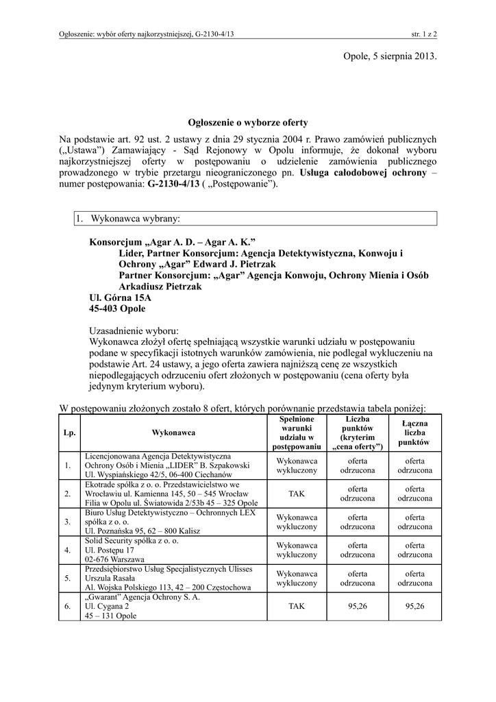 Ogłoszenie: wybór oferty najkorzystniejszej, G-2130-4/13 str. 1 z 2 Opole, 5 sierpnia 2013. Ogłoszenie o wyborze oferty Na podstawie art. 92 ust. 2 ustawy z dnia 29 stycznia 2004 r. Prawo zamówień publicznych („Ustawa”) Zamawiający - Sąd Rejonowy w Opolu informuje, że dokonał wyboru najkorzystniejszej oferty w postępowaniu o udzielenie zamówienia publicznego prowadzonego w trybie przetargu nieograniczonego pn. Usługa całodobowej ochrony – numer postępowania: G-2130-4/13 ( „Postępowanie”). 1. Wykonawca wybrany: Konsorcjum „Agar A. D. – Agar A. K.” Lider, Partner Konsorcjum: Agencja Detektywistyczna, Konwoju i Ochrony „Agar” Edward J. Pietrzak Partner Konsorcjum: „Agar” Agencja Konwoju, Ochrony Mienia i Osób Arkadiusz Pietrzak Ul. Górna 15A 45-403 Opole Uzasadnienie wyboru: Wykonawca złożył ofertę spełniającą wszystkie warunki udziału w postępowaniu podane w specyfikacji istotnych warunków zamówienia, nie podlegał wykluczeniu na podstawie Art. 24 ustawy, a jego oferta zawiera najniższą cenę ze wszystkich niepodlegających odrzuceniu ofert złożonych w postępowaniu (cena oferty była jedynym kryterium wyboru). W postępowaniu złożonych zostało 8 ofert, których porównanie przedstawia tabela poniżej: Lp. 1. 2. 3. 4. 5. 6. Wykonawca Licencjonowana Agencja Detektywistyczna Ochrony Osób i Mienia „LIDER” B. Szpakowski Ul. Wyspiańskiego 42/5, 06-400 Ciechanów Ekotrade spółka z o. o. Przedstawicielstwo we Wrocławiu ul. Kamienna 145, 50 – 545 Wrocław Filia w Opolu ul. Światowida 2/53b 45 – 325 Opole Biuro Usług Detektywistyczno – Ochronnych LEX spółka z o. o. Ul. Poznańska 95, 62 – 800 Kalisz Solid Security spółka z o. o. Ul. Postępu 17 02-676 Warszawa Przedsiębiorstwo Usług Specjalistycznych Ulisses Urszula Rasała Al. Wojska Polskiego 113, 42 – 200 Częstochowa „Gwarant” Agencja Ochrony S. A. Ul. Cygana 2 45 – 131 Opole Spełnione warunki udziału w postępowaniu Liczba punktów (kryterim „cena oferty”) Łączna liczba punktów Wykonawca wykluczony oferta odrzucona oferta odrzucona TAK oferta odrzucona oferta odrzucona Wykonawca wykluczony oferta odrzucona oferta odrzucona Wykonawca wykluczony oferta odrzucona oferta odrzucona Wykonawca wykluczony oferta odrzucona oferta odrzucona TAK 95,26 95,26 Ogłoszenie: wybór oferty najkorzystniejszej, G-2130-4/13 Lp. 7. 8. Wykonawca Konsorcjum „Agar A. D. – Agar A. K.” Lider, Partner Konsorcjum: Agencja Detektywistyczna, Konwoju i Ochrony „Agar” Edward J. Pietrzak Partner Konsorcjum: „Agar” Agencja Konwoju, Ochrony Mienia i Osób Arkadiusz Pietrzak Ul. Górna 15A 45-403 Opole Odnowa spółka z o. o. Ul. Koraszewskiego 8 – 16 45 – 011 Opole str. 2 z 2 Spełnione warunki udziału w postępowaniu Liczba punktów (kryterim „cena oferty”) Łączna liczba punktów TAK 100,00 100,00 Wykonawca wykluczony oferta odrzucona oferta odrzucona