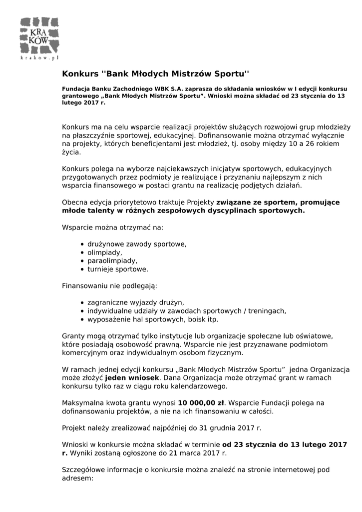 Konkurs ''Bank Młodych Mistrzów Sportu'' Fundacja Banku Zachodniego WBK S.A. zaprasza do składania wniosków w I edycji konkursu grantowego „Bank Młodych Mistrzów Sportu”. Wnioski można składać od 23 stycznia do 13 lutego 2017 r. Konkurs ma na celu wsparcie realizacji projektów służących rozwojowi grup młodzieży na płaszczyźnie sportowej, edukacyjnej. Dofinansowanie można otrzymać wyłącznie na projekty, których beneficjentami jest młodzież, tj. osoby między 10 a 26 rokiem życia. Konkurs polega na wyborze najciekawszych inicjatyw sportowych, edukacyjnych przygotowanych przez podmioty je realizujące i przyznaniu najlepszym z nich wsparcia finansowego w postaci grantu na realizację podjętych działań. Obecna edycja priorytetowo traktuje Projekty związane ze sportem, promujące młode talenty w różnych zespołowych dyscyplinach sportowych. Wsparcie można otrzymać na: drużynowe zawody sportowe, olimpiady, paraolimpiady, turnieje sportowe. Finansowaniu nie podlegają: zagraniczne wyjazdy drużyn, indywidualne udziały w zawodach sportowych / treningach, wyposażenie hal sportowych, boisk itp. Granty mogą otrzymać tylko instytucje lub organizacje społeczne lub oświatowe, które posiadają osobowość prawną. Wsparcie nie jest przyznawane podmiotom komercyjnym oraz indywidualnym osobom fizycznym. W ramach jednej edycji konkursu „Bank Młodych Mistrzów Sportu” jedna Organizacja może złożyć jeden wniosek. Dana Organizacja może otrzymać grant w ramach konkursu tylko raz w ciągu roku kalendarzowego. Maksymalna kwota grantu wynosi 10 000,00 zł. Wsparcie Fundacji polega na dofinansowaniu projektów, a nie na ich finansowaniu w całości. Projekt należy zrealizować najpóźniej do 31 grudnia 2017 r. Wnioski w konkursie można składać w terminie od 23 stycznia do 13 lutego 2017 r. Wyniki zostaną ogłoszone do 21 marca 2017 r. Szczegółowe informacje o konkursie można znaleźć na stronie internetowej pod adresem: http://fundacja.bzwbk.pl/programy-grantowe/bank-mlodych-mistrzow-sportu/ Powered by TCPDF (www.tcpdf.org)