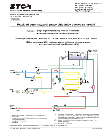 85-861 Bydgoszcz ul. Glinki 144 tel. (0 52) 3450 43 0 fax: (052) 34 5 06 30 e-mail: ztch@ ztch. pl http://www.ztch.pl ZTCh - Zak³ad Techniki Ch³odniczej Wy³¹czny dystrybutor firmy HANSEN, USA AUTOMATYKA CH£ODNICZA ARMATURA URZ¥DZENIA Przyk³ad automatyzacji pracy ch³odnicy powietrza mroŸni regulacja temperatury powietrza w komorze sterowanie procesem odtajania parownika Funkcje: Automatyka ch³odnicza i armatura z ZTCh firm: Hansen Tech., USA, RFF, Francja i innych Obieg pompowy NH3, zasilanie dolne, odtajanie gor¹cym gazem sterownik odtajania Frost Master (FM) 1 230 V 50 Hz Sterownik FM ZP1 S L ssanie HS4A VDS 6 HCK4 HA4AK F 2 T TT 5 p³yn RVDS VDS ST 3 HS7 HCK4 gor¹cy gaz 4 HS4A ST VDS 1 - sterownik odtajania Frost Master (FM-12 lub FM-72) 2 - wentylator 3 - czujnik termostatu TT ( do temperaturowego koñczenia fazy gor¹cego gazu) 4 - taca podparownikowa 5 - parownik H RVDS 6 - regulator temperatury T (termostat) do regulacji temperatury powietrza w komorze. Regulator T stanowi oddzielny element wyposa¿enia i dostarczany jest wg potrzeb: typu mechanicznego (termostat z kapilar¹) lub elektroniczny. ZP1 - zespó³ przekaŸnikowy prze³¹czaj¹cy (od³¹cza termostat T na okres odtajania) przewody elektryczne Oznaczenia literowe przewodów steruj¹cych S, L, F, H s¹ takie same jak na sterowniku FM ZTCh 2003 Wszelkie prawa zastrze¿one Tsch23/00/03