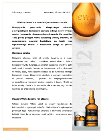 Informacja prasowa Warszawa, 18 sierpnia 2010 r. Whisky Dewar’s w orzeźwiającym towarzystwie Umiejętność połączenia klasycznego alkoholu z oryginalnymi dodatkami pozwala odkryć nowy wymiar smaku i zapewnia niezapomniane doznania dla zmysłów. Taką próbę podjęła marka szkockiej whisky Dewar’s, co zaowocowało nowymi koktajlami na bazie tego wykwintnego trunku – klasycznie pitego w postaci czystej. Harmonia smaku Klasyczne alkohole, takie jak whisky Dewar’s, są z reguły serwowane bez żadnych dodatków, ewentualnie z lodem. Koneserzy trunku twierdzą, że alkohol zachowuje wtedy w pełni swój smak i zapach. Jednak są innowatorzy, którzy dostrzegli w whisky bazę, która idealnie nadaje się do tworzenia koktajli. Połączenie smaku klasycznego alkoholu z nowymi elementami w postaci owoców, pozwala na eksperymentowanie w poszukiwaniu harmonii smaku, zapachu i barwy. Drinki na bazie whisky Dewar’s to wyzwanie dla smakoszy tego trunku i zachęta do przełamania stereotypów. Dewar’s White Label w roli głównej Whisky Dewar’s White Label to idealny fundament dla kolorowych i oryginalnych drinków. Marka Dewar’s wykorzystała potencjał tego wykwintnego alkoholu i stworzyła propozycje koktajli, które łączą klasyczny smak whisky i nowoczesne nuty owocowe. Dewar’ s White Label Side Car Koktajl Side Car został wymyślony przez kapitana armii amerykańskiej, który przebywał w Paryżu podczas drugiej wojny światowej. Każdej nocy, żołnierz jeździł w koszu motocykla do małego baru, gdzie został skomponowany koktajl. Podczas jednego z zimowych paryskich wieczorów, przemarzł on do kości w trakcie podróży motocyklem. Wtedy po wypiciu drinka stwierdził, że nie ma nic bardziej rozgrzewającego i ożywczego niż Side Car. Tak narodziła się nazwa koktajlu. Ten klasyczny drink wyważony jest doskonale w smaku. W oryginalnym przepisie bazą jest koniak. Jednak koktajl Side Car ma także wariację z burbonem, whisky i ginem. Whisky Dewar’s White Label doskonale równoważy smak koktajlu, stanowiąc idealny wariant tej klasycznej kompozycji. Składniki: 1 część whisky Dewar’s White Label 2 części świeżo wyciśniętego soku z cytryny ½ części likieru Cointreau Przygotowanie: Cztery pierwsze składniki wymieszać w shakerze wypełnionym lodem. Całość energicznie wstrząsnąć i przelać do koktajlowego. pomarańczy. Koktajl ozdobić skórką lub kieliszka plasterkiem Dewar’s White Label Ward Eight Koktajl Ward Eight liczy ponad sto lat, a jego początki sięgają końca 1890 roku. Mikstura została tak nazwana na cześć Martina Lomasney’a, który zwyciężył w swoim okręgu – Ward Eight – podczas wyborów. Ward Eight to unikalne połączenie smaku whisky z owocowymi nutami. Ten prosty i delikatny koktajl jest doskonały na każdą okazję. Składniki: 2 części whisky Dewar’s White Label Sok z dwóch pomarańczy Sok z dwóch cytryn Odrobina grenadyny lub likieru z granatów Skręcona skórka cytryny do ozdoby Przygotowanie: Pierwsze cztery składniki umieścić w shakerze napełnionym lodem i wymieszać energicznie. Całość przelać do kieliszka koktajlowego i podawać ze spiralnie zwiniętą skórką cytryny. Dewar’s White Label z sokiem imbirowym i cytryną lub pomarańczą Słodki, waniliowy smak Dewar’s White Label dopełniony rozgrzewającym sokiem imbirowym. Koktajl uzupełniony porcją soku z cytryny orzeźwia, a wzbogacenie go smakiem pomarańczy, wydobywa z alkoholu cytrusową nutę. Składniki: 1 część Dewar’s White Label 3 części soku imbirowego Porcja soku cytrynowego lub pomarańczowego Przygotowanie: Napełnić wysoką szklankę lodem i wlać do niej whisky. Następnie uzupełnić ją sokiem imbirowym. Koktajl ozdobić plasterkiem cytryny lub pomarańczy. Dossier Dewar’s Special Reserve Scotch Whisky Aged 12 Years – to mieszanka najlepszych rodzajów whisky dojrzewających przez co najmniej 12 lat, charakteryzująca się dymnym aromatem i specyficznym, rozpoznawalnym przez znawców smakiem. Do składowania alkoholu używa się drewnianych, starannie przygotowanych beczek, w których wcześniej przechowywane było sherry. Dzięki temu alkohol dojrzewa, a przy tym nabiera wykwintności oraz lekkiej słodyczy. Dewar’s White Label – to wyrafinowana mieszanka szkockiej whisky odznaczająca się łagodnym i miękkim smakiem przetykanym nutkami szkockich wrzosów i złocistego miodu. Ten szczególny trunek zdobył wiele medali i nagród na licznych zawodach na całym świecie, w tym złoty medal na Monde Selection 2006. Wyłącznym dystrybutorem whisky Dewar’s na polskim rynku jest firma Bacardi-Martini Polska Sp. z o.o. Kontakt prasowy: Beata Grzybek, Konkret PR, ul. Okrąg 2 lok. 45, 00-415 Warszawa, tel/fax. (22) 628 50 42, e-mail: [email protected].