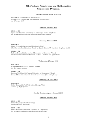 5th Podlasie Conference on Mathematics Conference Program Plenary Session (room WM447) Bialystok University of Technology, building of Faculty of Mechanical Engineering, ul. Wiejska 45C Monday, 25 June 2012 15:00-16:00 Agata Smoktunowicz (University of Edinburgh, United Kingdom) On noncommutative infinite-dimensional algebraic algebras Tuesday, 26 June 2012 9:00-10:00 Marek Druzdzel (University of Pittsburgh, USA) The Theoretical and Practical Beauty of Acyclic Directed Probabilistic Graphical Models 10:00-11:00 Tadeusz Trzaskalik (University of Economics in Katowice, Poland) Discrete Multiple Criteria Decision Analysis - methods and applications Wednesday, 27 June 2012 9:00-10:00 Witold Respondek (INSA, Rouen, France) On flat control systems 10:00-11:00 Krzysztof M. Piasecki (Poznan University of Economics, Poland) Basis of financial arithmetic from the point view of the utility theory Thursday, 28 June 2012 9:00-10:00 Jeffrey Bergen (DePaul University, Chicago, USA) Actions of Hopf algebras Special Session: Algebra (room 116A) Monday, 25 June 2012 16:30-16:55 Jeffrey Bergen (DePaul University) Locally nilpotent derivations 16:55-17:15 Piotr Grzeszczuk (Bialystok University of Technology) On irreducible modules over q-skew polynomial rings 1 17:20-17:40 Lahcen Oukhtite (Université Moulay Ismail) Differential identities on Jordan ideals of rings with involution 17:40-18:00 Jerzy Matczuk (University of Warsaw) Idempotents in ring extensions Tuesday, 26 June 2012 11:30-11:55 André Leroy (Université d’Artois) McCoy and strongly McCoy rings 11:55-12:20 Yuliya Zelenyuk (University of Witwatersrand) Ultrafilter semigroups and related questions 15:30-15:50 Piotr Jędrzejewicz (Nicolaus Copernicus University) Ring-theoretic aspects of the Jacobian Conjecture 15:50-16:10 Marcin Skrzyński (Cracow University of Technology) The characteristic map and some related algebraic sets of matrices 16:10-16:30 Karol Pryszczepko (University of Białystok) On commutative, noetherian, filial rings 16:30-16:40 Coffee break 16:40-17:00 Joachim Jelisiejew (University of Warsaw) On commutativity of ideal extensions 17:00-17:20 Małgorzata Hryniewicka (University of Białystok) On rings with a finite number of orbits 17:20-17:40 Mateusz Woronowicz (University of Białystok) On associative ring multiplication on mixed groups 17:40-18:00 Amir Ehsani (Mahshahr Branch, Islamic Azad University) Characterization of medial-like algebras Wednesday, 27 June 2012 11:30-11:50 Ryszard Andruszkiewicz (University of Białystok) Accessible subrings and Kurosh’s chains of associative rings 11:50-12:10 Magdalena Sobolewska (University of Białystok) On the stabilisation of onesided Kurosh’s chains 12:10-12:30 Marzena Filipowicz-Chomko (Bialystok University of Technology) On left ideals of associative rings 2 Thursday, 28 June 2012 10:30-11:00 Jan Krempa (University of Warsaw) On lattices of radicals in the class of all finite groups 11:00-11:20 Czesław Bagiński (Bialystok University of Technology) On 2-generation of the symmetric and the alternating groups 11:20-11:30 Coffee break 11:30-11:50 Izabela A. Malinowska (University of Białystok) On generalized subnormal subgroups of finite groups 11:50-12:10 Agnieszka Stocka (University of Białystok) On some lattice dimensions of finite groups 12:10-12:30 Ryszard Mazurek (Bialystok University of Technology) On right-chain semigroups admitting ring structure Special Session: Applications of Mathematics in Economy and Finance (room 237A) Tuesday 26 June 2012 11:30-11:50 Grzegorz Koronkiewicz (University of Bialystok) WIG20 implied volatility and the importance of Black-Scholes option pricing formula 11:50-12:10 Monika Dryl (University of Aveiro) Philip’s tradeoff between inflation and unemployment and the time scale variational calculus 12:10-12:30 Ewa Piotrowska (Bialystok University of Technology) The assessment of the level of innovativeness of the voivodships in Poland 15:30-15:50 Ewa Roszkowska (University of Bialystok) The rank ordering criteria weighting methods - a comparative overview 15:50-16:10 Joanna Olbryś (Bialystok University of Technology) The Choleski decomposition and its applications for econometrics Special Session: Control Theory and Dynamical Systems (room 130A) Monday, 25 June 2012 16:30-17:00 Laura Poggiolini (Università degli Studi di Firenze) Optimality and stability of Pontryagin extremals in the minimum time problem 3 17:00-17:20 Ricardo Almeida (University of Aveiro) A numerical method to solve fractional variational problems 17:20-17:40 Natalia Martins (University of Aveiro) Optimality conditions for Hahn’s symmetric quantum variational problems 17:40-18:00 M. R. Sidi Ammi (Moulay Ismail University) Optimality System of Nonlocal Thermistor Equations Tuesday 26 June 2012 11:30-12:00 Witold Respondek (INSA de Rouen, France) Control systems that admit a mechanical structure and their equivariants 12:00-12:20 Małgorzata Wyrwas (Bialystok University of Technology) Reducibility conditions for nonlinear discrete-time systems: behavioral approach 12:20-12:40 Anna Poskrobko (Bialystok University of Technology) Stability and chaotic properties of multidimensional Lasota equation 15:30-15:50 Dorota Mozyrska (Bialystok University of Technology) Numerical experiments for fractional differences and the discussion of possible data estimations 15:50-16:10 Ewa Girejko (Bialystok University of Technology) Cone solutions to systems with generalized fractional difference operators 16:10-16:30 Małgorzata Wyrwas (Bialystok University of Technology) Stability of the Caputo fractional order difference systems 16:30-16:50 Coffee break 16:50-17:10 Tatiana Odzijewicz (University of Aveiro) A Generalized Fractional Calculus of Variations 17:10-17:30 Jacek Chudziak (University of Rzeszów) Invariance of utility functions with respect to some classes of transformations Wednesday 27 June 2012 11:30-12:00 Nuno R. O. Bastos (Polytechnic Institute of Viseu, University of A