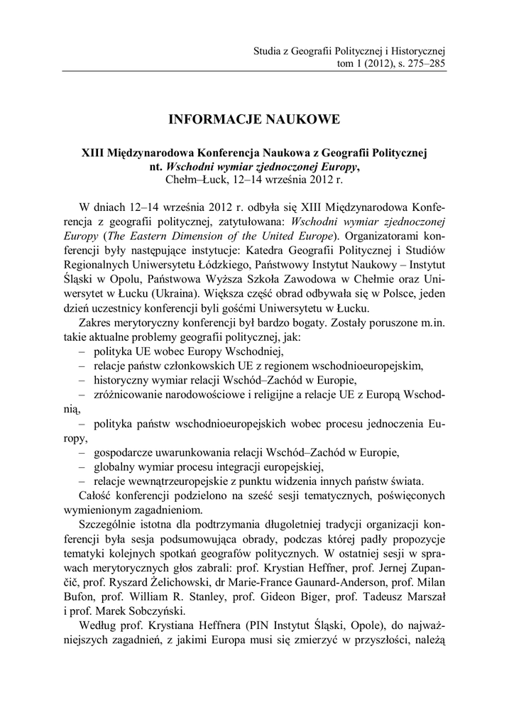Studia z Geografii Politycznej i Historycznej tom 1 (2012), s. 275–285 INFORMACJE NAUKOWE XIII Międzynarodowa Konferencja Naukowa z Geografii Politycznej nt. Wschodni wymiar zjednoczonej Europy, Chełm–Łuck, 12–14 września 2012 r. W dniach 12–14 września 2012 r. odbyła się XIII Międzynarodowa Konferencja z geografii politycznej, zatytułowana: Wschodni wymiar zjednoczonej Europy (The Eastern Dimension of the United Europe). Organizatorami konferencji były następujące instytucje: Katedra Geografii Politycznej i Studiów Regionalnych Uniwersytetu Łódzkiego, Państwowy Instytut Naukowy – Instytut Śląski w Opolu, Państwowa Wyższa Szkoła Zawodowa w Chełmie oraz Uniwersytet w Łucku (Ukraina). Większa część obrad odbywała się w Polsce, jeden dzień uczestnicy konferencji byli gośćmi Uniwersytetu w Łucku. Zakres merytoryczny konferencji był bardzo bogaty. Zostały poruszone m.in. takie aktualne problemy geografii politycznej, jak: – polityka UE wobec Europy Wschodniej, – relacje państw członkowskich UE z regionem wschodnioeuropejskim, – historyczny wymiar relacji Wschód–Zachód w Europie, – zróżnicowanie narodowościowe i religijne a relacje UE z Europą Wschodnią, – polityka państw wschodnioeuropejskich wobec procesu jednoczenia Europy, – gospodarcze uwarunkowania relacji Wschód–Zachód w Europie, – globalny wymiar procesu integracji europejskiej, – relacje wewnątrzeuropejskie z punktu widzenia innych państw świata. Całość konferencji podzielono na sześć sesji tematycznych, poświęconych wymienionym zagadnieniom. Szczególnie istotna dla podtrzymania długoletniej tradycji organizacji konferencji była sesja podsumowująca obrady, podczas której padły propozycje tematyki kolejnych spotkań geografów politycznych. W ostatniej sesji w sprawach merytorycznych głos zabrali: prof. Krystian Heffner, prof. Jernej Zupančič, prof. Ryszard Żelichowski, dr Marie-France Gaunard-Anderson, prof. Milan Bufon, prof. William R. Stanley, prof. Gideon Biger, prof. Tadeusz Marszał i prof. Marek Sobczyński. Według prof. Krystiana Heffnera (PIN Instytut Śląski, Opole), do najważniejszych zagadnień, z jakimi Europa musi się zmierzyć w przyszłości, należą 276 Informacje naukowe kierunki rozwoju Unii Europejskiej i aspekty jej rozszerzenia. Między innymi potencjał, możliwości, nadzieje, zagrożenia i bariery związane z przyjęciem nowych państw członkowskich, w tym Ukrainy. Według prof. Jerneja Zupančiča (Uniwersytet w Lubljanie, Słowenia), tematykę wystąpień na konferencji można podzielić na dwa kierunki. Pierwszy z nich dotyczył mniejszości narodowych i religijnych w różnych krajach europejskich. Omówione zostały zarówno aspekty pochodzenia i historii, jak również struktury, współczesnej kondycji, uwarunkowań rozwoju oraz roli politycznej wybranych mniejszości. Kolejnym zagadnieniem, na którym koncentrowali się prelegenci, była współpraca ponadnarodowa i międzynarodowa. Rozpatrywano głównie aspekty współpracy transgranicznej, społeczne i ekonomiczne bariery rozwoju oraz potencjał ludzki i gospodarczy regionów przygranicznych. Prof. Jernej Zupančič (Uniwersytet w Lubljanie, Słowenia) przedstawił kilka propozycji odnośnie do tematyki kolejnych konferencji: – teoretyczne i metodologiczne aspekty geografii politycznej, – współczesna metodologia badawcza, poszukiwanie i rozwój nowych metod badawczych, – uwarunkowania i konsekwencje decyzji politycznych podejmowanych na różnych szczeblach władzy (centralnym, regionalnym i lokalnym), związanych z kooperacją transgraniczną; rola lokalnych samorządów we współpracy transgranicznej, – prognozowanie rozwoju Unii Europejskiej i jej krajów członkowskich w perspektywie długoterminowej, – prognozowanie kierunków i konsekwencji poszerzenia Unii Europejskiej o nowe kraje członkowskie, – rozwój i wewnętrzne wyzwania współpracy europejskiej, – szeroko rozumiana tematyka granic i pograniczy. Na zakończenie swojej wypowiedzi prof. Zupančič zaapelował do zgromadzonych o większą aktywność naukową i polityczną środowiska geografów, a w szczególności geografów politycznych. Kolejną osobą, która zabrała głos w dyskusji, była dr Marie-France GaunardAnderson (Uniwersytet Metz, Francja). Dokonała krótkiego podsumowania konferencji oraz wskazała na kilka istotnych zagadnień, które warto wziąć pod uwagę, planując tematykę kolejnych konferencji: – ograniczenia Europy (gdzie kończy się Europa), – wielokulturowy charakter regionów Europy oraz Europa jako kontynent, – zagadnienia integracji europejskiej, – przyszłość Unii Europejskiej, – współpraca transgraniczna oraz współpraca po zniesieniu granic, Informacje naukowe 277 – zagadnienia mniejszości narodowych, religijnych i innych (kompleksowe podejście), – perspektywy europejskiej integracji na wschodzie i zachodzie kontynentu, – aspekty poszerzenia granic Unii Europejskiej. Następnie głos zabrał prof. William R. Stanley ze Stanów Zjednoczonych (Uniwersytet Południowej Karoliny), który zwrócił uwagę na konieczność analizy procesów gospodarczego rozwoju Ukrainy jako potencjalnego członka Unii Europejskiej i sąsiada Polski, szczególnie w zakresie handlu i rozwoju rolnictwa. Profesor Stanley zaproponował podjęcie szerokiej i stałej współpracy między polskim Ministerstwem Rolnictwa i Rozwoju Wsi a ukraińskimi rolnikami. Celem współpracy, oprócz doraźnych korzyści finansowych, miałby być transfer wiedzy i technologii uprawy ziemi i hodowli zwierząt dla poprawienia ekonomicznej i socjalnej sytuacji ukraińskiej wsi. Ten sektor ukraińskiej gospodarki znajduje się obecnie w stanie kryzysu i recesji. Dzięki współpracy polsko-ukraińskiej, rolnictwo wschodniego sąsiada Polski może stać się bardziej wydajne i konkurencyjne na europejskim rynku. Następnie prof. Milan Bufon ze Słowenii (Uni