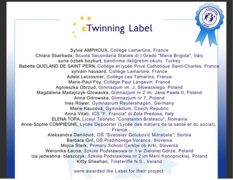 Sylvie AMPHOUX, Collège Lamartine, France Chiara Sbarbada, Scuola Secondaria Statale di I Grado "Maria Brigida", Italy suna özbek bozkurt, bandırma ilköğretim okulu, Turkey Babette QUELAND DE SAINT PERN, Collège et lycée Privé Catholique Saint-Charles, France sylvain hausard, Collège Lamartine, France Adele Lecrosnier, Collège Les Tamarins, France Marie-Paul Foy, Collège Paul Langevin, France Agnieszka Obrzud, Gimnazjum im. J. Słowackiego, Poland Magdalena Madajczyk-Glowacka, Gimnazjum nr 2 im. Jana Pawła II, Poland Anna Odrowska, Gimnazjum nr 7, Poland Ines Röwer, Gymnasium Reutershagen, Germany Marie Kaucová, Gymnázium, Czech Republic Anna Vitali, ICS "F. Francia" di Zola Predosa, Italy ELENA TOPA, Liceul Teoretic "Constantin Bratescu", Romania Anne-Sophie COMPIEGNE, Lycée Depoorter (Lycée des métiers de la santé et du social), France Aleksandra Danilović, OŠ "Svetislav Golubović Mitraljeta", Serbia Barbara Gril, OŠ Prežihovega Voranca, Slovenia Mojca Sterk, Primary School Cerklje ob Krki, Slovenia Weronika Łacna, Szkoła Podstawowa nr 1 w Zielonej Górze, Poland iza jedwabna- blaszczyk, Szkoła Podstawowa nr 2 im Marii Konopnickiej, Poland Kitty Sheehan, Tineteriffe N.S., Ireland were awarded the Label for their project: Happy EDL!!!! 06.09.2015 Marie-Christine Clément-Bonhomme National Support Service France Marc Durando Central Support Service Donatella Nucci National Support Service Italy