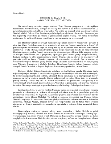 Marta Płatek QUEEN W RAMPIE NAJWAŻNIEJSZA JEST MUZYKA Na czterdziestą rocznicę swego istnienia Teatr Rampa przygotował z niezwykłym rozmachem przedstawienie, którego nie da się tak wprost i do końca zakwalifikować. Z pewnością nie jest to spektakl ani widowisko. Nie jest to też musical, choć jego twórcy: Jakub Wocial, Michel Driesse i Jan Stokłosa specjalizują się w tej formie. Rapsodia z Demonem jest tak naprawdę wszystkim po trochu i jednocześnie czymś więcej. Jest także koncertem rockowym, do realizacji którego zespół nad wyraz sumiennie się przygotował. Jan Stokłosa wybrał czołowych muzyków z polskich zespołów rockowych i ćwiczył z nimi tak długo (podobno przez trzy miesiące), aż muzyka Queen „weszła im w krew”. Z pewnością miał świadomość tego, że każdy kto się za nią bierze, musi mieć w sobie ziarno szaleństwa i wiele odwagi. Konsekwentnie przez niego stosowana zasada, by nie poprawiać ideału (w tym przypadku Queen) zaowocowała niesamowitym efektem. Gdy wszyscy myślą, że muzyka odtwarzana jest z playbacku, opadająca pod koniec (jakby niespodziewanie), kurtyna odsłania w głębi pięcioosobowy zespół. Okazuje się, że ukryci za nią muzycy od początku grali na żywo. Charakterystyczne, niepowtarzalne brzmienie Queen zawarte w wielowarstwowych partiach gitary Briana Maya znalazło odzwierciedlenie w porywającej grze Michała Sitarskiego i Michała Polubca. Genialnego basistę, Johna Deacona godnie zastąpił Paweł Grudniak, a Rogera Taylora – fenomenalny perkusista, Adam Kram. Reżyser, Michel Driesse kieruje się podobną, co Jan Stokłosa zasadą. Dla niego także najważniejsza jest muzyka. I chociaż nie rezygnuje z różnorodnych efektów widowiskowych, to myśli bardziej muzyką niż teatrem. Stworzył dzieło składające się z największych hitów1 znanego na całym świecie zespołu Queen połączonych ze sobą fabułą tak, że utworzyły pewną historię. Toczy się ona w dwóch wymiarach: w przestrzeni rzeczywistej i w wewnętrznych krajobrazach podświadomości. Wszystko to przesycone jest muzyką, ruchem i światłem. Na uwagę zasługuje wspaniała choreografia Santiago Bello i perfekcja tancerzy. Jest taki teledysk2, w którym Freddie Mercury wciela się w postać czarodzieja i zmienia pozostałych, zabiedzonych i nikomu nieznanych członków zespołu w prawdziwe gwiazdy światowych scen rocka. W Rapsodii z Demonem pojawia się również niedoceniony, młody piosenkarz, Erwin (Kuba Molęda). Tu jednak z pomocą przychodzi mu Demon (Jakub Wocial). Inspiracją do stworzenia fabuły mogła być też historia rzekomo zawarta w Bohemian Rhapsody. Muzycy Queen, chociaż zwykle nie wypowiadali się na temat treści swoich utworów, to kiedyś zdradzili, że piosenka ta opowiada o chłopcu, który zaprzedał duszę diabłu. Dysponujący świetnym głosem młody aktor musicalowy, Kuba Molęda w pełni udźwignął rolę Erwina, chociaż ani przez chwilę nie naśladował Ferddiego Mercury’ego. Towarzyszący mu Jakub Wocial w roli Demona na długo przykuł uwagę widzów nie tylko wyglądem (ubielona twarz, białe źrenice, płaszcz z wężowej skóry), ale i oryginalnym, silnym 1 What A Beautiful Day, One Vision, Flash, Innuendo, A Kind of Magic, Don’t Stop Me Now, Killer Queen, We Will Rock You, Breakthru, I Want It All, I Want To Break Free, Another One Bites The Dust, Living On My Own, The Show Must Go On, Headlong, I’m Going Slightly Mad, Play the Game/Love Kills, Who Wants To Live Forever, Bohemian Rhapsody, We Are the Champions. 2 Teledysk do piosenki A Kind of Magic wyreżyserowany przez Russella Mulcahy’ego. głosem. Zresztą bardzo wysoko ocenić należy nie tylko tych dwóch, ale i pozostałych aktorów. Siła tego widowiska tkwi bowiem nie tylko w muzyce i zaskakującej inscenizacji, ale przede wszystkim w pasji, talencie i zaangażowaniu wszystkich artystów. Spotkanie z niezapomnianą muzyką brytyjskiej grupy Queen kończą grane na bis dwa super hity: Bohemian Rhapsody i We Are the Champions. Publiczność śpiewa, klaszcze, wytupuje rytm, szaleje, nie chce wypuścić aktorów ze sceny. Gdyby Freddie Mercury wiedział, że jego utwory grane będą co wieczór w Rampie dla publiczności, która nigdy nie miała szansy zobaczyć Queen na żywo, byłby szczęśliwy. Rapsodia z Demonem Reżyseria i inscenizacja – Michel Driesse, kierownictwo muzyczne i aranżacje – Jan Stokłosa, choreografia – Santiago Bello, scenariusz – Katarzyna Kraińska, scenografia i kostiumy – Dorota Sabak. Obsada: Erwin – Kuba Molęda, Mistrz – Jakub Wocial, Kacper – Sebastian Machalski, Ida – Natalia Piotrowska, Królowa – Basia Gąsienica-Giewont, Ignacja – Agnieszka „Fajka” Fajlhauer, Aspazja – Brygida Turowska oraz Dominika Łakomska, Daniel Zawadzki, Robert Tondera, Wiktoria Maria Jabłońska, Anna Kiedroń, Michalina Brudnowska, Kamil Dominiak, Ewelina Kruk, Natalia Kielan, Nika Warszawska-Ratajczak, Michał Cyran, Patryk Gładyś. Premiera: 30 października 2015 r. Teatr Rampa