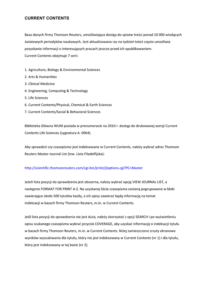 CURRENT CONTENTS Baza danych firmy Thomson Reuters, umożliwiająca dostęp do spisów treści ponad 10 000 wiodących światowych periodyków naukowych. Jest aktualizowana raz na tydzień toteż często umożliwia pozyskanie informacji o interesujących pracach jeszcze przed ich opublikowaniem. Current Contents obejmuje 7 serii: 1. Agriculture, Biology & Environmental Sciences 2. Arts & Humanities 3. Clinical Medicine 4. Engineering, Computing & Technology 5. Life Sciences 6. Current Contents/Physical, Chemical & Earth Sciences 7. Current Contents/Social & Behavioral Sciences Biblioteka Główna WUM posiada w prenumeracie na 2010 r. dostęp do drukowanej wersji Current Contents Life Sciences (sygnatura A. 0964). Aby sprawdzić czy czasopismo jest indeksowane w Current Contents, należy wybrać adres Thomson Reuters Master Journal List (tzw. Lista Filadelfijska): http://scientific.thomsonreuters.com/cgi-bin/jrnlst/jloptions.cgi?PC=Master Jeżeli lista pozycji do sprawdzenia jest obszerna, należy wybrać opcję VIEW JOURNAL LIST, a następnie FORMAT FOR PRINT A‐Z. Na uzyskanej liście czasopisma zostaną pogrupowane w bloki zawierające około 500 tytułów każdy, a ich opisy zawierać będą informację na temat indeksacji w bazach firmy Thomson Reuters, m.in. w Current Contents. Jeśli lista pozycji do sprawdzenia nie jest duża, należy skorzystać z opcji SEARCH i po wyświetleniu opisu szukanego czasopisma wybrać przycisk COVERAGE, aby uzyskać informację o indeksacji tytułu w bazach firmy Thomson Reuters, m.in. w Current Contents. Niżej zamieszczono zrzuty ekranowe wyników wyszukiwania dla tytułu, który nie jest indeksowany w Current Contents (nr 1) i dla tytułu, który jest indeksowany w tej bazie (nr 2). Należy pamiętać, że na Thomson Reuters Master Journal List można potwierdzić indeksację tytułów w bazach Current Contents na chwilę obecną. Baza nie umożliwia sprawdzenia indeksacji w poprzednich latach.