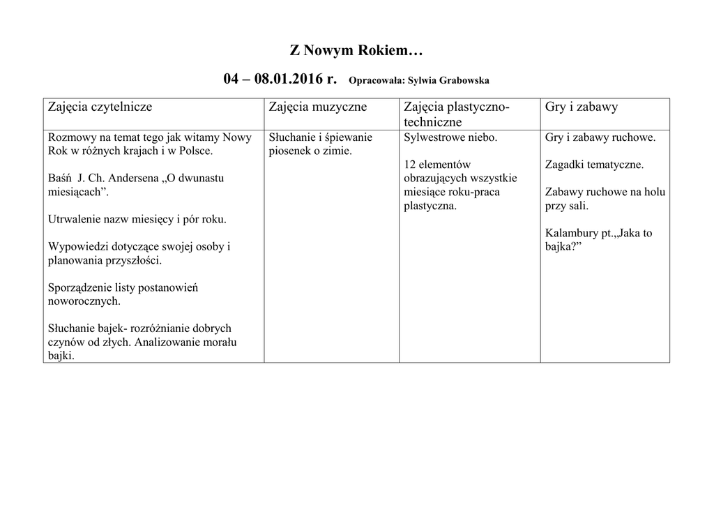 Z Nowym Rokiem… 04 – 08.01.2016 r. Opracowała: Sylwia Grabowska Zajęcia czytelnicze Zajęcia muzyczne Zajęcia plastycznotechniczne Gry i zabawy Rozmowy na temat tego jak witamy Nowy Rok w różnych krajach i w Polsce. Słuchanie i śpiewanie piosenek o zimie. Sylwestrowe niebo. Gry i zabawy ruchowe. 12 elementów obrazujących wszystkie miesiące roku-praca plastyczna. Zagadki tematyczne. Baśń J. Ch. Andersena „O dwunastu miesiącach”. Zabawy ruchowe na holu przy sali. Utrwalenie nazw miesięcy i pór roku. Wypowiedzi dotyczące swojej osoby i planowania przyszłości. Sporządzenie listy postanowień noworocznych. Słuchanie bajek- rozróżnianie dobrych czynów od złych. Analizowanie morału bajki. Kalambury pt.„Jaka to bajka?” Karnawał. Znaki czasu. 11 – 15.01.2016r. Opracowała: Sylwia Grabowska Zajęcia czytelnicze Zajęcia muzyczne Zajęcia plastycznotechniczne Wyjaśnienie pojęciakarnawał. Zabawy rytmiczno-ruchowe przy muzyce dyskotekowej, dziecięcej. „Karnawał”- praca plastyczna Zabawy karnawałowe. dowolną techniką. Taniec gazetowy. „ Maska karnawałowa”praca z szablonem, zdobienie Gimnastyka-ćwiczenia ogólnorozwojowe z dowolne. przyrządami gimnastycznymi. Projekt stroju karnawałowego- malowanie Zabawy świetlicowe: farbami. „ Ludzie do ludzi” „Berek” „Piłka w kole” Rozmowy o świętowaniu karnawału w różnych zakątkach świata. Zapoznanie z tradycją zabaw karnawałowych, rozbudzanie radosnego nastroju. Zabawy przy muzyce„Taniec z balonem”. Gry i zabawy Budzenie szacunku i wrażliwości dla osób starszych. Pamiętamy o naszych dziadkach. 18-22.01.2016r. Opracowała: Sylwia Grabowska Zajęcia czytelnicze Zajęcia muzyczne Zajęcia plastycznotechniczne Gry i zabawy Swobodne wypowiedzi dzieci na temat więzi łączącej ich z dziadkami. Nauka piosenki: „Kwiatek” dla babci i dziadka. Zabawy z różnymi elementami ruchu. Laurka z talerzyka. Zabawa rozwijająca kontakt i oswajanie się z innymi osobami- „Lustro”. Za co kochamy nasze babcie i dziadków- rozmowy tematyczne. Jak okazywać szacunek dla starszych osób? Redagowanie życzeń dla babci ii dziadka. M. Brykczyński- Wierszyk dla babci i dziadka. Wyjaśnienie pojęciadrzewo genealogiczne. „Marzenia dziadka” „Babcia czarodziejka” Kolorowanki tematyczne. „Na dzień babci i dzień dziadka” Drzewo genealogiczne mojej Taniec przy muzyce z rodziny- praca plastyczna. płytoteki świetlicowej. Zima lubi dzieci. Jak bezpiecznie spędzić ferie zimowe? 25-29.01.2016r. Opracowała: Sylwia Grabowska Zajęcia czytelnicze Zajęcia muzyczne Zajęcia plastycznotechniczne Gry i zabawy Rozmowy o grach i zabawach na śniegu. Śpiewanie piosenek związanych z tematyką zimową. Pejzaż zimowy- technika dowolna. Zabawy z różnymi elementami ruchu. Bałwan z kółek origami. Zabawa rozwijająca kontakt i oswajanie się z innymi osobami- „Lustro”. Obserwacja przyrody zimą. Jak dbać o higienę zdrowotną podczas zimy? J.CH. Andersen „Królowa śniegu”. Pogadanki na temat bezpieczeństwa podczas ferii zimowych. Wdrażanie do przestrzegania zasad BHP podczas zabaw. Nauka słów do piosenki: „ Zima, zima, zima…” Budujemy własne igloo – puzzle, wyklejanka. Rękawiczki do parymalowanie farbami Taniec przy muzyce z płytoteki świetlicowej.