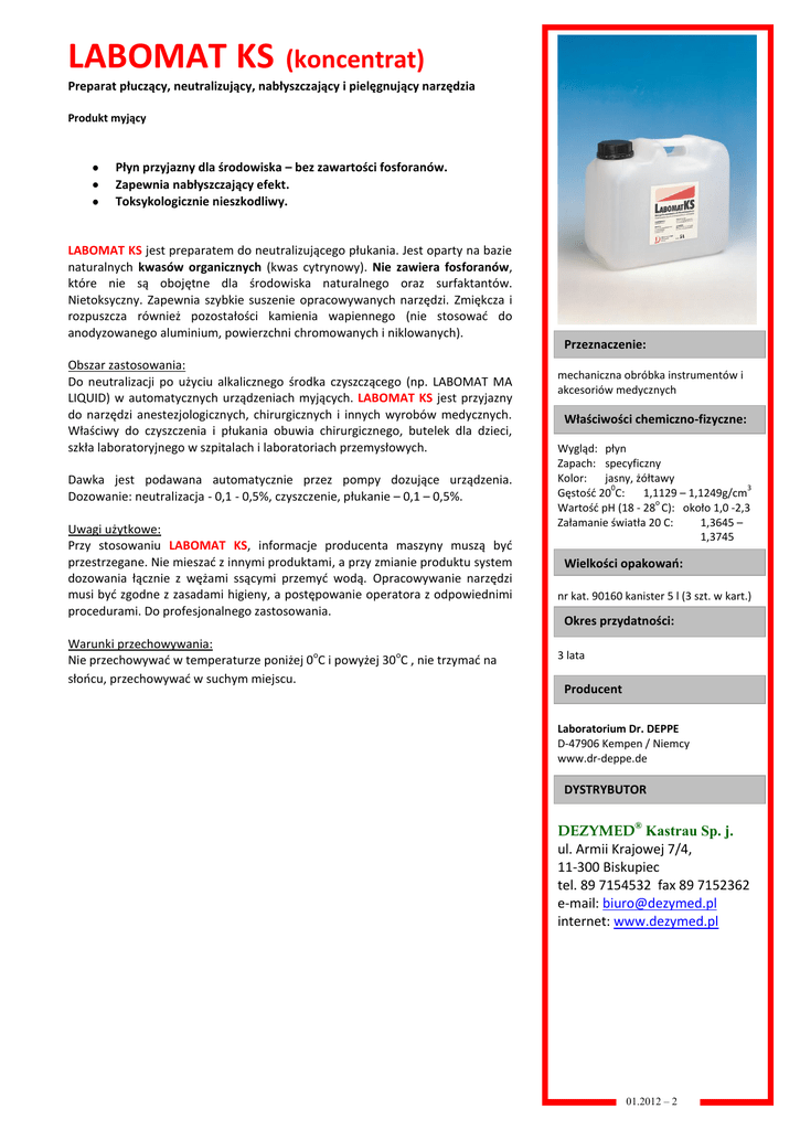 LABOMAT KS (koncentrat) Preparat płuczący, neutralizujący, nabłyszczający i pielęgnujący narzędzia Produkt myjący Płyn przyjazny dla środowiska – bez zawartości fosforanów. Zapewnia nabłyszczający efekt. Toksykologicznie nieszkodliwy. LABOMAT KS jest preparatem do neutralizującego płukania. Jest oparty na bazie naturalnych kwasów organicznych (kwas cytrynowy). Nie zawiera fosforanów, które nie są obojętne dla środowiska naturalnego oraz surfaktantów. Nietoksyczny. Zapewnia szybkie suszenie opracowywanych narzędzi. Zmiękcza i rozpuszcza również pozostałości kamienia wapiennego (nie stosowad do anodyzowanego aluminium, powierzchni chromowanych i niklowanych). Obszar zastosowania: Do neutralizacji po użyciu alkalicznego środka czyszczącego (np. LABOMAT MA LIQUID) w automatycznych urządzeniach myjących. LABOMAT KS jest przyjazny do narzędzi anestezjologicznych, chirurgicznych i innych wyrobów medycznych. Właściwy do czyszczenia i płukania obuwia chirurgicznego, butelek dla dzieci, szkła laboratoryjnego w szpitalach i laboratoriach przemysłowych. Dawka jest podawana automatycznie przez pompy dozujące urządzenia. Dozowanie: neutralizacja - 0,1 - 0,5%, czyszczenie, płukanie – 0,1 – 0,5%. Uwagi użytkowe: Przy stosowaniu LABOMAT KS, informacje producenta maszyny muszą byd przestrzegane. Nie mieszad z innymi produktami, a przy zmianie produktu system dozowania łącznie z wężami ssącymi przemyd wodą. Opracowywanie narzędzi musi byd zgodne z zasadami higieny, a postępowanie operatora z odpowiednimi procedurami. Do profesjonalnego zastosowania. Warunki przechowywania: o o Nie przechowywad w temperaturze poniżej 0 C i powyżej 30 C , nie trzymad na słoocu, przechowywad w suchym miejscu. Przeznaczenie: mechaniczna obróbka instrumentów i akcesoriów medycznych Właściwości chemiczno-fizyczne: Wygląd: płyn Zapach: specyficzny Kolor: jasny, żółtawy 0 3 Gęstośd 20 C: 1,1129 – 1,1249g/cm o Wartośd pH (18 - 28 C): około 1,0 -2,3 Załamanie światła 20 C: 1,3645 – 1,3745 Wielkości opakowao: nr kat. 90160 kanister 5 l (3 szt. w kart.) Okres przydatności: 3 lata Producent Laboratorium Dr. DEPPE D-47906 Kempen / Niemcy www.dr-deppe.de DYSTRYBUTOR DEZYMED® Kastrau Sp. j. ul. Armii Krajowej 7/4, 11-300 Biskupiec tel. 89 7154532 fax 89 7152362 e-mail: [email protected] internet: www.dezymed.pl 01.2012 – 2