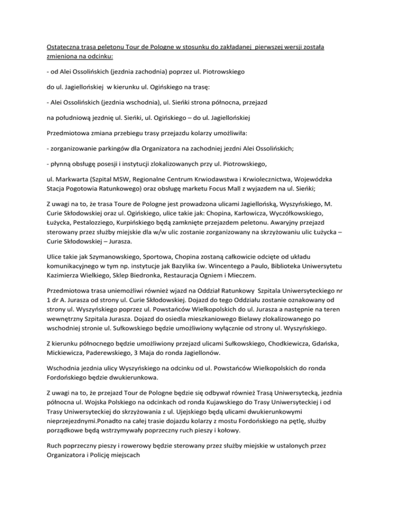 Ostateczna trasa peletonu Tour de Pologne w stosunku do zakładanej pierwszej wersji została zmieniona na odcinku: - od Alei Ossolińskich (jezdnia zachodnia) poprzez ul. Piotrowskiego do ul. Jagiellońskiej w kierunku ul. Ogińskiego na trasę: - Alei Ossolińskich (jezdnia wschodnia), ul. Sieńki strona północna, przejazd na południową jezdnię ul. Sieńki, ul. Ogińskiego – do ul. Jagiellońskiej Przedmiotowa zmiana przebiegu trasy przejazdu kolarzy umożliwiła: - zorganizowanie parkingów dla Organizatora na zachodniej jezdni Alei Ossolińskich; - płynną obsługę posesji i instytucji zlokalizowanych przy ul. Piotrowskiego, ul. Markwarta (Szpital MSW, Regionalne Centrum Krwiodawstwa i Krwiolecznictwa, Wojewódzka Stacja Pogotowia Ratunkowego) oraz obsługę marketu Focus Mall z wyjazdem na ul. Sieńki; Z uwagi na to, że trasa Toure de Pologne jest prowadzona ulicami Jagiellońską, Wyszyńskiego, M. Curie Skłodowskiej oraz ul. Ogińskiego, ulice takie jak: Chopina, Karłowicza, Wyczółkowskiego, Łużycka, Pestalozziego, Kurpińskiego będą zamknięte przejazdem peletonu. Awaryjny przejazd sterowany przez służby miejskie dla w/w ulic zostanie zorganizowany na skrzyżowaniu ulic Łużycka – Curie Skłodowskiej – Jurasza. Ulice takie jak Szymanowskiego, Sportowa, Chopina zostaną całkowicie odcięte od układu komunikacyjnego w tym np. instytucje jak Bazylika św. Wincentego a Paulo, Biblioteka Uniwersytetu Kazimierza Wielkiego, Sklep Biedronka, Restauracja Ogniem i Mieczem. Przedmiotowa trasa uniemożliwi również wjazd na Oddział Ratunkowy Szpitala Uniwersyteckiego nr 1 dr A. Jurasza od strony ul. Curie Skłodowskiej. Dojazd do tego Oddziału zostanie oznakowany od strony ul. Wyszyńskiego poprzez ul. Powstańców Wielkopolskich do ul. Jurasza a następnie na teren wewnętrzny Szpitala Jurasza. Dojazd do osiedla mieszkaniowego Bielawy zlokalizowanego po wschodniej stronie ul. Sułkowskiego będzie umożliwiony wyłącznie od strony ul. Wyszyńskiego. Z kierunku północnego będzie umożliwiony przejazd ulicami Sułkowskiego, Chodkiewicza, Gdańska, Mickiewicza, Paderewskiego, 3 Maja do ronda Jagiellonów. Wschodnia jezdnia ulicy Wyszyńskiego na odcinku od ul. Powstańców Wielkopolskich do ronda Fordońskiego będzie dwukierunkowa. Z uwagi na to, że przejazd Tour de Pologne będzie się odbywał również Trasą Uniwersytecką, jezdnia północna ul. Wojska Polskiego na odcinkach od ronda Kujawskiego do Trasy Uniwersyteckiej i od Trasy Uniwersyteckiej do skrzyżowania z ul. Ujejskiego będą ulicami dwukierunkowymi nieprzejezdnymi.Ponadto na całej trasie dojazdu kolarzy z mostu Fordońskiego na pętlę, służby porządkowe będą wstrzymywały poprzeczny ruch pieszy i kołowy. Ruch poprzeczny pieszy i rowerowy będzie sterowany przez służby miejskie w ustalonych przez Organizatora i Policję miejscach